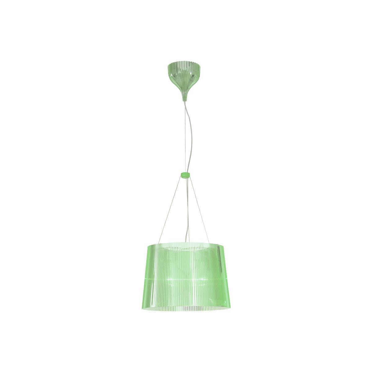 Gé is a new suspension of Ferruccio Laviani for Kartell. Essential, she is composed from a wide lampshade in polycarbonate to the wrinkled effect (diam 37 cm). Once lit, she is of a big wealth and offers extraordinary games of reflections, of light and of colors. She is set up to the ceiling with a decorated rosace that recalls by his form the lusters in glass of Murano. She is proposed in transparent or transparent colored (green, yellow, pink or blue sky). Gé has an elegant and warm soul. This one emanates effects of the transparency and of its tonalities tstrong and artificial that relate back to the delicacy of the colors of the art Deco and to the feminine faces of Erté. Exist equally in opaque version: white exterior - gold interior , exterior black - gold interior and exterior chrome - interior chrome.