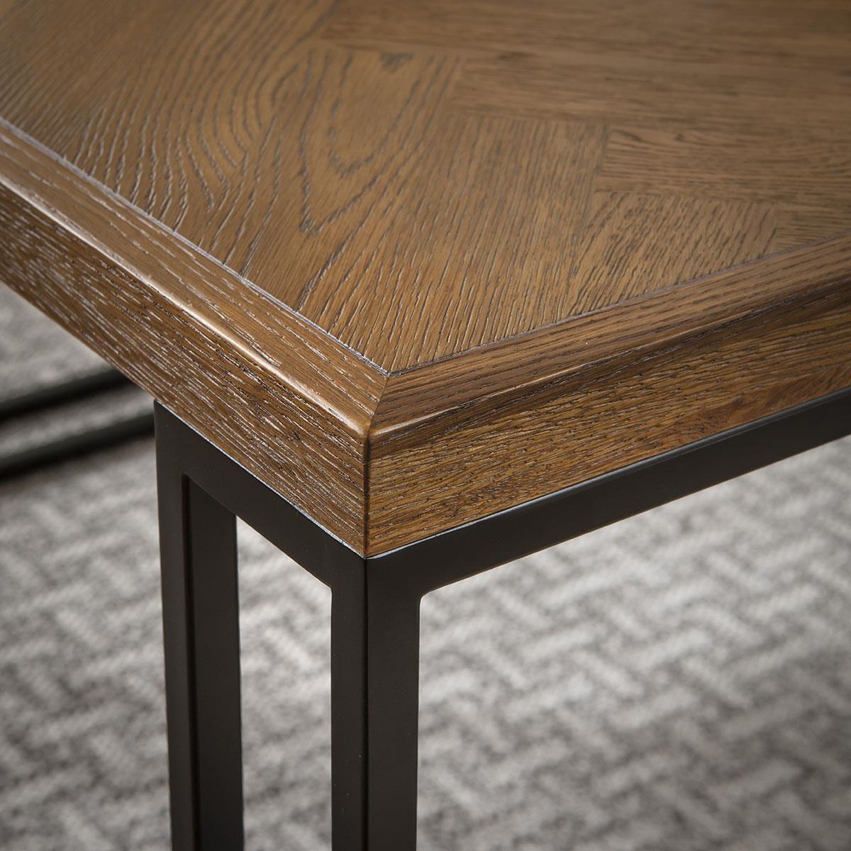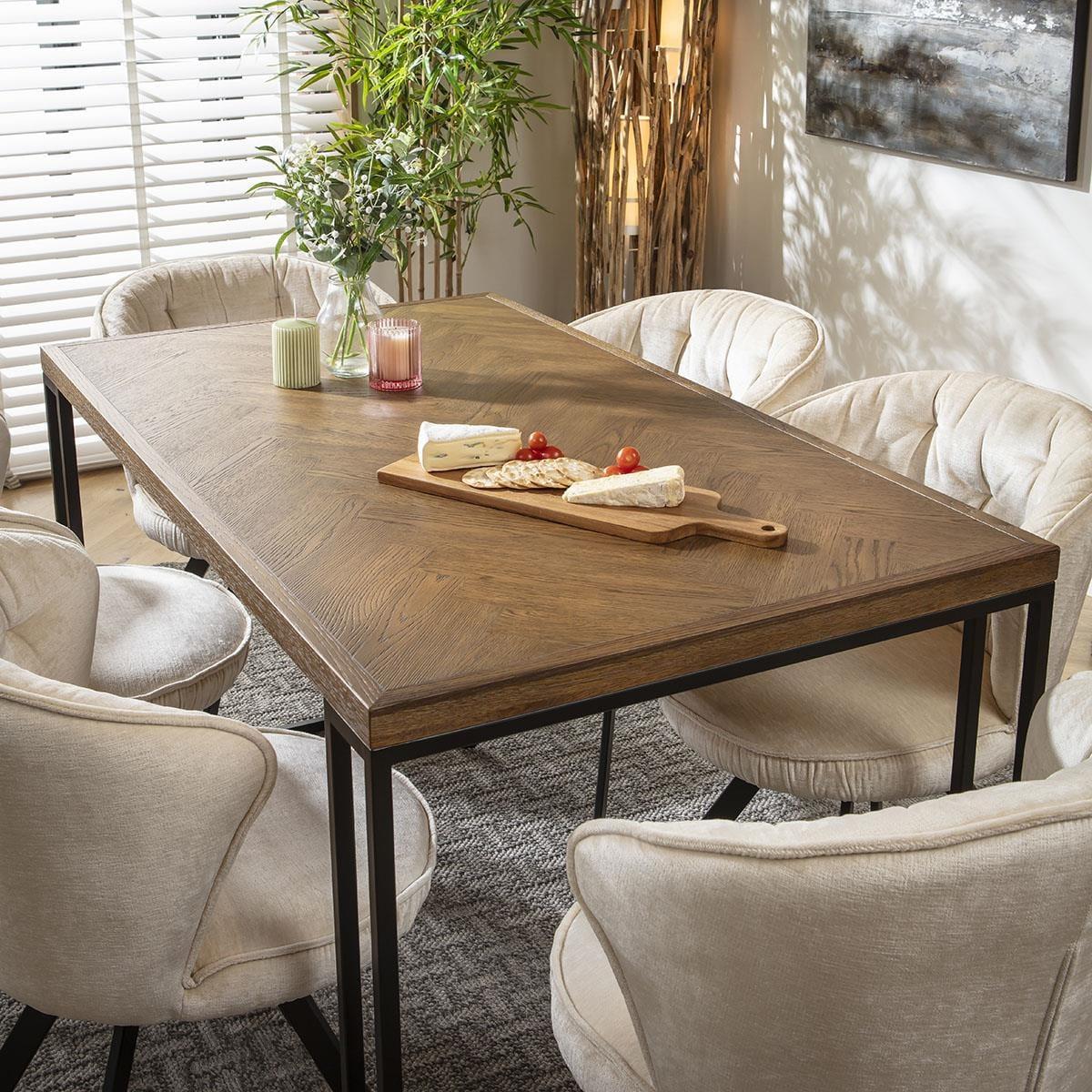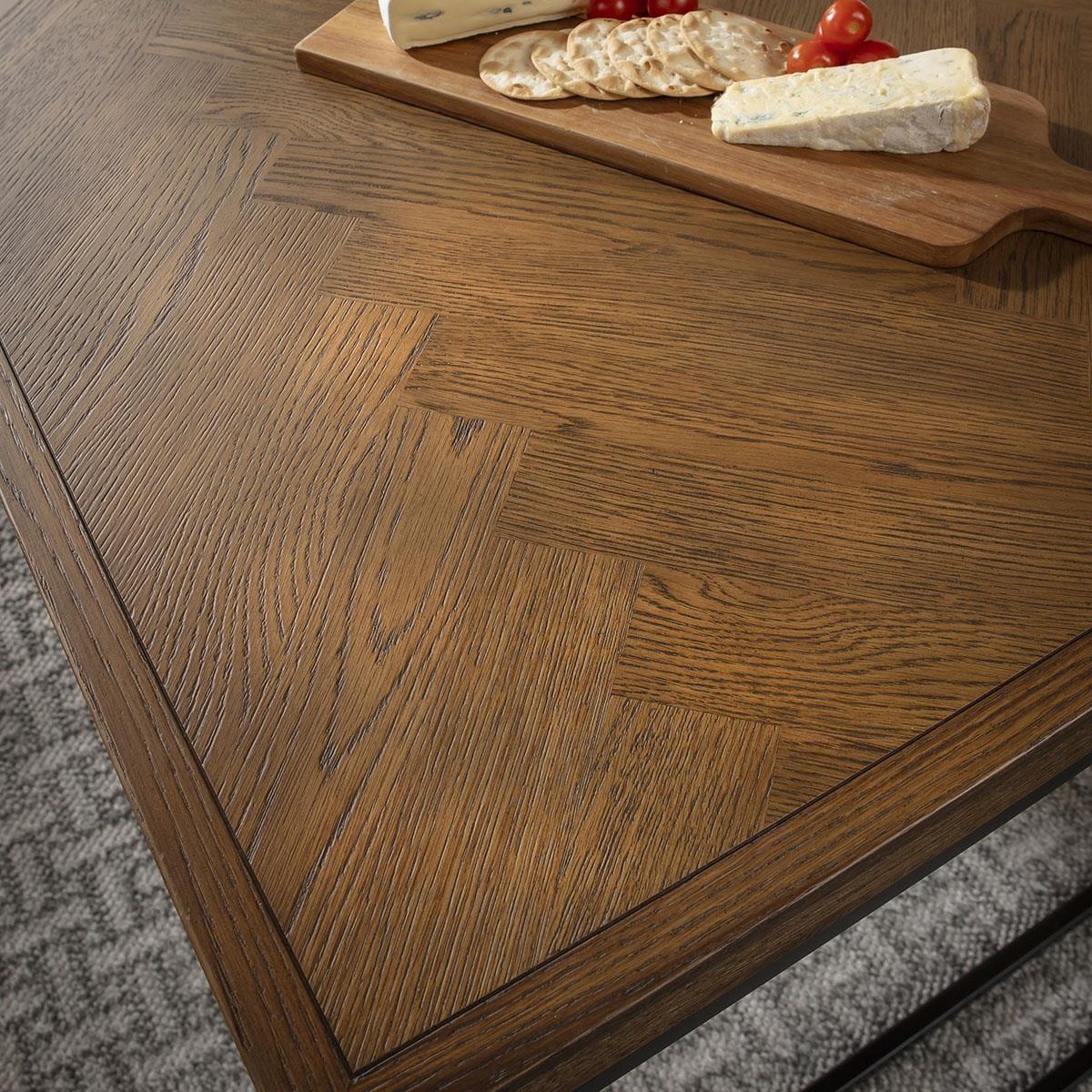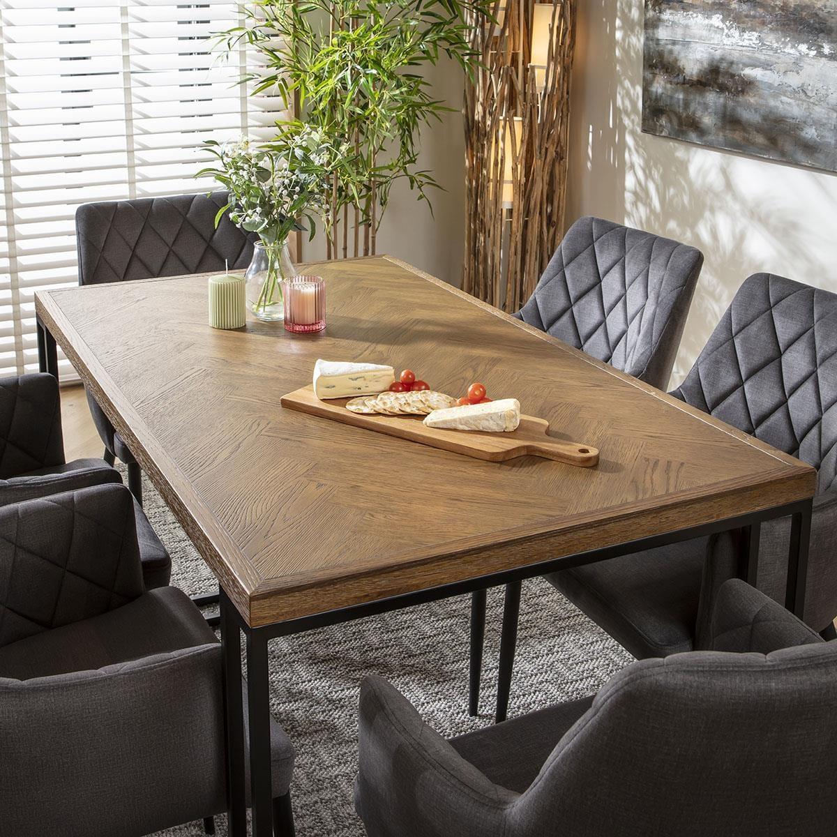 Enhance your space with this modern, industrial dining table for six, designed with a 140cm by 80cm size. A perfect dining table set for 6, its durable herringbone tabletop showcases a stylish stained finish atop black metal box frame legs. Ideal for modern, minimalist dining rooms with a touch of industrial flair. This 6 seater dining table is crafted for durability and style, blending modern minimalism with industrial strength. Black metal legs support each end, providing stability while maintaining a sleek, open feel. Its compact design fits seamlessly into dining rooms, offering a stylish yet functional centerpiece. The tabletops herringbone pattern, paired with a rich stained finish, adds visual interest and elegance to your space. Built with durability in mind, the 4cm thickness ensures lasting quality, making this industrial dinner table both practical and stylish Complete the look with the Gemini Collection. Each piece is designed to harmonise with this six seater dining room table, creating a cohesive, modern dining room setup with complementary modern tables for dining room settings. W140cm D80cm H78cm Solid Oak & Oak Veneer Easy to assemble - Simply attach the legs