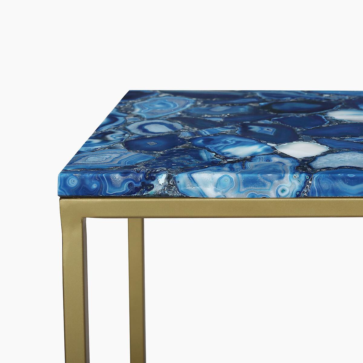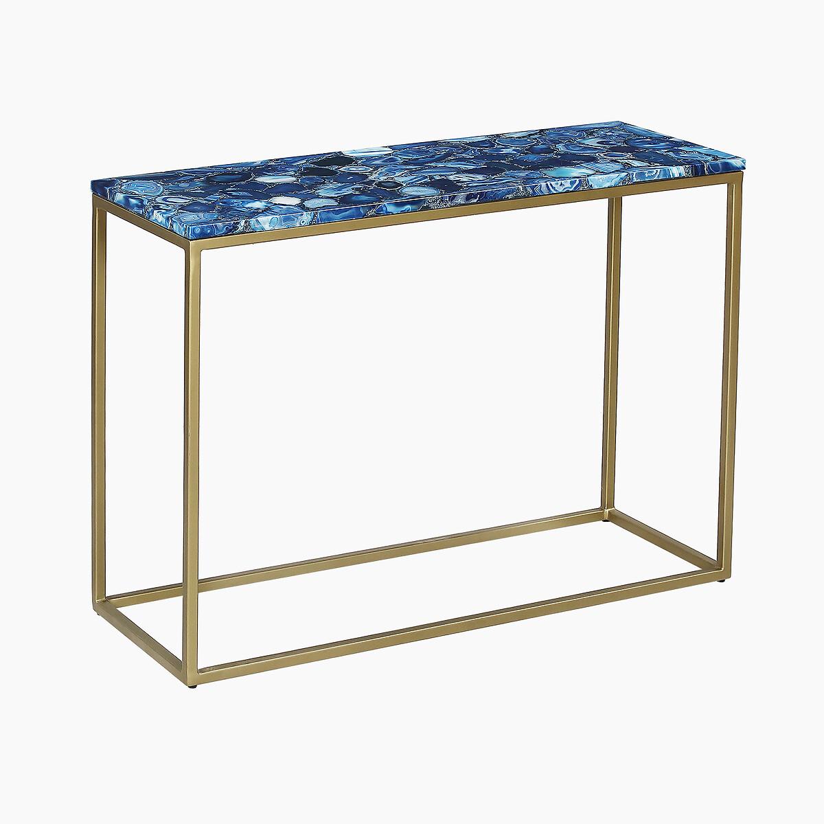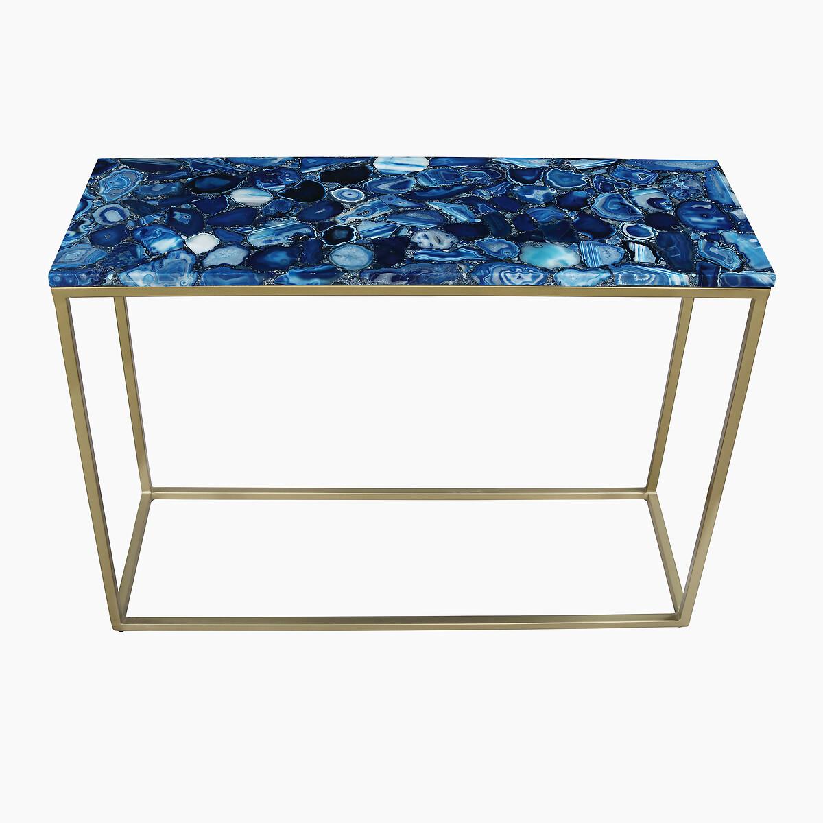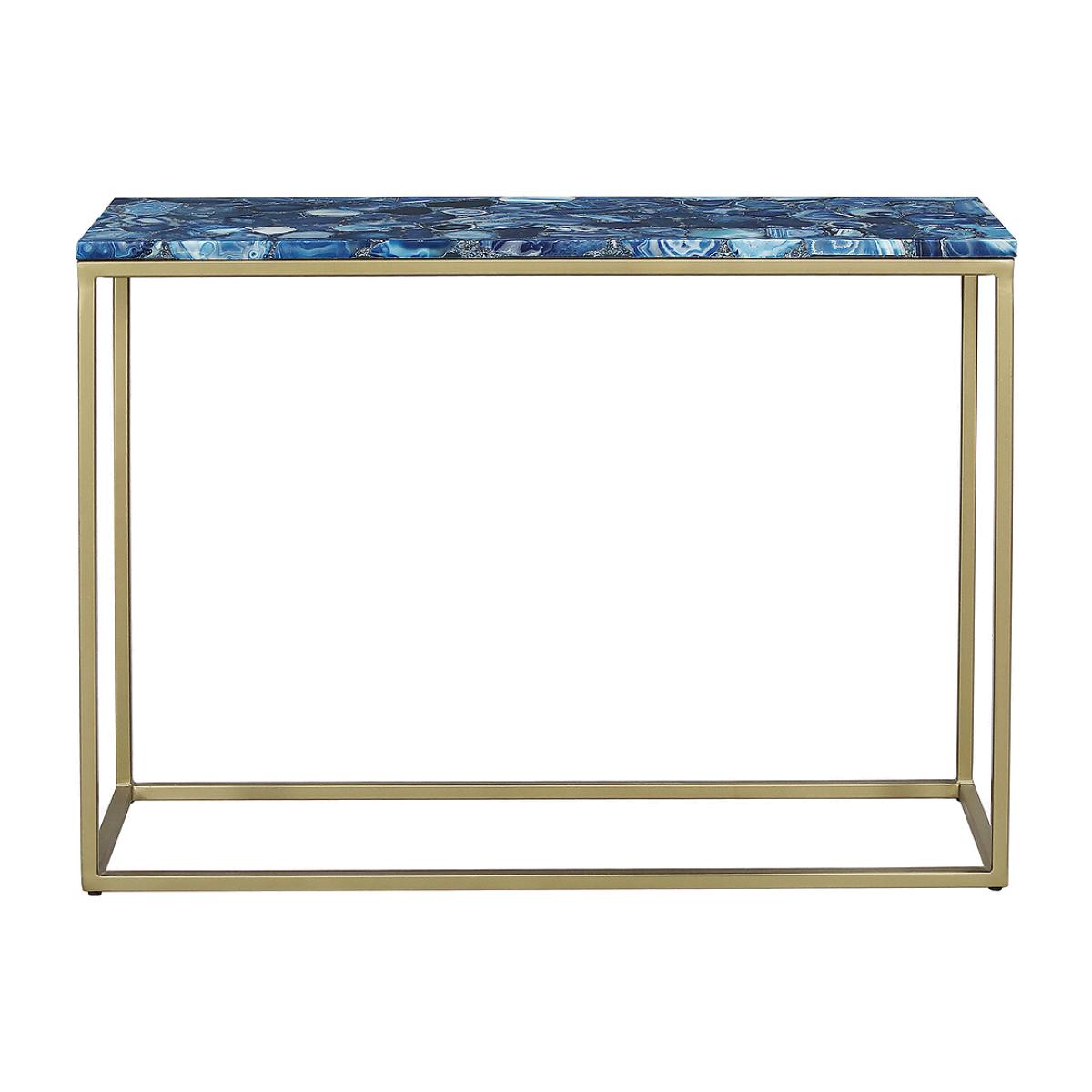 The Mylo console table commands attention with its effortlessly chic and understated design. Its rectangular agate tabletop captivates with a harmonious blend of earthy tones and calming blue hues, beautifully complemented by a sleek gold-finished iron frame. Versatile and elegant, this piece enhances any hallway, living room, or dining area with subtle sophistication. Product details• Agate tabletop• Gold iron frame• Delivered fully assembled. Product Composition - Agate,Metal. Product Dimensions - 107 cm x38 cm x77 cm , Weight - 27.6 KG• Clearance to floor: 72 cm Package Dimensions - 118 cm x 88 cm x 49 cm, Weight 33.86 kg. This product will be dispatched by one of our trusted suppliers. You’ll be contacted by their selected courier about your delivery.