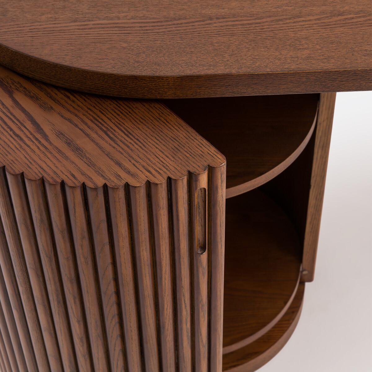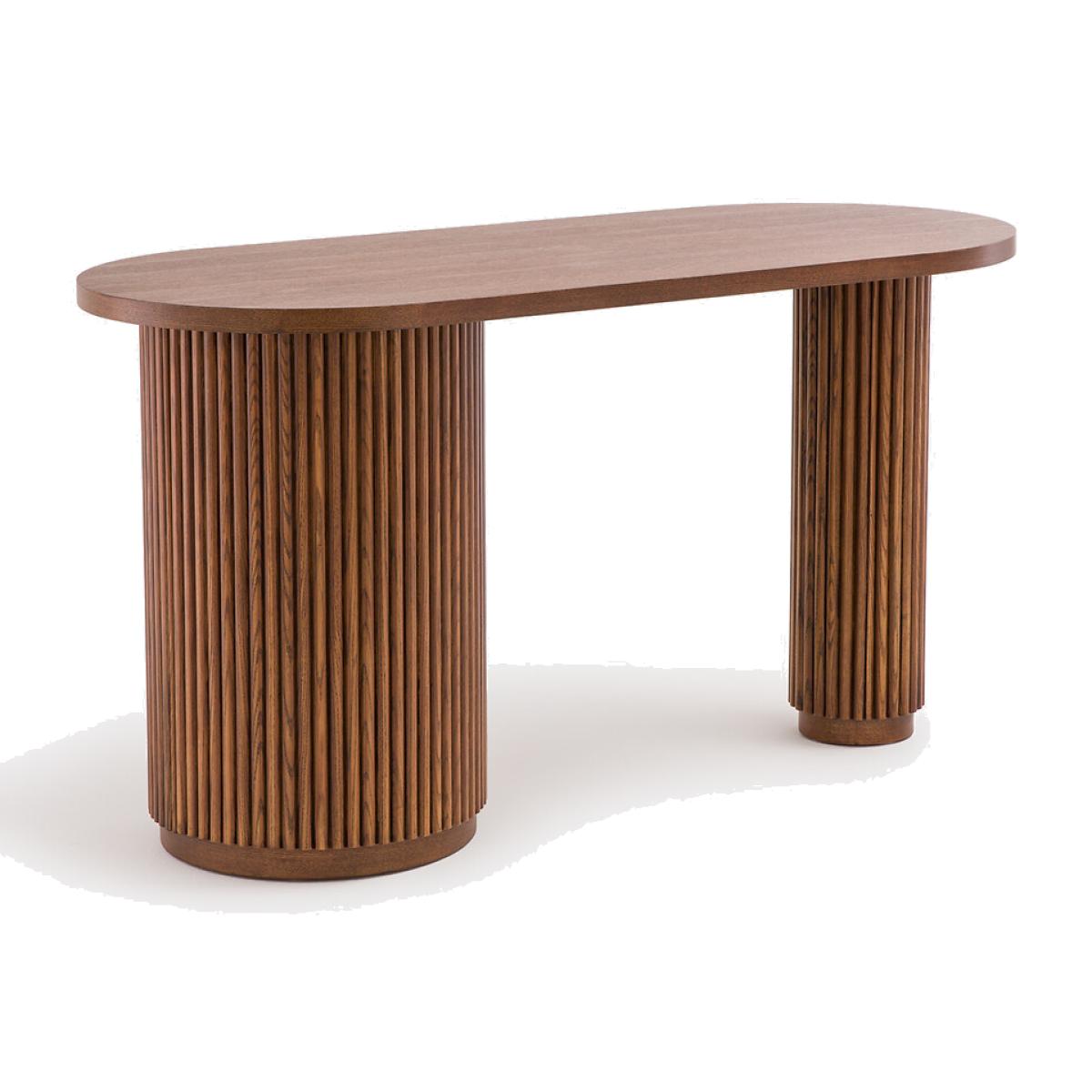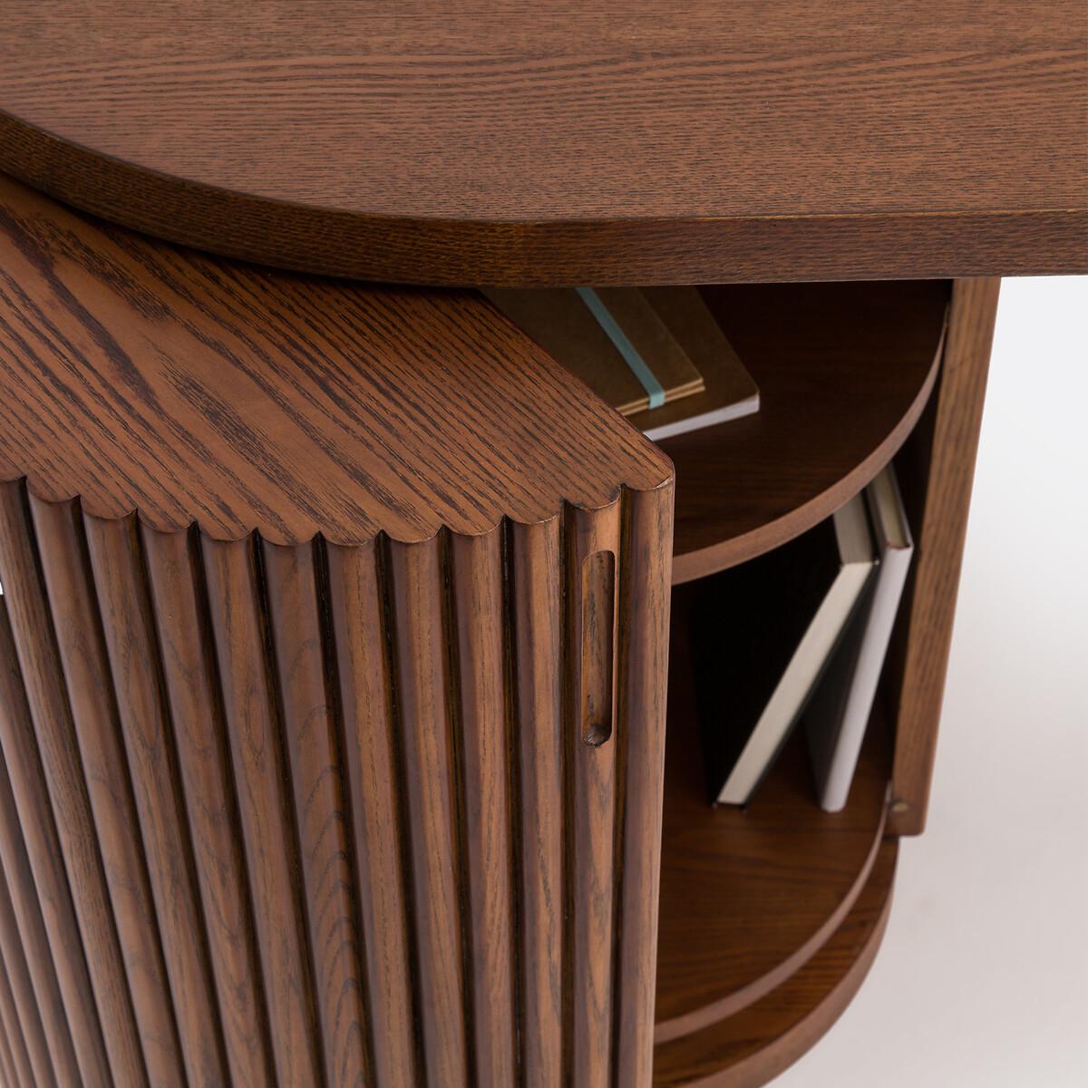 The Genna desk is part of the La Redoute Intérieurs Signatures collection. A selection of exclusive creations, designed by our in-house design studio. Inspiring, easy to live with, trendy... these products have become our customers' favourites. and no doubt yours!. In-house design by Adrien Etel:"An aesthetic that is as functional as it is elegant. A gently rounded line with atypical curves. Here is the Genna desk with its organically shaped top and its fluted base. Timeless and contemporary. You'd think that everything's got to be neatly tidied away... but then again...! The fluted base conceals the door, which opens onto a generous storage space. "Product Details • 1 door with 1 shelf inside (2 compartments) • Top in oak veneered MDF or walnut-stained, ash veneered MDF • Fluted base, semi-circular solid ash strips in oak or walnut stain • Nitrocellulose varnish finish • FSC® certified woodDimensions. Overall • Width: 140cm • Height: 76cm • Depth: 60cm • Weight: 49.3kg. Usable space • Interior compartment (upper): Diameter 40 x H23.5cm • Interior compartment (lower): Diameter 40 x H33.5cm • This product requires assembly. • WOOD FROM SUSTAINABLY MANAGED FORESTS. FSC® certified wood comes from forests that are environmentally, socially and economically well managed. Dimensions and weight of parcel • 3 parcels • L150 x H9.5 x D70cm. 18.6kg • L51.5 x H81.5 x D51.5cm. 27.2kg • L27 x H81.5 x D27cm. 11.5kg