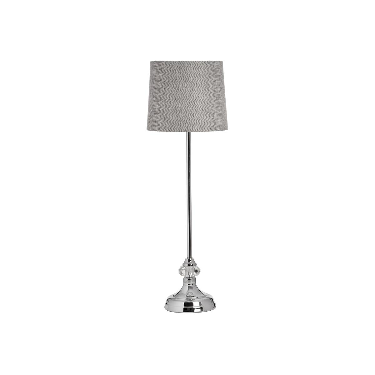 This is the Genoa Chrome Table Lamp. A lamp that displays understated luxury, featuring details such as chrome finishes, a grey and white herringbone shade and hand-cut glass at the top of the base. Timeless and classic, a piece that'll enhance existing interior and continue to over the years.