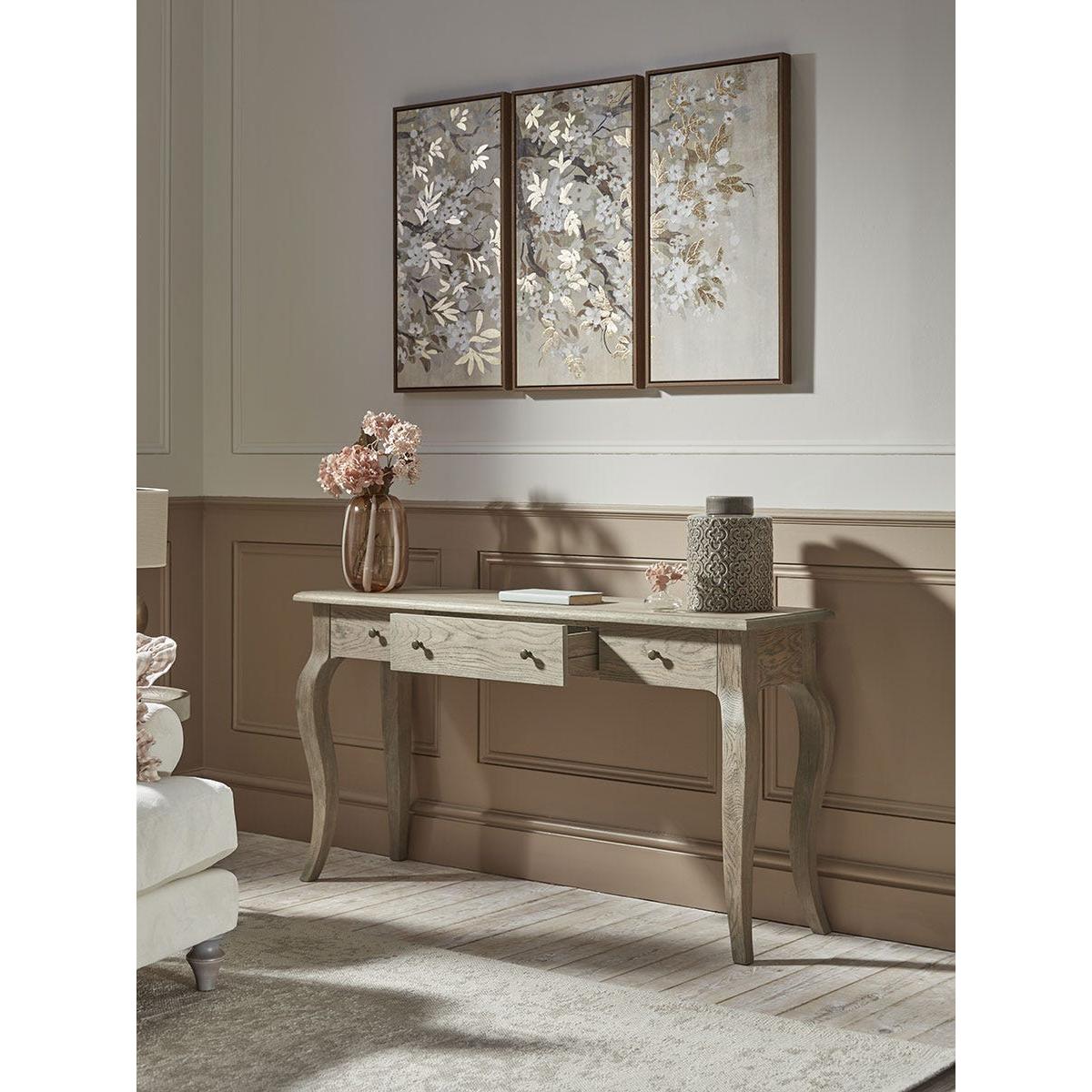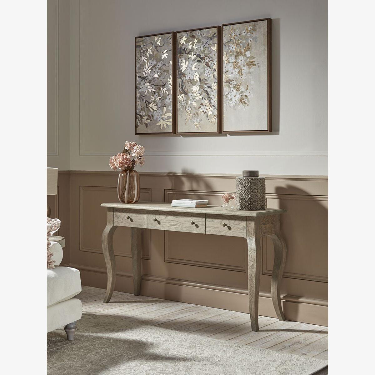 I’m a fan of the Genoa console for its gently aged timber finish and softly curving legs, which bring a subtle character without dominating a space. It sits beautifully in hallways, living rooms or even behind a sofa, especially in schemes leaning towards modern farmhouse, coastal or relaxed traditional styles. For styling, pair it with a large round mirror or a trio of framed prints above to add height and balance. Keep the surface simple - a slim ceramic lamp, a small stack of art books and a single sculptural vase or a low greenery pot. Use the twin drawers to stash keys and stationery out of sight, keeping the top neat and uncluttered.
