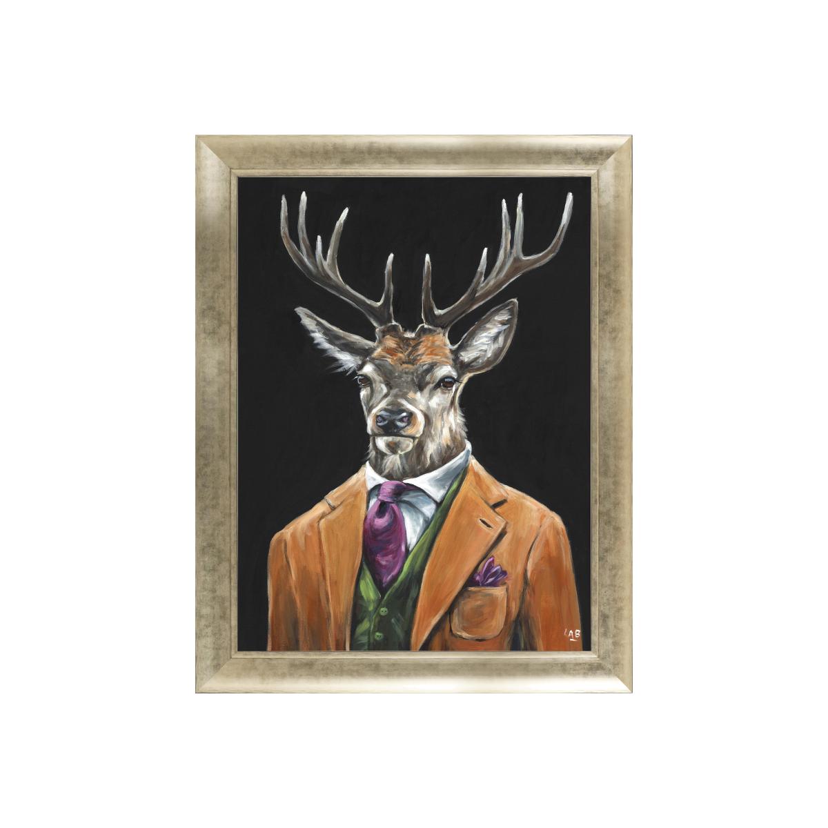 The best way to mount a stag on your wall is with this dapper chap. The Gentleman Stag Framed Art is most certainly a conversation starter. Why you'll love it. No aristocratic lineage? Borrow some of this fellow’s. Perfect for a feature wall, or hanging above an ornate fireplace. A rich, earthy palette and unique subject make this piece really stand out. Reproduced from original artwork by Louise Brown. Displayed in a gold frame, befitting of such a specimen. Hand finished with care for Furniture Village. What you need to know. A paper print on an MDF back board. Metal hanging fitting with a nylon cord. Hand-finished with an acrylic gel. Made in the UK. Dimensions. Width: 71 cm (28 in). Depth: 3 cm (2 in). Height: 91 cm (36 in).