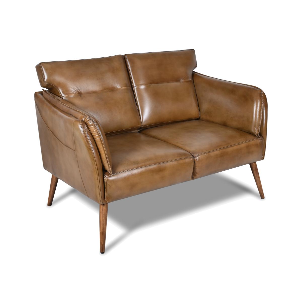 Introduce an effortlessly stylish focal point to your living space with this genuine brown leather two-seater sofa. Crafted for those who value both aesthetics and durability this piece showcases a refined mid-century modern silhouette. Its gently curved arms smooth leather upholstery and solid wooden legs deliver a vintage-inspired look with a contemporary twist.