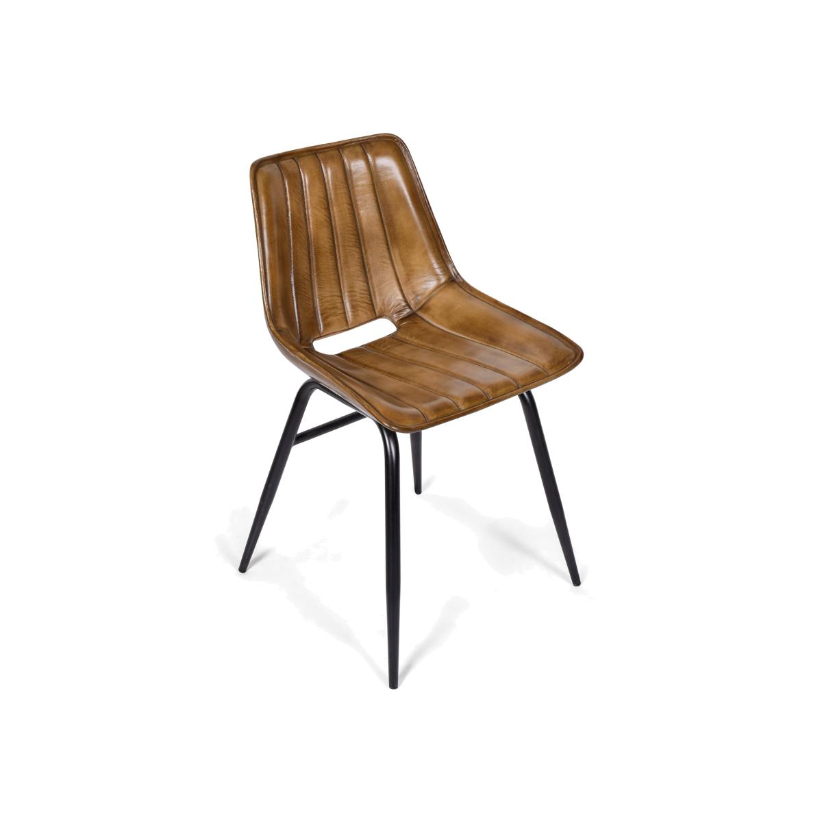 Upgrade your living or work space with our elegant brown genuine leather chair, combining premium craftsmanship with contemporary style. Designed for durability and visual appeal, this chair is a standout addition to any room from dining areas and offices to creative studios. Crafted from high-quality genuine leather, the seat features detailed vertical stitching that adds texture and sophistication. The warm brown tone enhances any decor, while the black metal legs provide a striking contrast and sturdy support. The ergonomically designed seat ensures comfort for extended use, and a chic cut-out design in the back adds an extra touch of style.