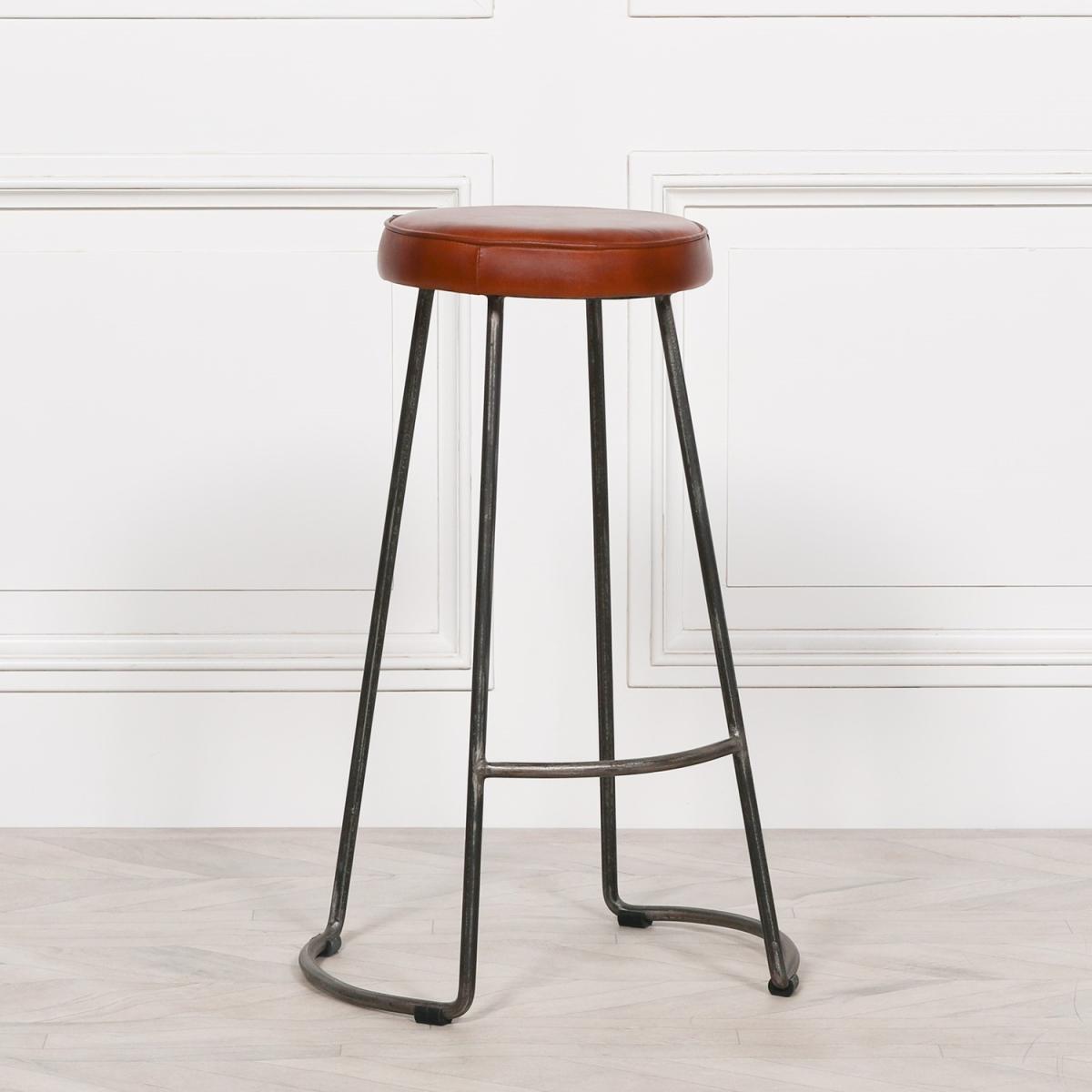 Industrial Style bar stool in vintage style. The product has genuine leather. Please note the bar stool design is industrial vintage and the leg frame is with distressed finish. Iron frame and genuine leather.