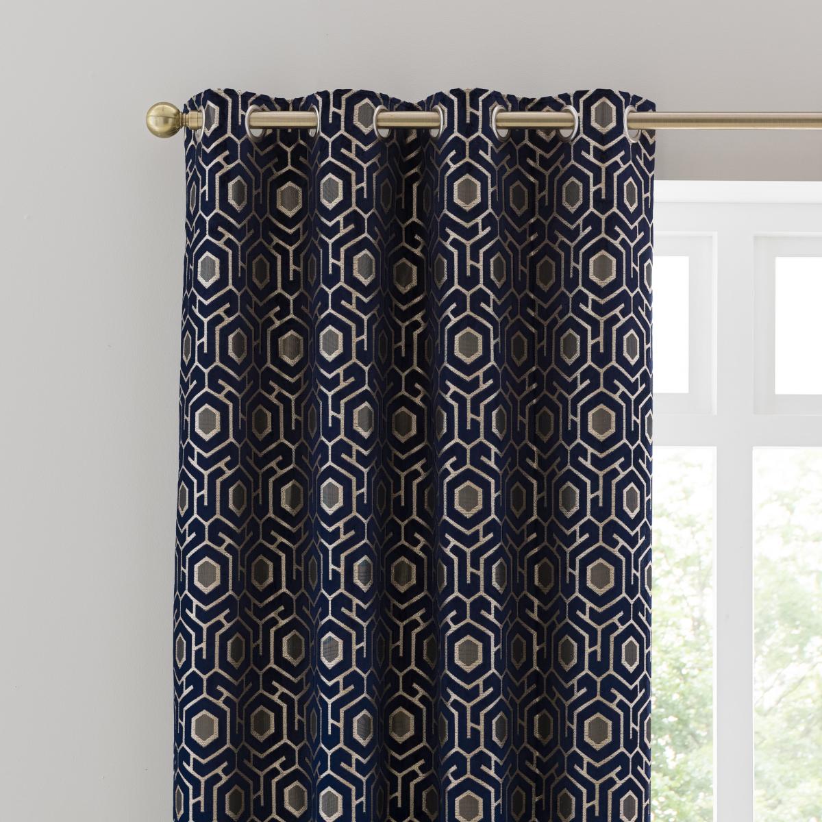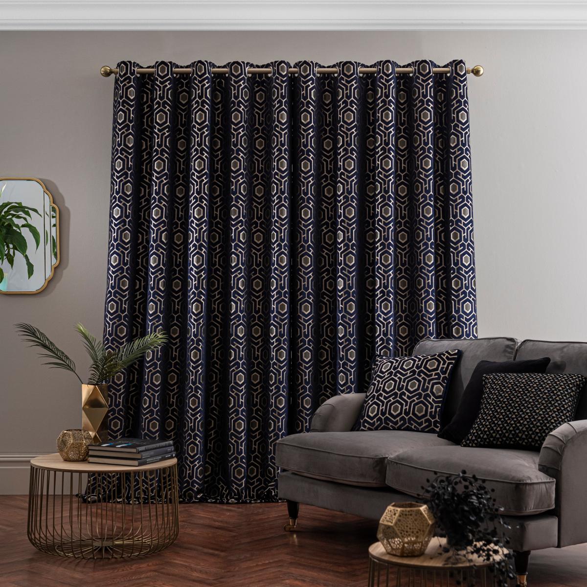 Fashioned in a sumptuous cut velvet, these luxurious curtain panels boast a woven geometric design in an opulent navy colourway. The rich golden yarns contrast beautifully with the deep velvet pile and adding textural depth to the contemporary geometric design. This Geo Cut Velvet pair of curtains exude elegance and beauty. The durable lining, woven from recycled polyester, will aid preserve the face fabric from fading allowing your curtains to stay beautiful. Finished with a durable, brushed steel eyelet header these curtains panels are easy to hang and simply glide across the curtain pole creating elegant folds. Coordinate your curtains with cushions in the matching design for stylish look to your room. Available in a large variety of sizes to suit your requirements. Please note:. Pattern matching can not be guaranteed across multiple pairs of curtains. This collection is verified by OEKO-TEX® and independently tested for harmful substances as well as manufactured using sustainable processes under socially responsible working conditions.