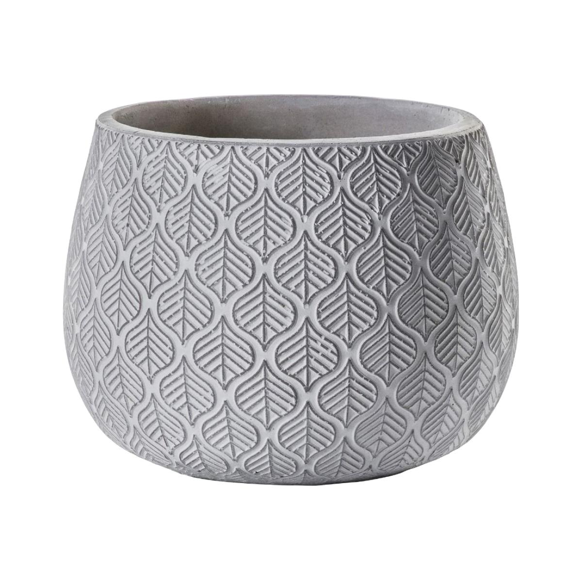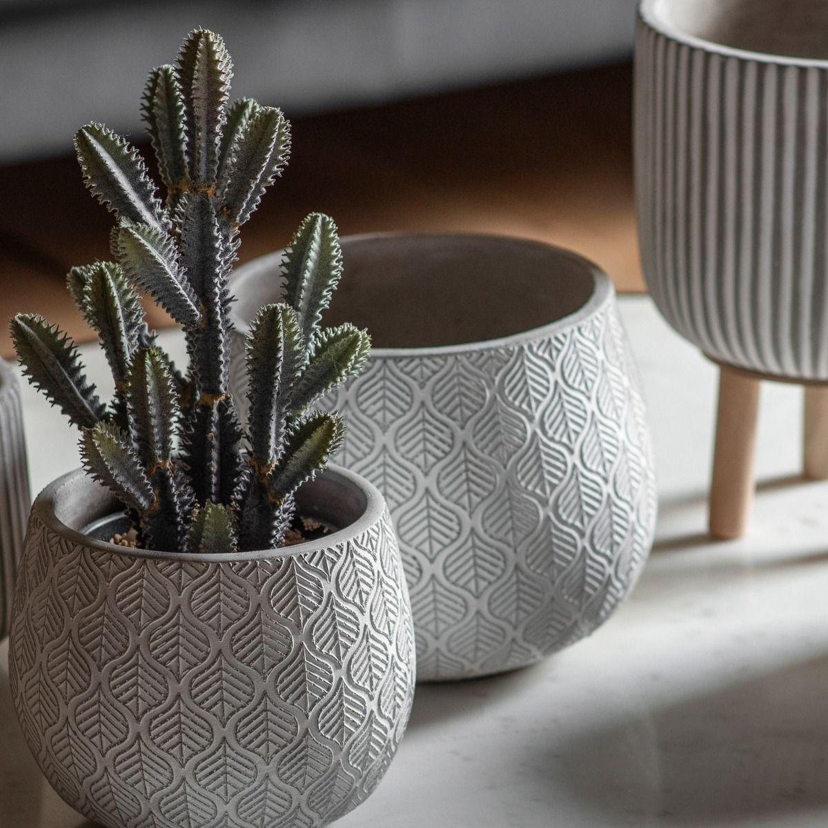 Trendy large planter featuring leaf print design. Add a trendy touch to your home with the Geo large leaf pot. Featuring a stone grey finish with leaf print design, this planter is ideal for use indoor use.