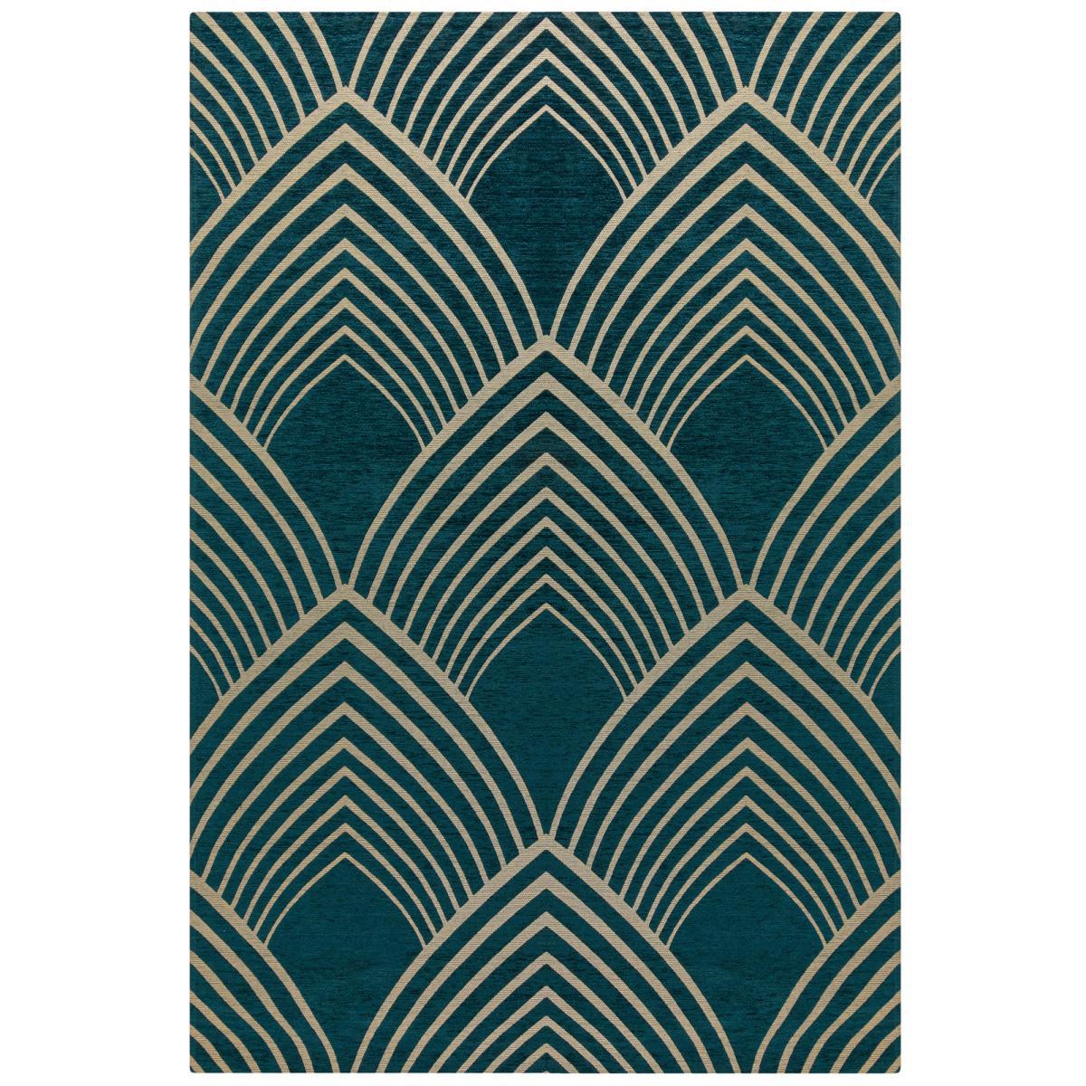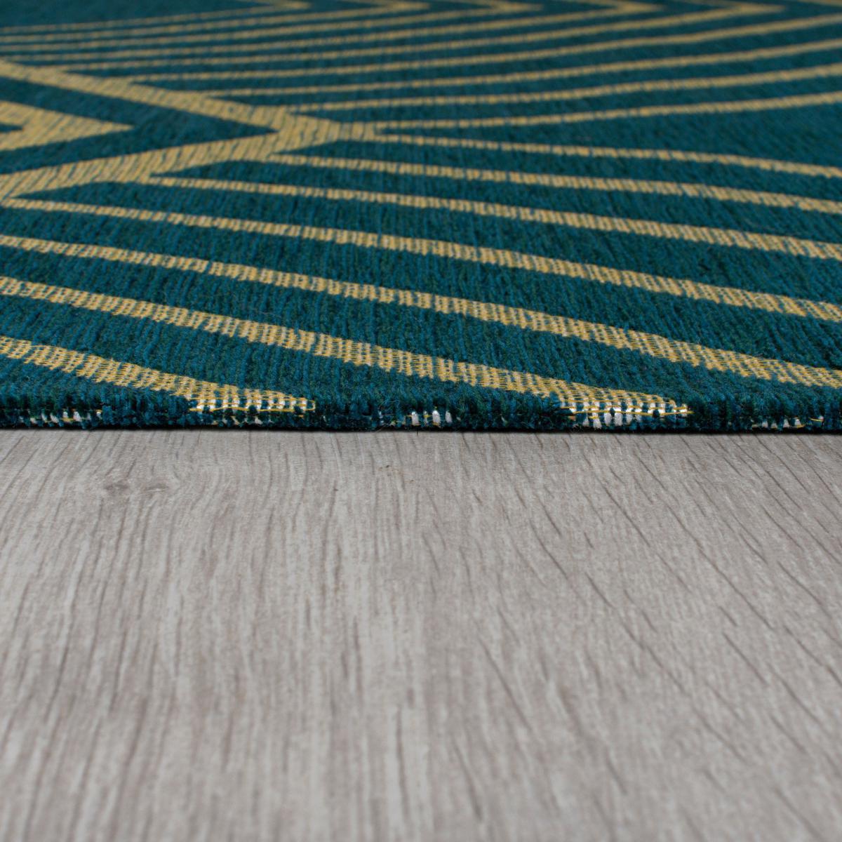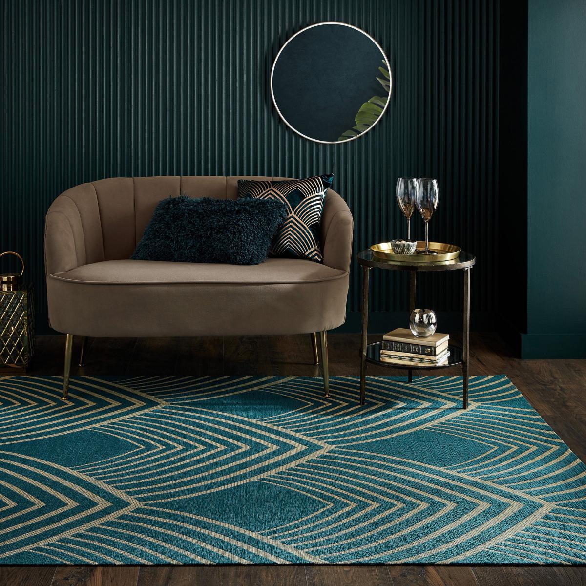 The Geo Metallic Rug pairs a peacock-inspired geometric design with a luxe palette of teal and gold, ideal for adding Art Deco-inspired style to your space. The flat blended composition makes the Geo Metallic Rug the ideal rug for high-traffic areas and sitting under furniture. We love using the Geo Metallic Rug in dining spaces to define a central socialising spot, or to add a luxurious look to your living space. Re-roll your rug pile out for 24 hours to reduce curling. Regularly turn to ensure even wear. An anti-slip mat will help prevent slipping. Blot spills immediately with a clean, dry white cloth. Do not rub. Do not place this rug near an open fire. Please do not leave children or infants unattended.