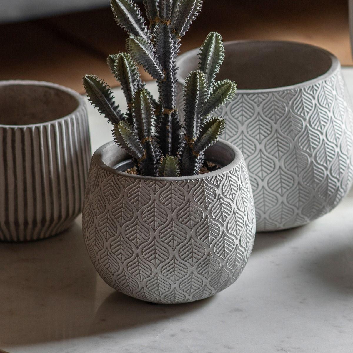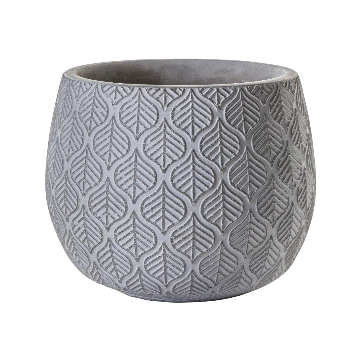 Trendy small planter featuring leaf print design. Add a trendy touch to your home with the Geo large leaf pot. Featuring a stone grey finish with leaf print design, this planter is ideal for use indoor use.