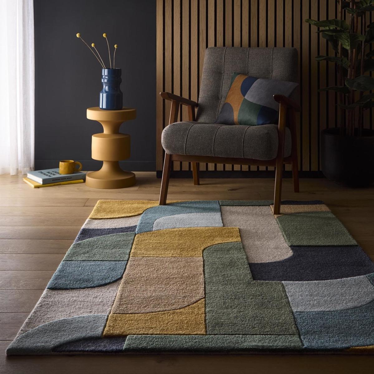 Featuring a striking interplay of curved and carved shapes, this rug blends 70s nostalgia with a modern edge—perfect for design-forward interiors. Earthy ochres, deep blues, muted greens, and soft greys work harmoniously to create a warm, contemporary statement piece. Crafted from 100% wool with detailed carving, the raised texture enhances visual interest while providing luxurious softness underfoot. Wool’s natural insulating properties and resilience make this rug both cosy and long-lasting, ideal for high-use areas like living rooms or home offices. More than just a floor covering, this design doubles as a work of art—adding personality and sophistication to any space. Origins Retro Deco Blue is a bold statement rug that merges artistic flair with luxurious comfort. Featuring a striking mix of curved, carved shapes in deep blues, rich greens, soft greys, and warm ochres, this design evokes a retro-modern aesthetic perfect for eclectic or contemporary interiors. Crafted from 100% wool, it offers a naturally soft, insulating texture underfoot, while the sculpted surface adds depth and dimension. Whether placed in a living room or under a dining table, this rug instantly transforms your space into a design-led sanctuary with a vibrant, mid-century-inspired twist. We are only able to ship this product to UK Mainland postcodes. We are unable to ship to Ireland, Northern Ireland, Scottish Highlands, or the Channel Islands. Dimensions:H170 x W120 cm Shape: Rectangular Colour: Multi coloured Pattern: Plain Fabric composition: 100% Wool