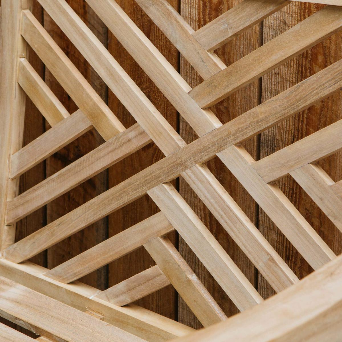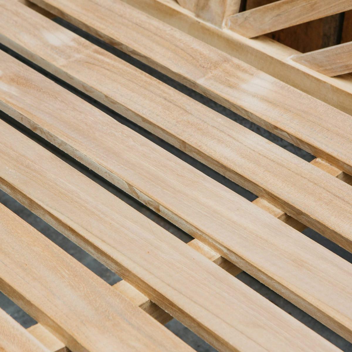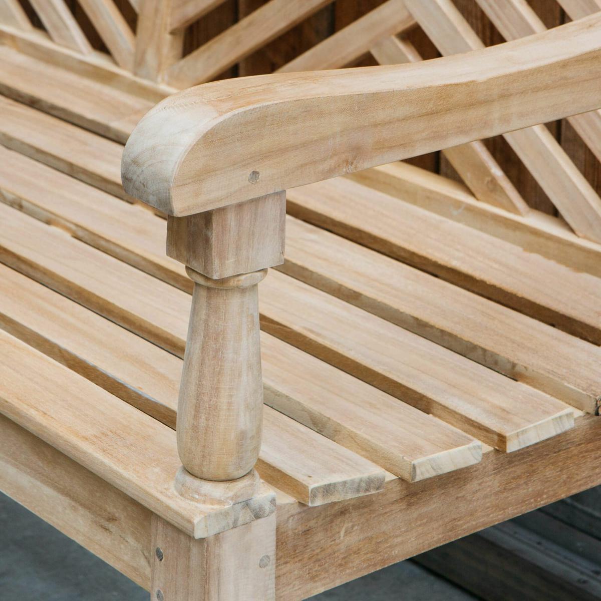 A teakwood garden bench with a geometric cross design back, a stylish addition to your outdoor area.