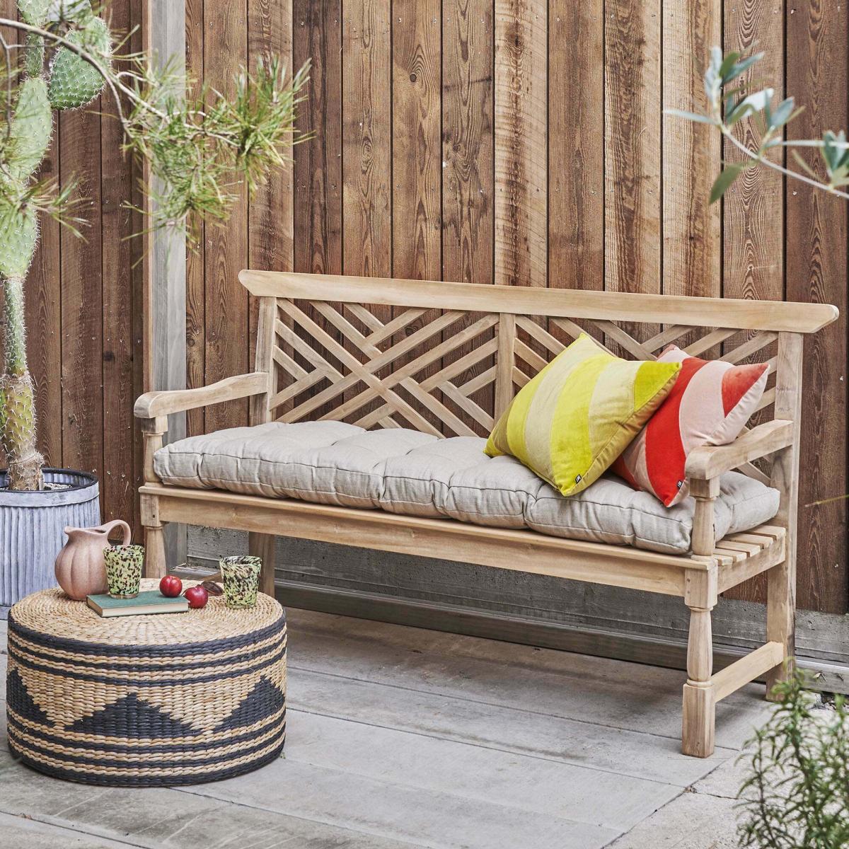 I love this bench for its clean, geometric lines that add a contemporary edge to outdoor spaces. It works well in both traditional and modern gardens, providing a versatile focal point or functional seating. To style it effectively, consider layering with cushions in contrasting colours or patterns to soften the wood and create a cosy vibe. Pairing it with potted plants or hanging greenery can enhance its natural appeal, making it suitable for relaxed garden settings or even a sunny balcony corner. Practical tip: use weather-proof cushions to extend its usability and protect it from the elements.