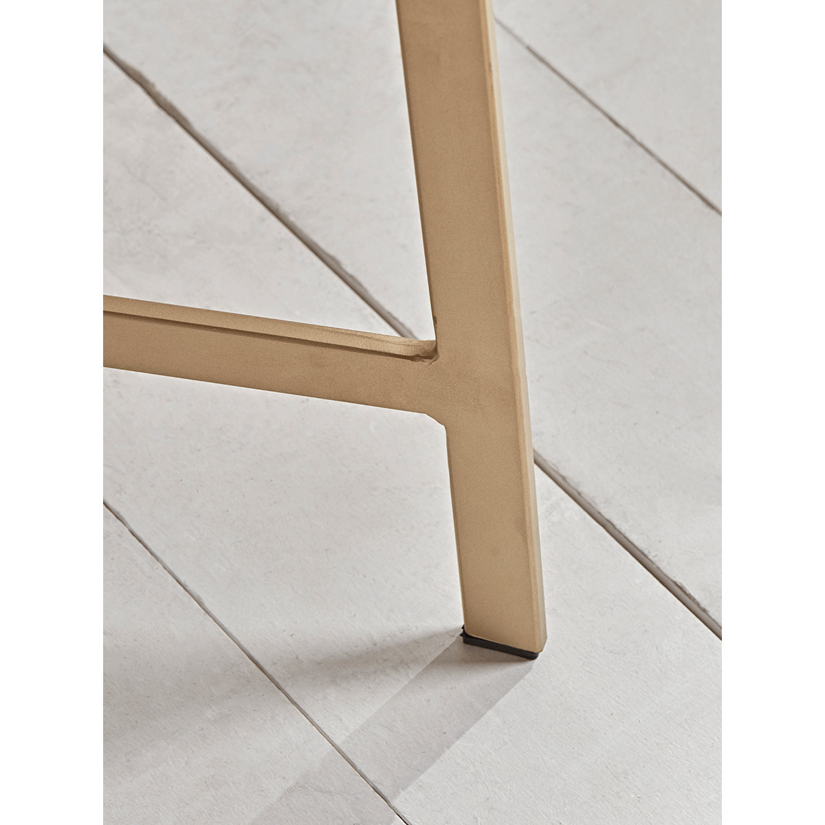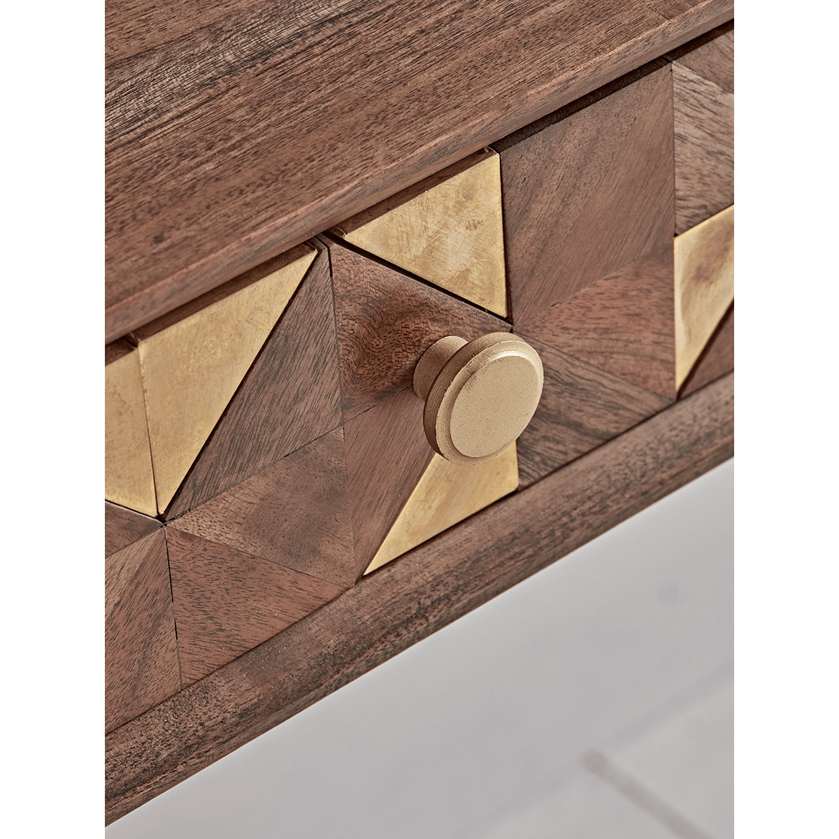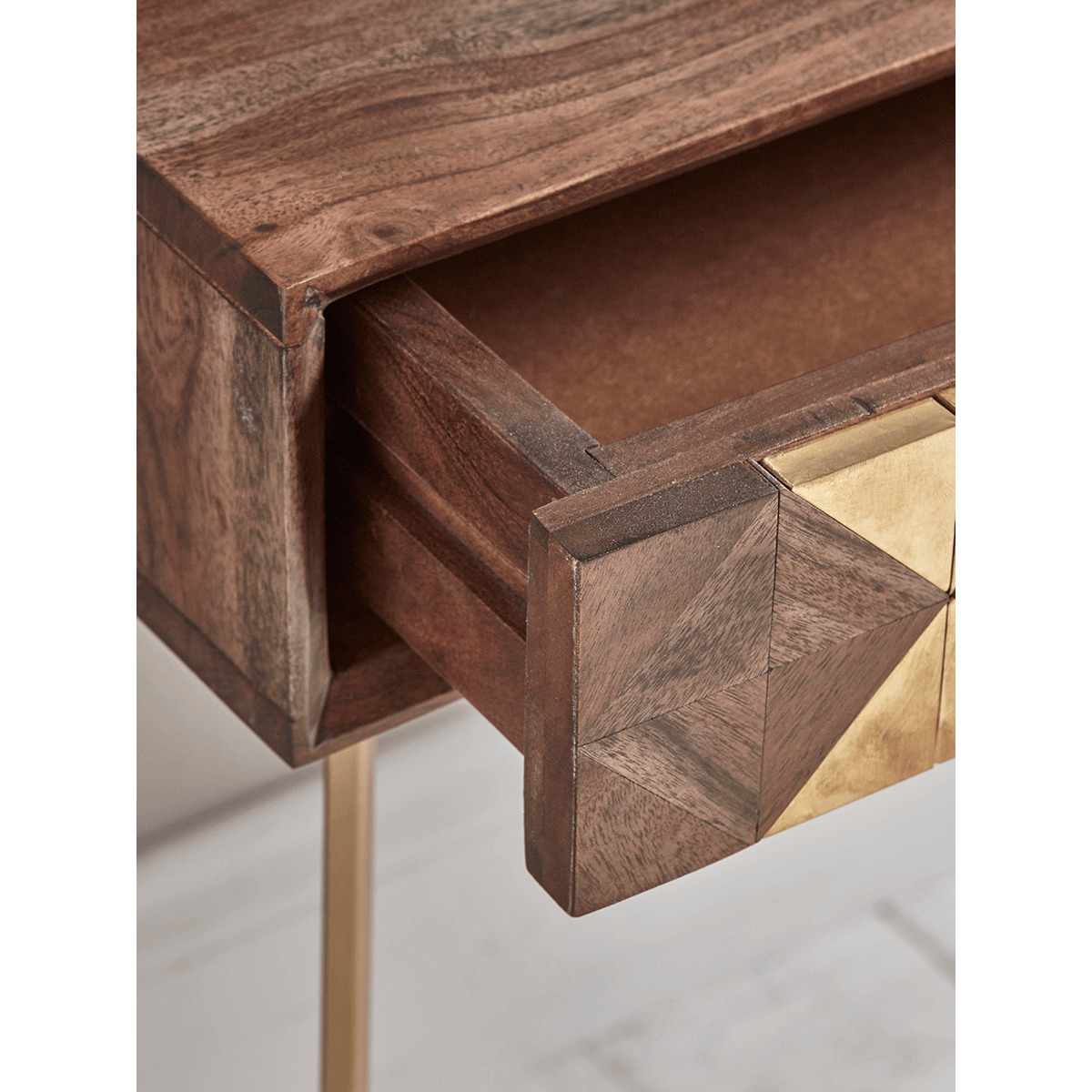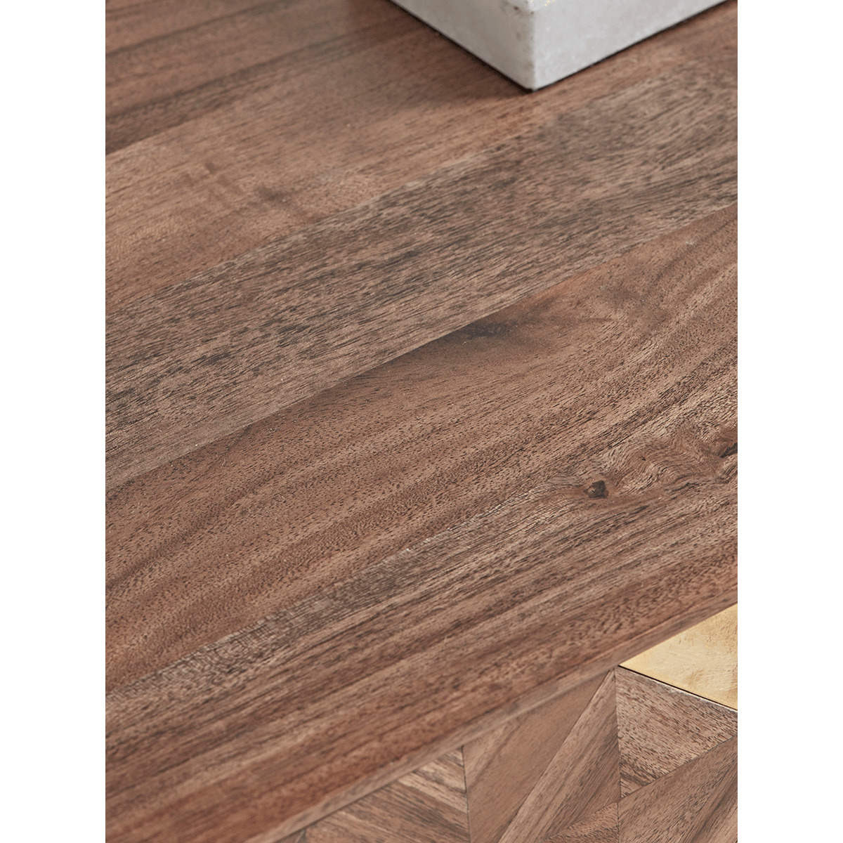 A unique piece with striking decorative detail by a geometric pattern to the surface of the wood, highlighted beautifully by inlaid brass detail. The brushed brass highlights the acacia wood grain beautifully and links to the brass finished frame and hardware, pulling together the design for a statement look. Two drawers front the piece, a home for your keys, gloves, loose change - anything you wish to have ordered away as youre welcomed home./p>;Pair with our Geometric Inlay Sideboard to continue the style.