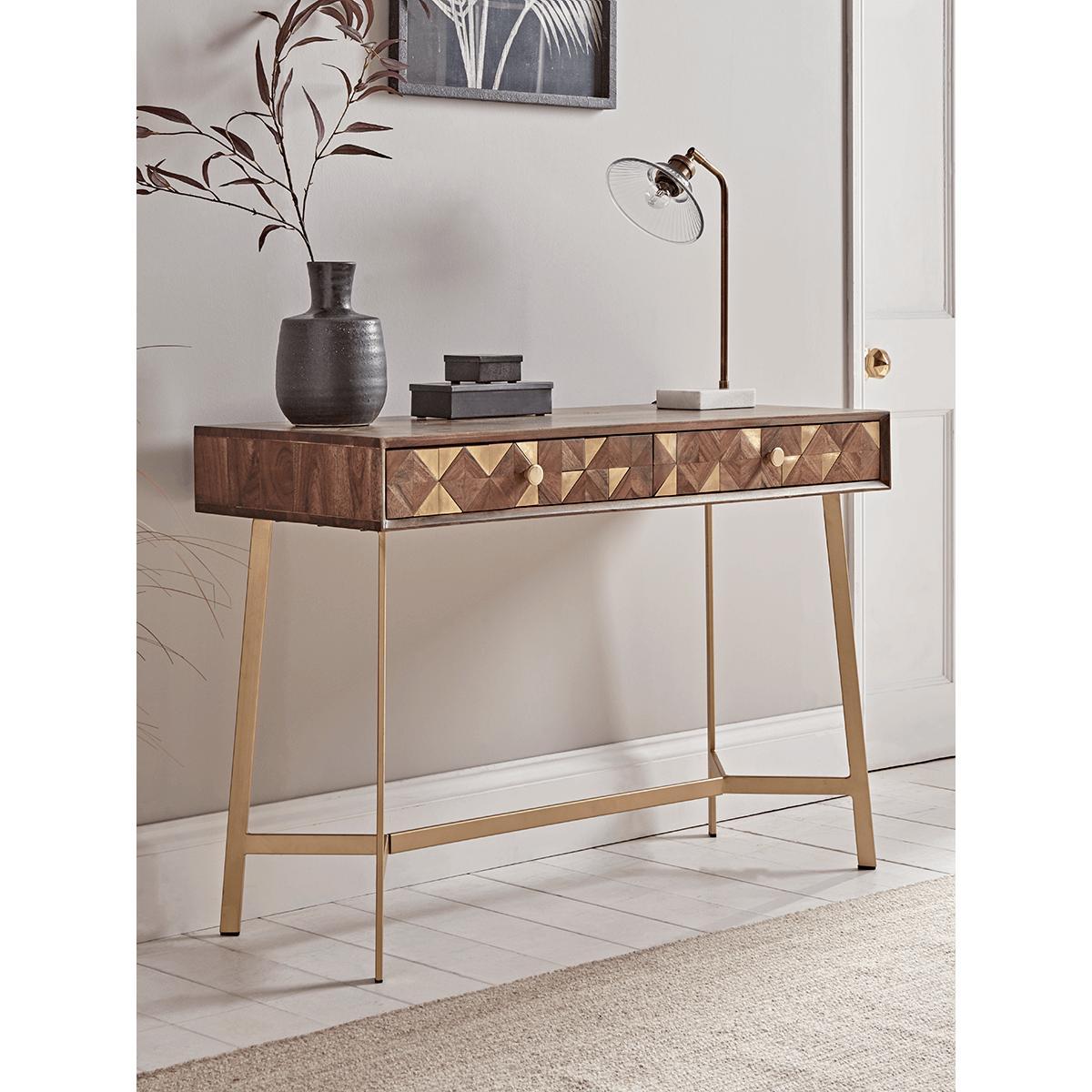 A unique piece with striking decorative detail by a geometric pattern to the surface of the wood, highlighted beautifully by inlaid brass detail. The brushed brass highlights the acacia wood grain beautifully and links to the brass finished frame and hardware, pulling together the design for a statement look. Two drawers front the piece, a home for your keys, gloves, loose change - anything you wish to have ordered away as youre welcomed home. /p>. Pair with our. Geometric Inlay Sideboard. To continue the style.