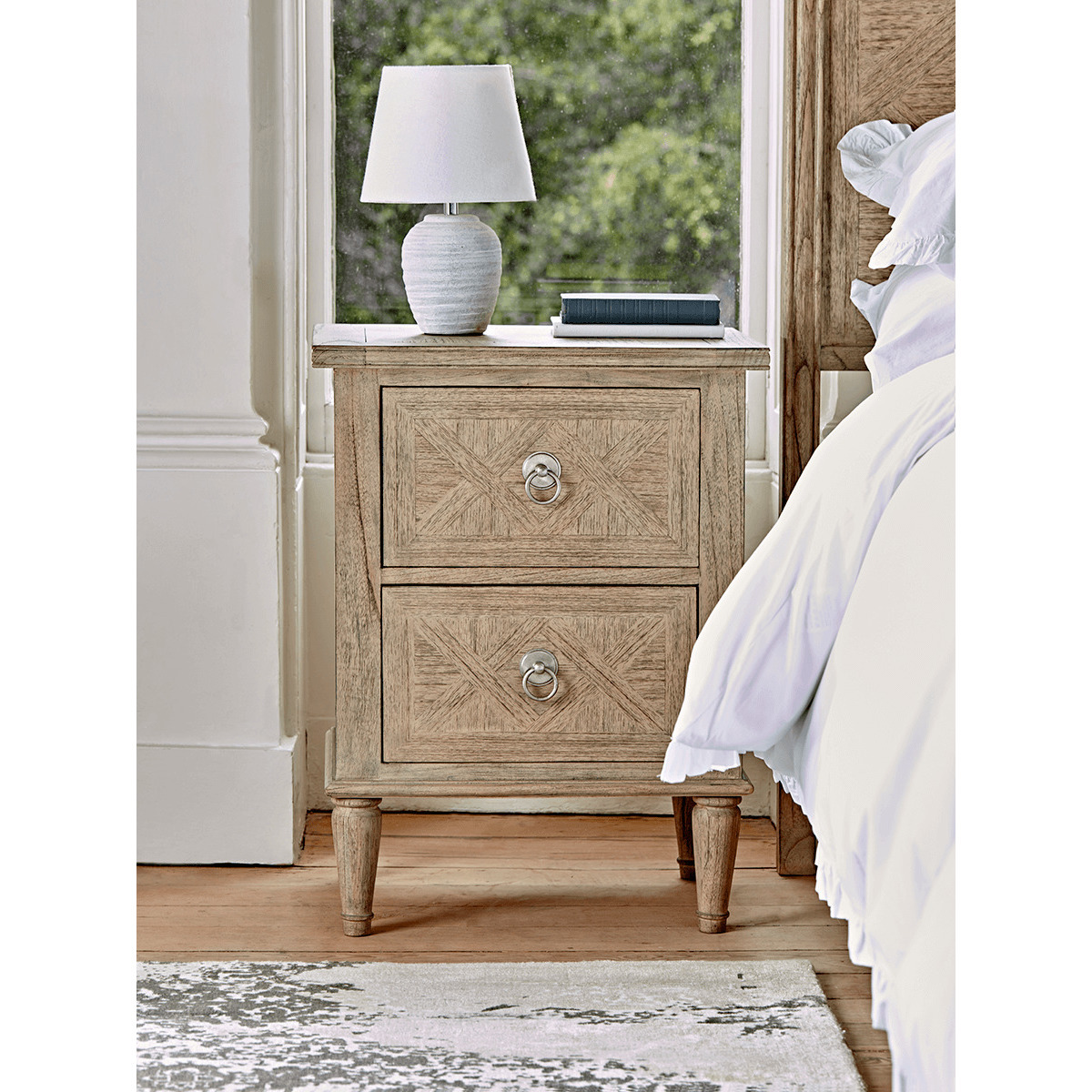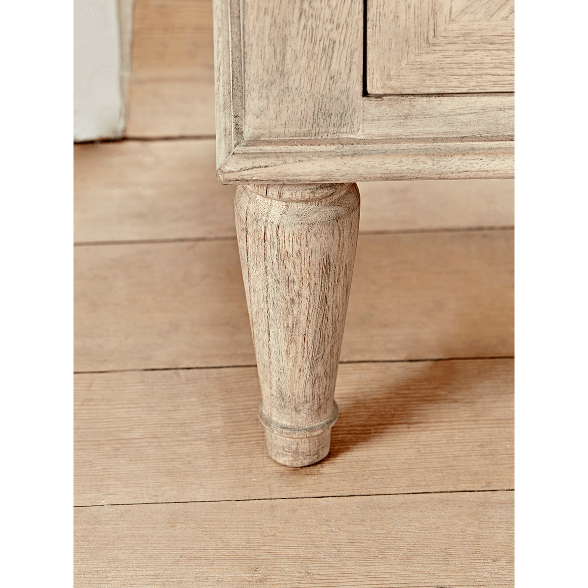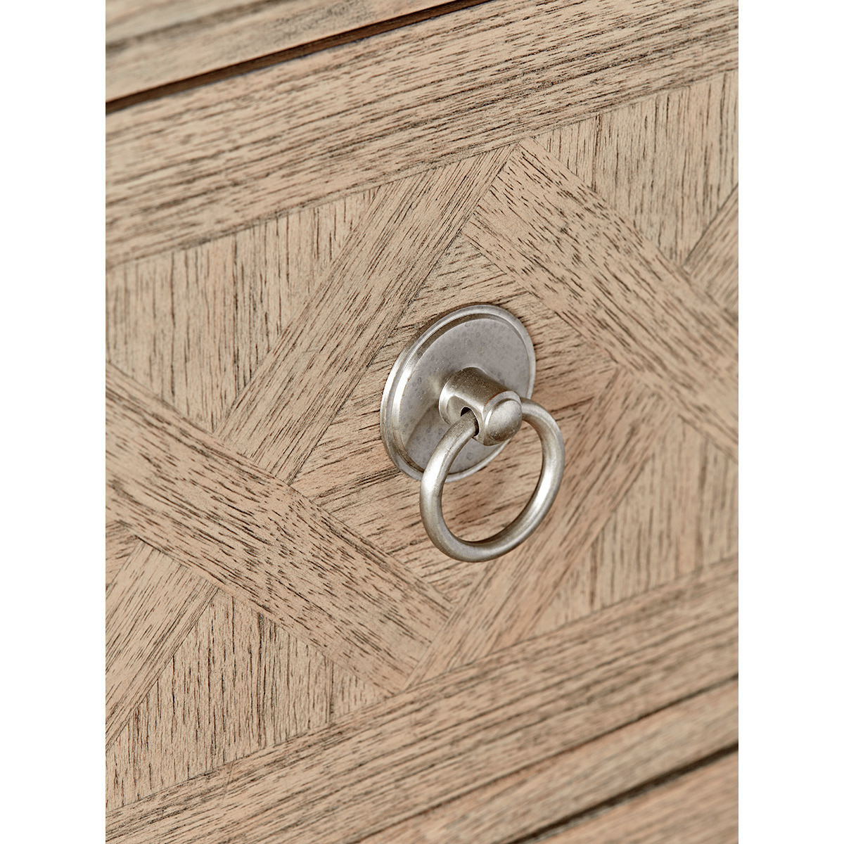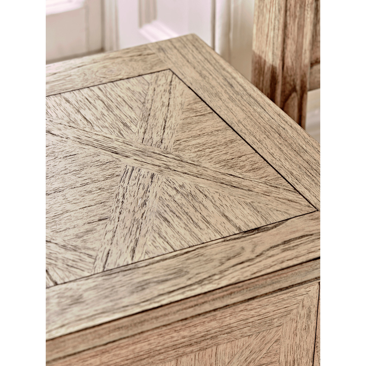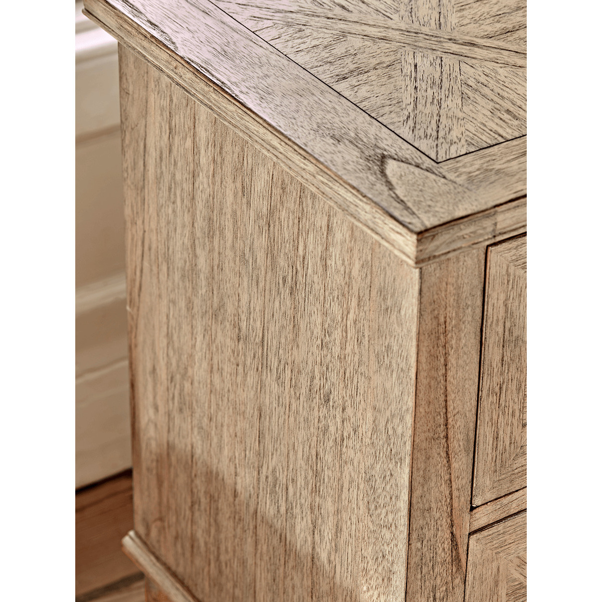 The mindi wood of our Geometric Parquet Bedside Table has a gently brushed finish to give it a coastal feel. A piece of furniture that, with its geometric design, has an elegant, almost stately quality. Traditional ring pull hardware and decorative turned wood legs finish the decorative elements of our bedside table. Explore the complete Geometric Parquet range.