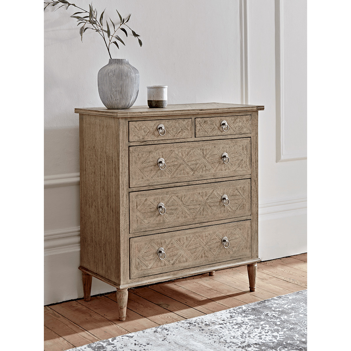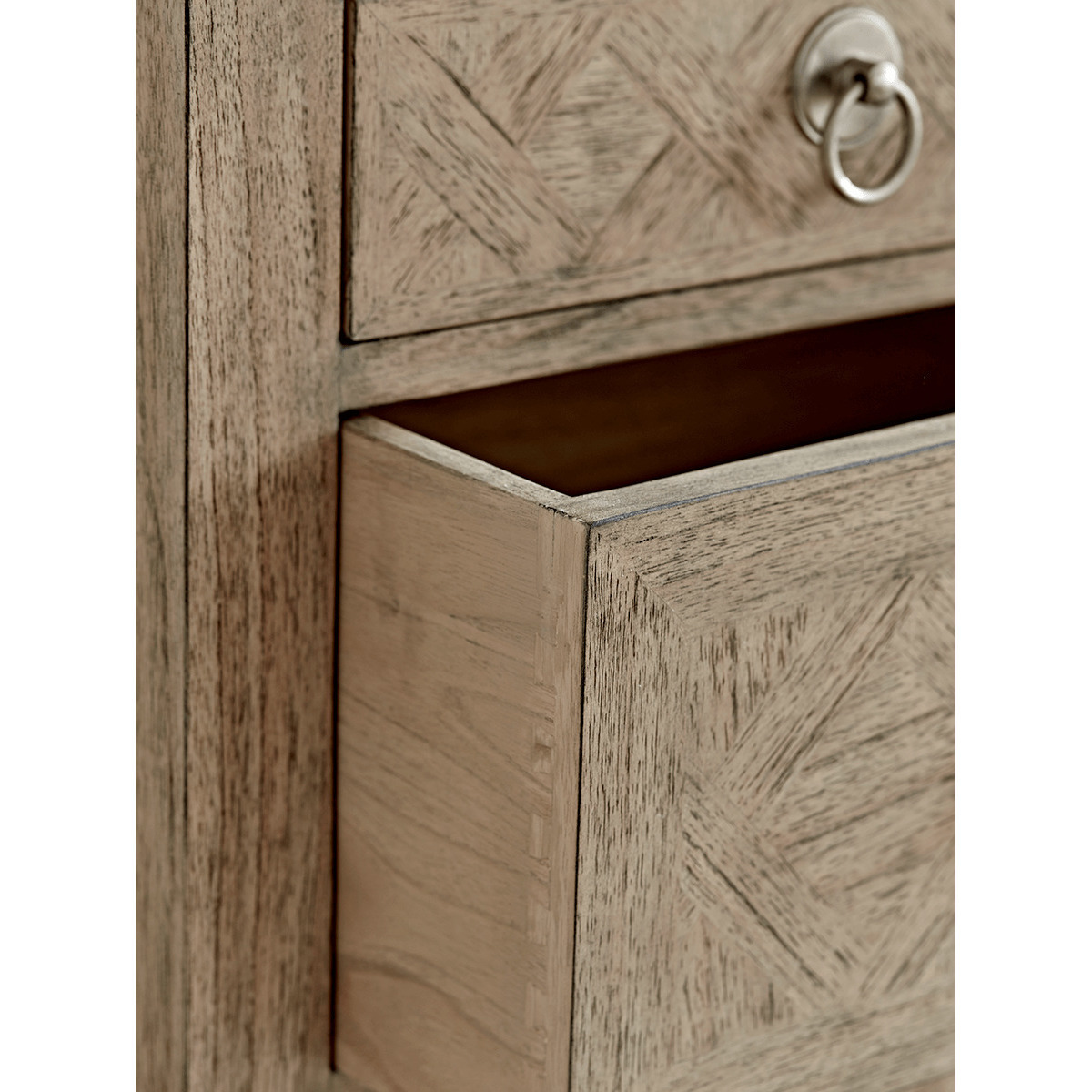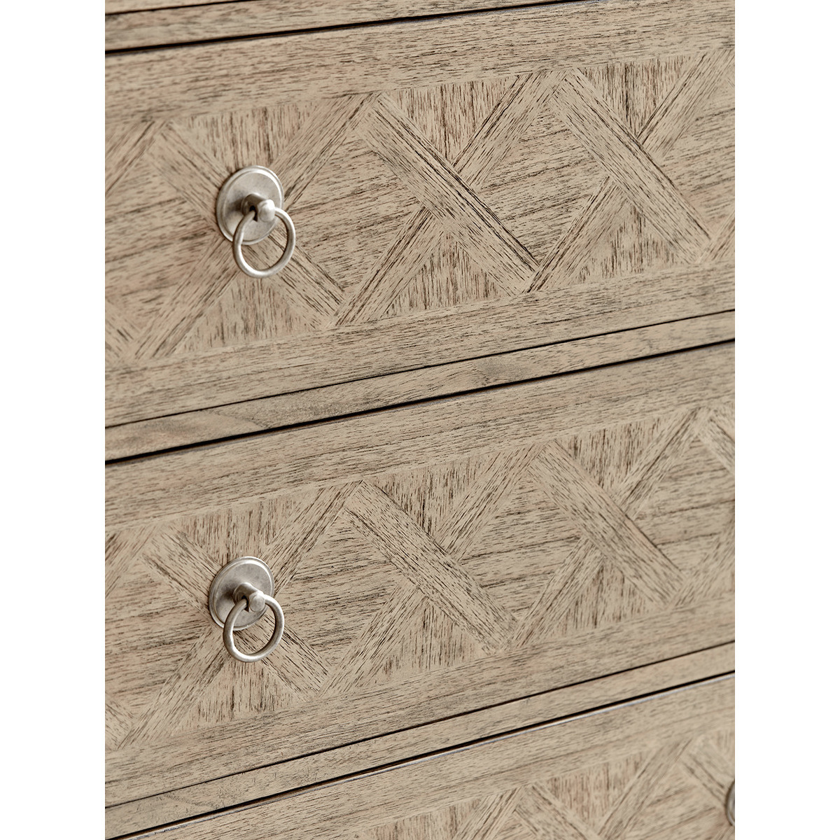 The mindi wood of our Geometric Parquet Chest Of Drawers has a gently brushed finish to give it a coastal feel. A piece of furniture that, with its geometric design, has an elegant, almost stately quality. Traditional ring pull hardware and decorative turned wood legs finish the decorative elements of our chest of drawers. Explore the complete Geometric Parquet range.
