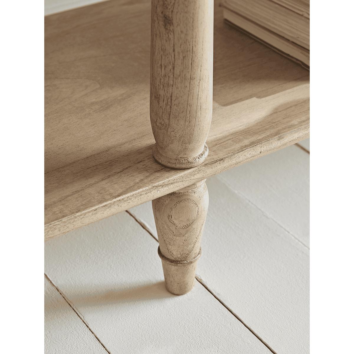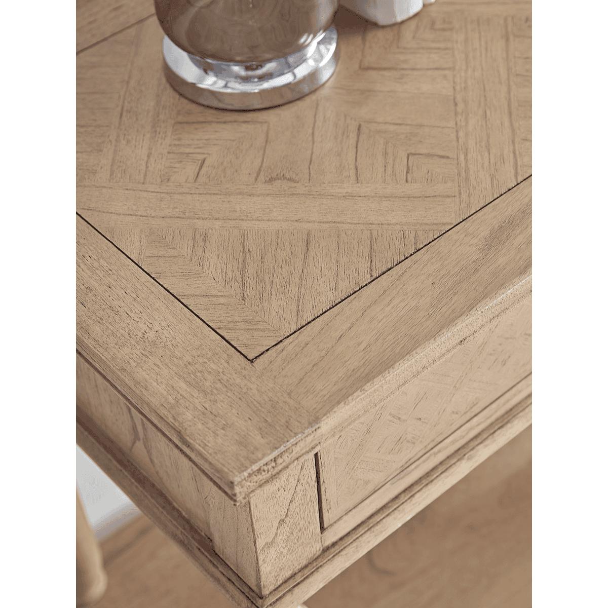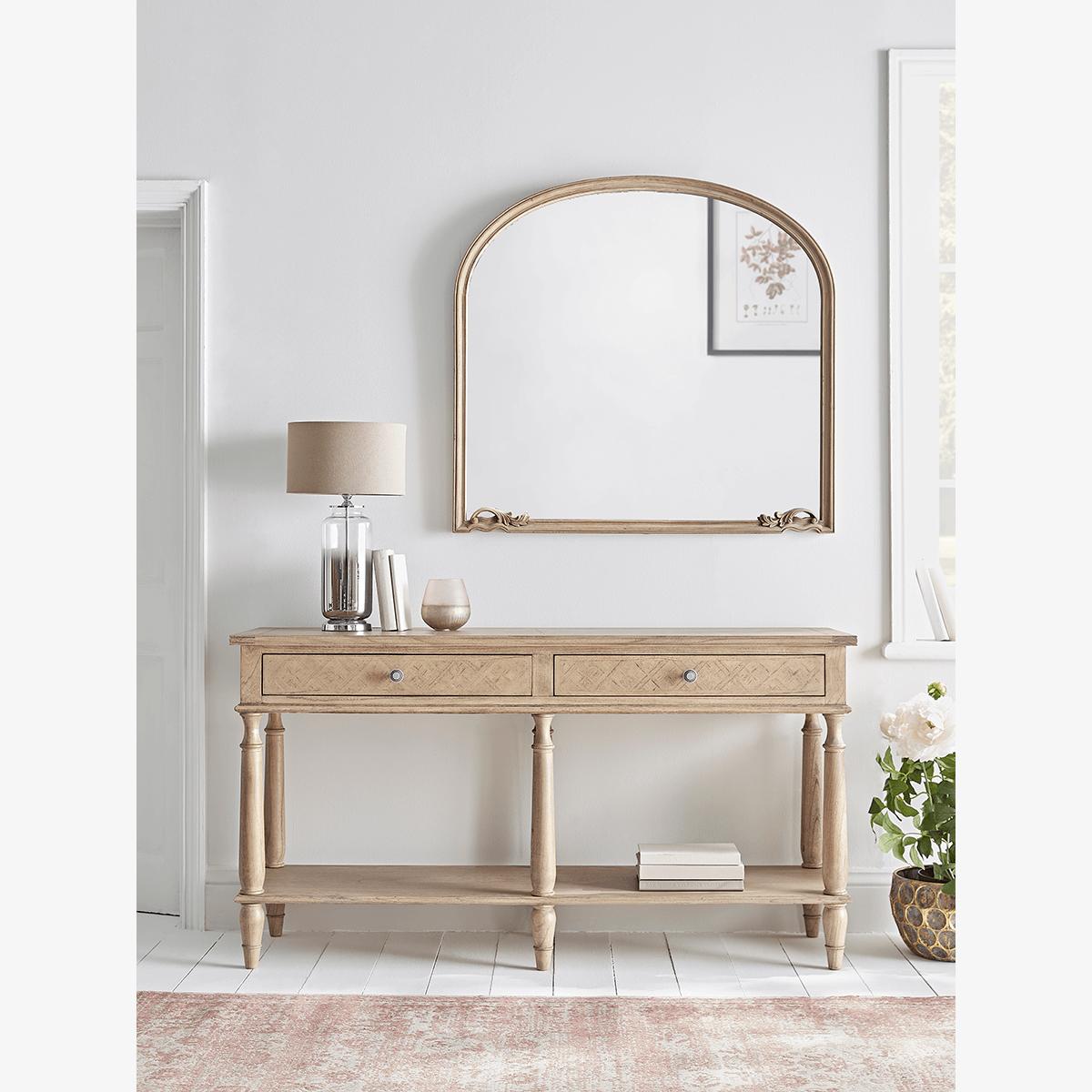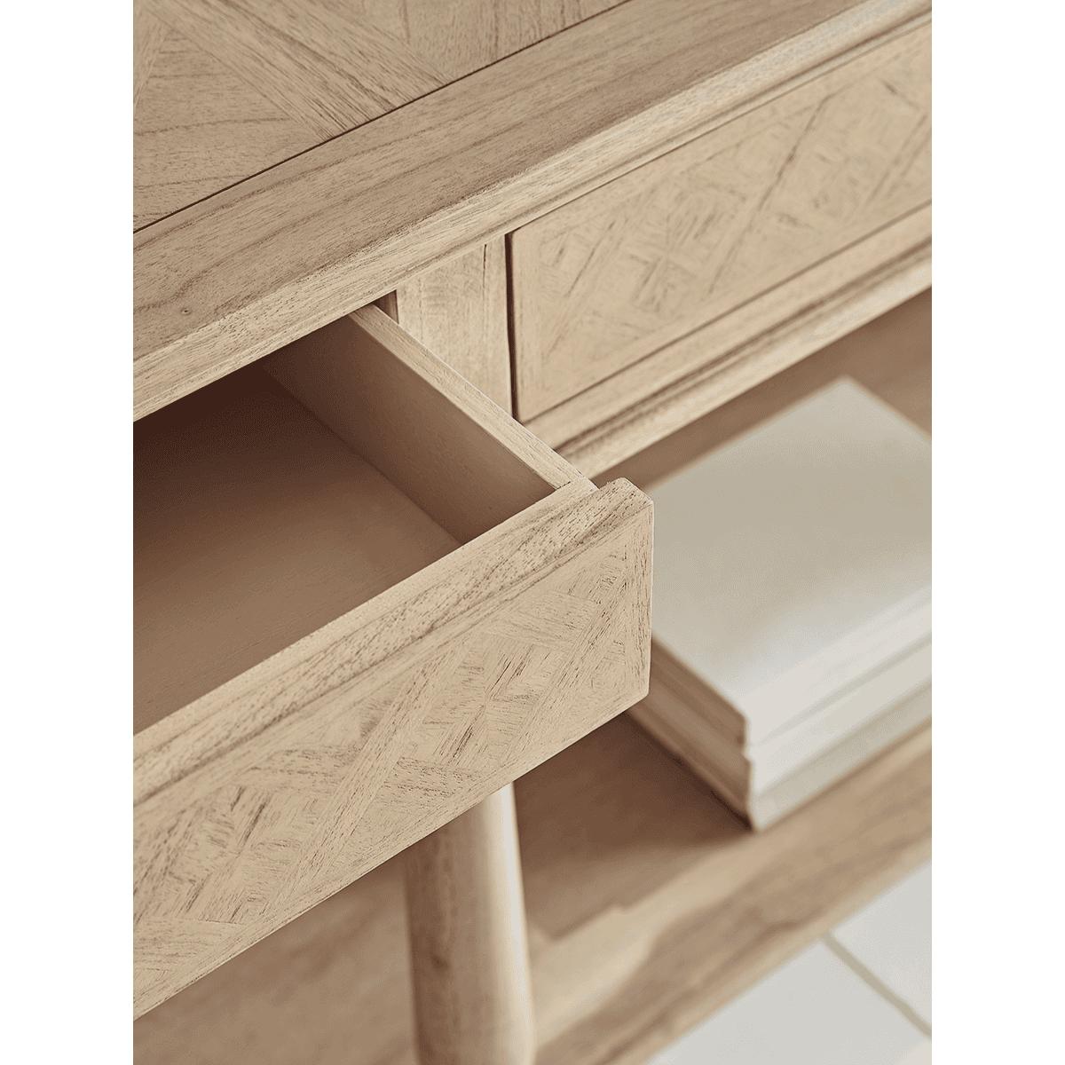 The gently brushed mindi wood of our Geometric Parquet Console Table gives it a lovely aged effect that echoes beautifully our Faded Elegance trend. A wide console which, with its turned legs, textural parquet design and smart metal hardware is a well balanced piece that will complement both contemporary and classic interiors. Two drawers and a wide stretcher shelf beneath provide useful storage space and this table would support a single or pair of table lamps in a hallway or living room to great effect.