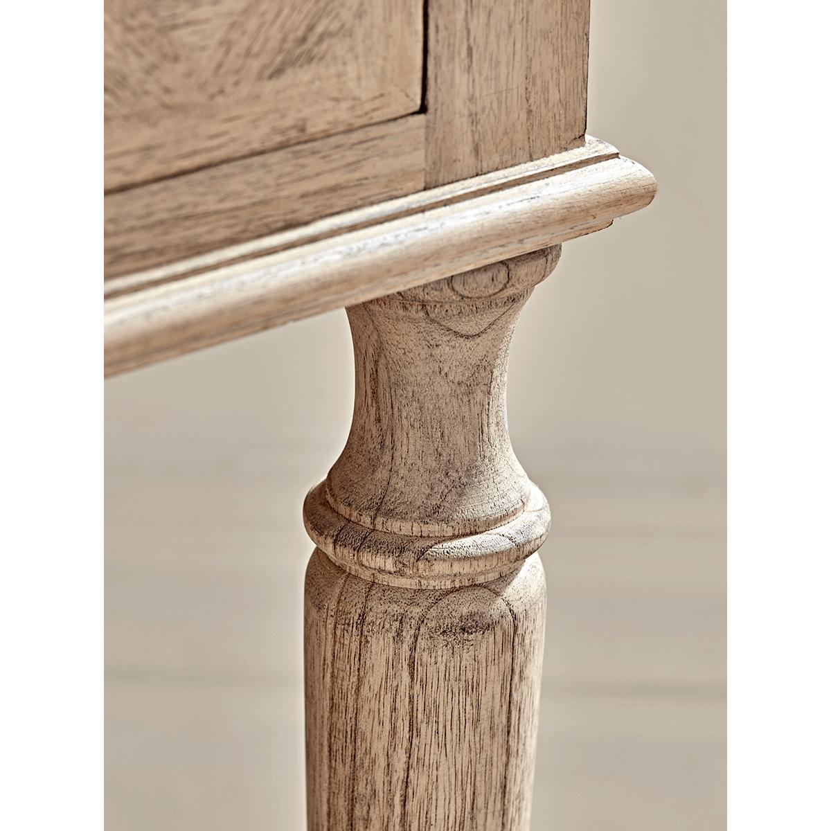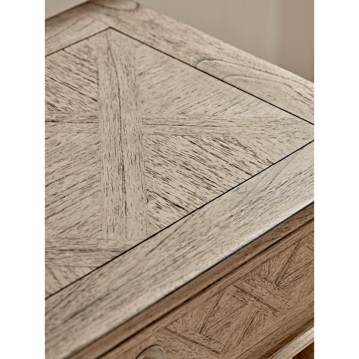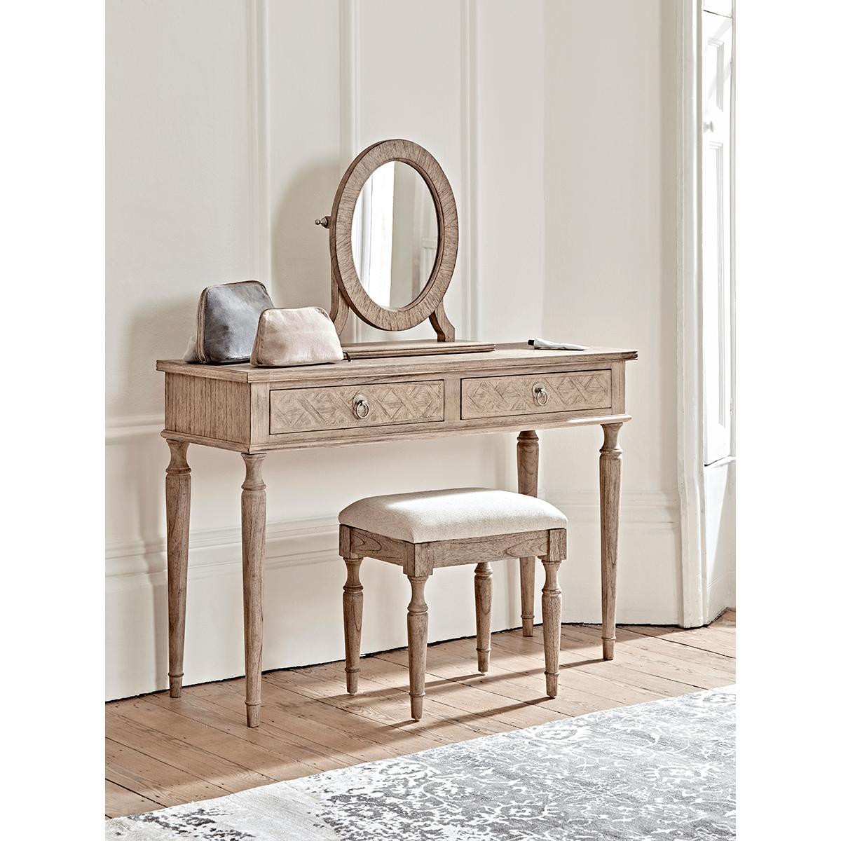 I love this dressing table for its classic yet contemporary appeal, thanks to the striking geometric parquet detail which adds subtle texture and visual interest. It works particularly well in traditional interiors that could benefit from a touch of modern elegance, but it also suits Scandinavian and coastal schemes due to its light, neutral finish. Practical styling tips include layering soft accessories like cushions and throw blankets on the stool or placing a minimal collection of jewellery and beauty essentials on the surface. Keeping the space uncluttered allows the beautiful craftsmanship to shine, making it a versatile piece that can be both a functional and aesthetic centrepiece in a bedroom.