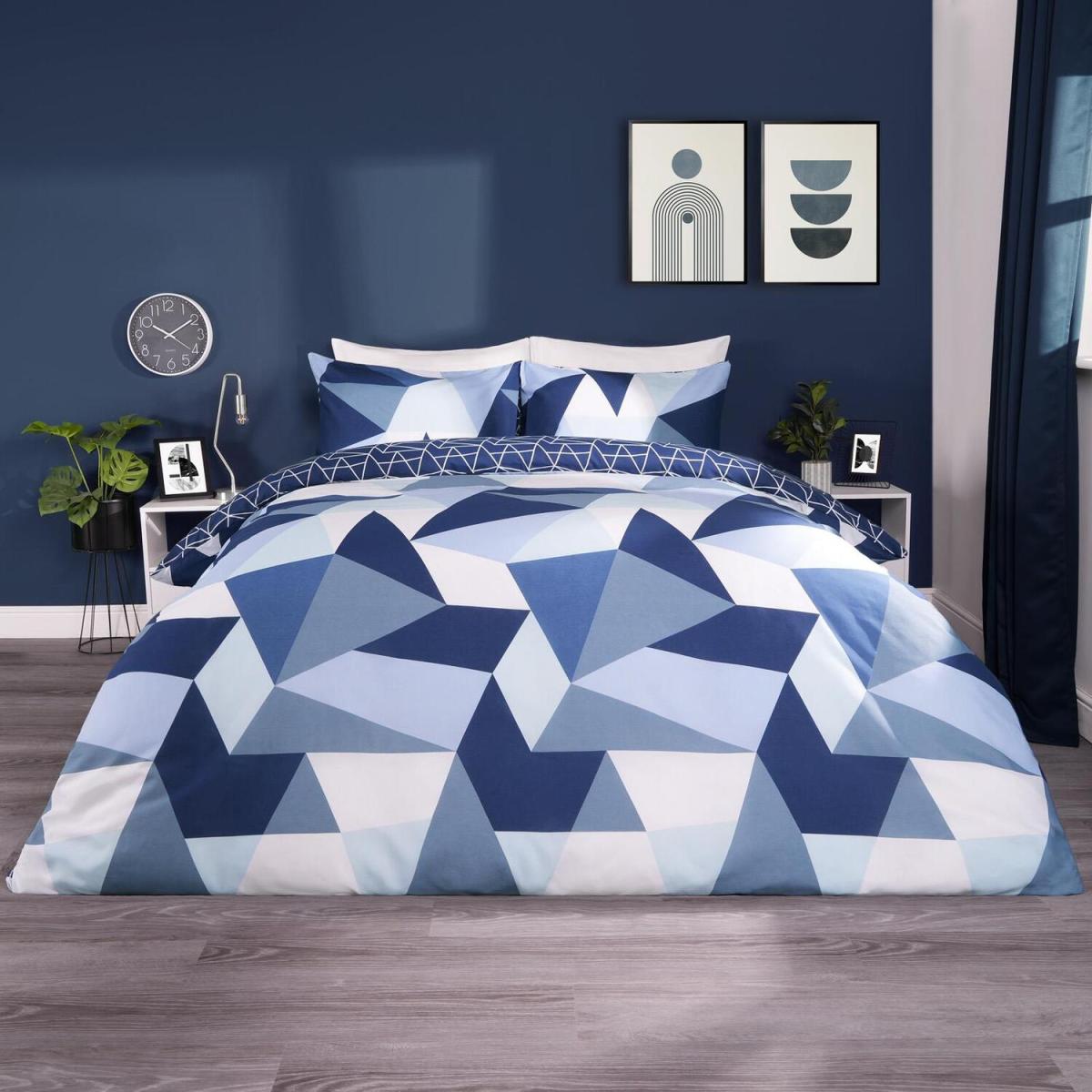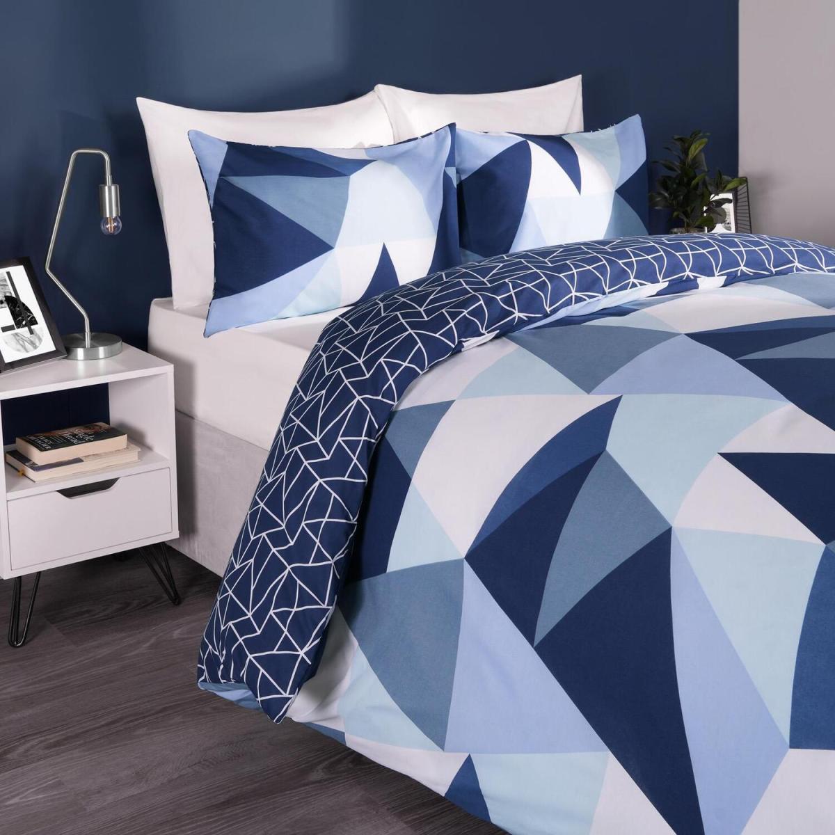 This 2-in-1 reversible duvet cover set from Dreamscene's Premium range will be sure to modernise your room with it's geometric shapes patterned design. The reverse side features a modern inverted shapes pattern and the set comes with matching pillow case(s). Made from a soft polycotton blend, 50 cotton and 50 polyester, this bedding set is soft, comfortable and durable, allowing for a relaxing nights sleep.