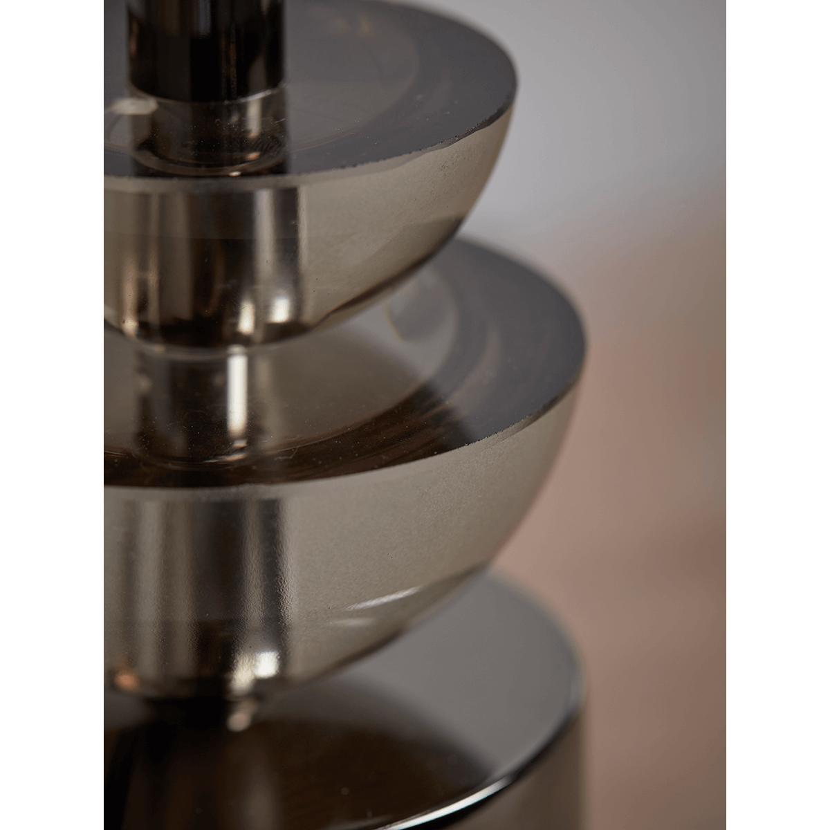 I love this lamp for its sleek geometric design, which adds a modern, sophisticated touch to any space. Its smoked glass and metallic accents make it versatile enough to work well in contemporary settings, such as minimalist living rooms, home offices, or even luxe bedrooms. When styling, consider pairing it with other monochrome or industrial elements to highlight its clean lines and understated elegance. Practical tips include using it as a statement piece on sideboards or console tables, and complementing it with textured cushions or soft throws to balance the hard surface of the glass and metal. Overall, it’s a chic addition that provides both form and function.