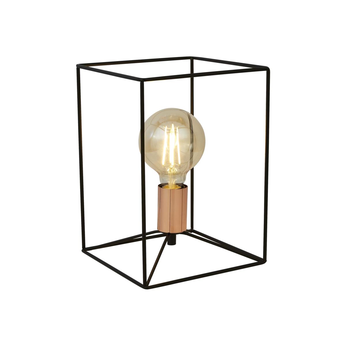 Encased in a simple yet stunning black frame, this table lamp features a copper lamp holder that adds a dynamic feel to any room in a living space. Bulb not included. We recommend a 1 x E27 bulb, 7. W.