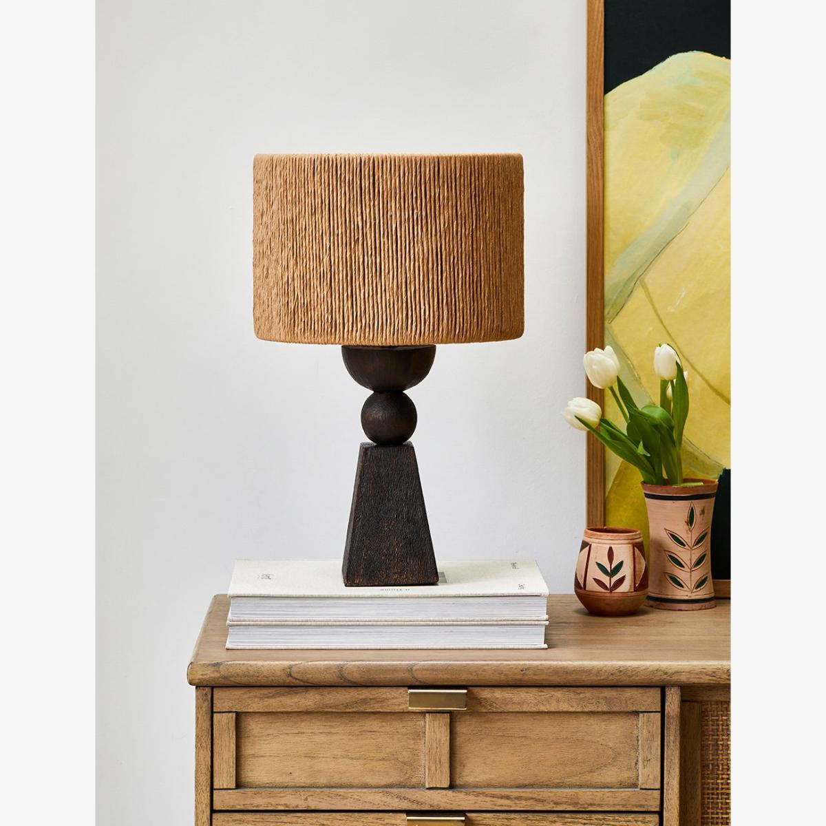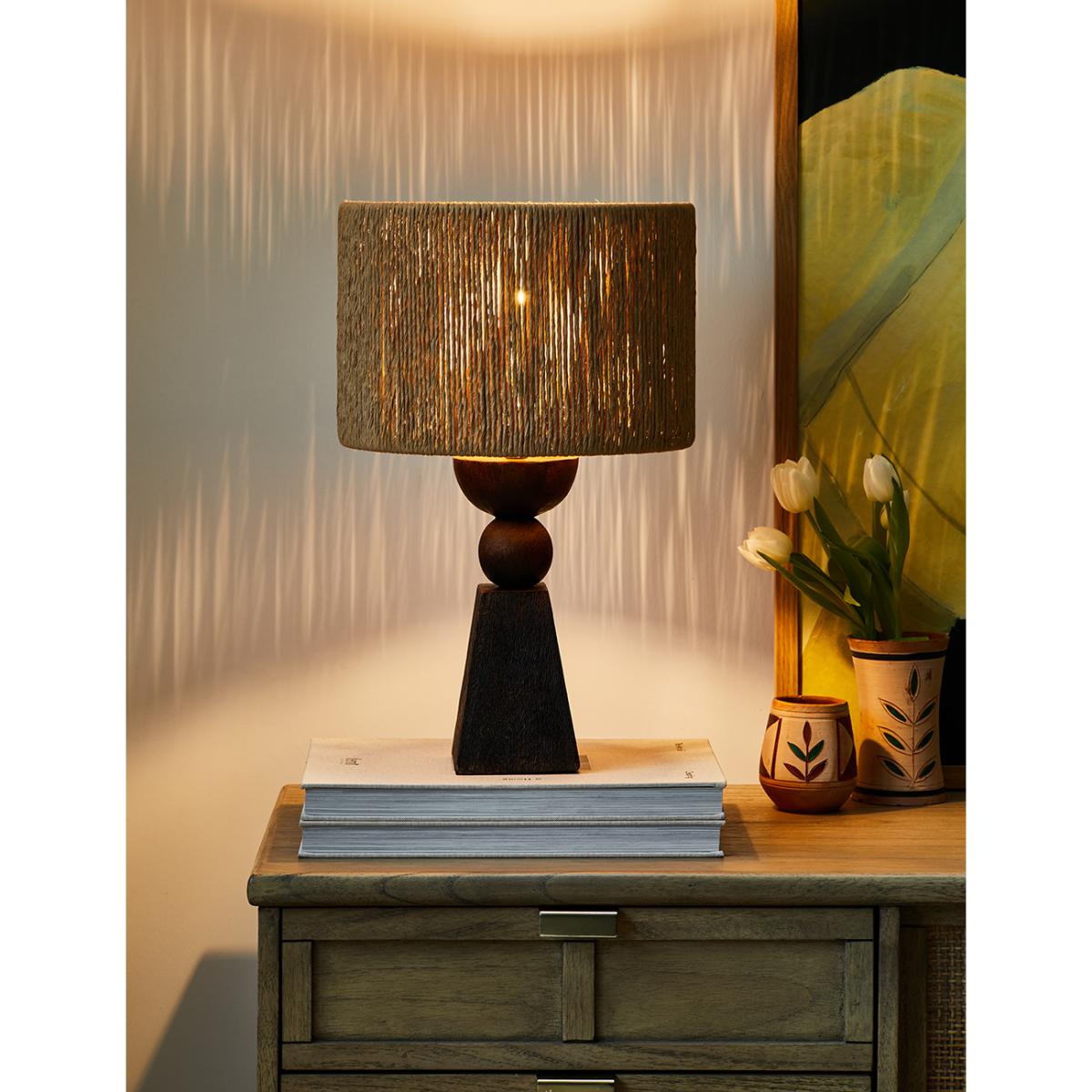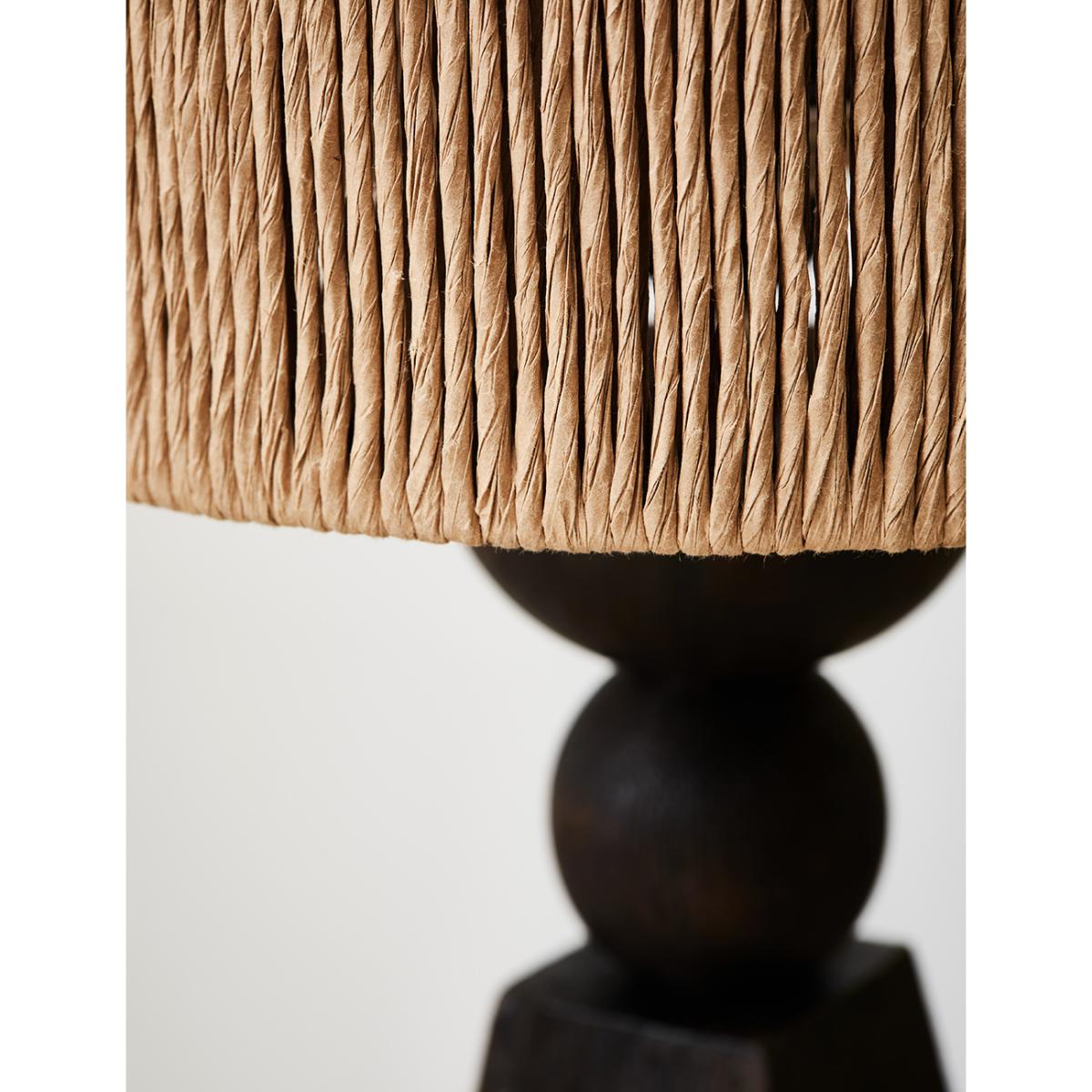 Add ambience to the room with our Dark Wooden Table Lamp. Boasting a beautiful abstract body, crafted from real mango wood and paired with a natural handwoven wicker lampshade. This tall abstract table lamp is completely versatile and looks great as a living room lamp, office lamp or bedroom lighting. The neutral shades of the wicker lampshade beautifully complement the black tones from the mango wood base, creating a unique and cohesive lamp perfect for any setting.