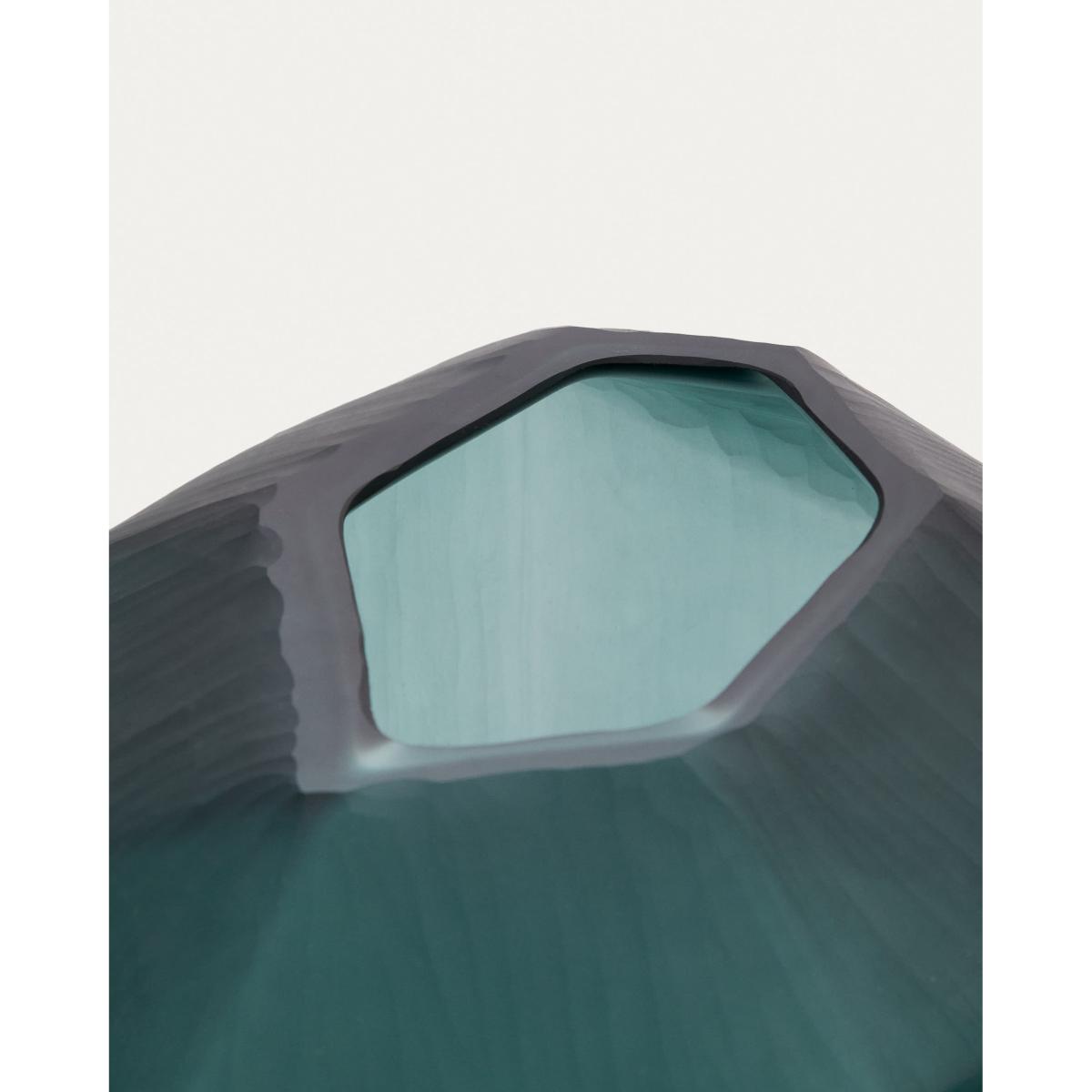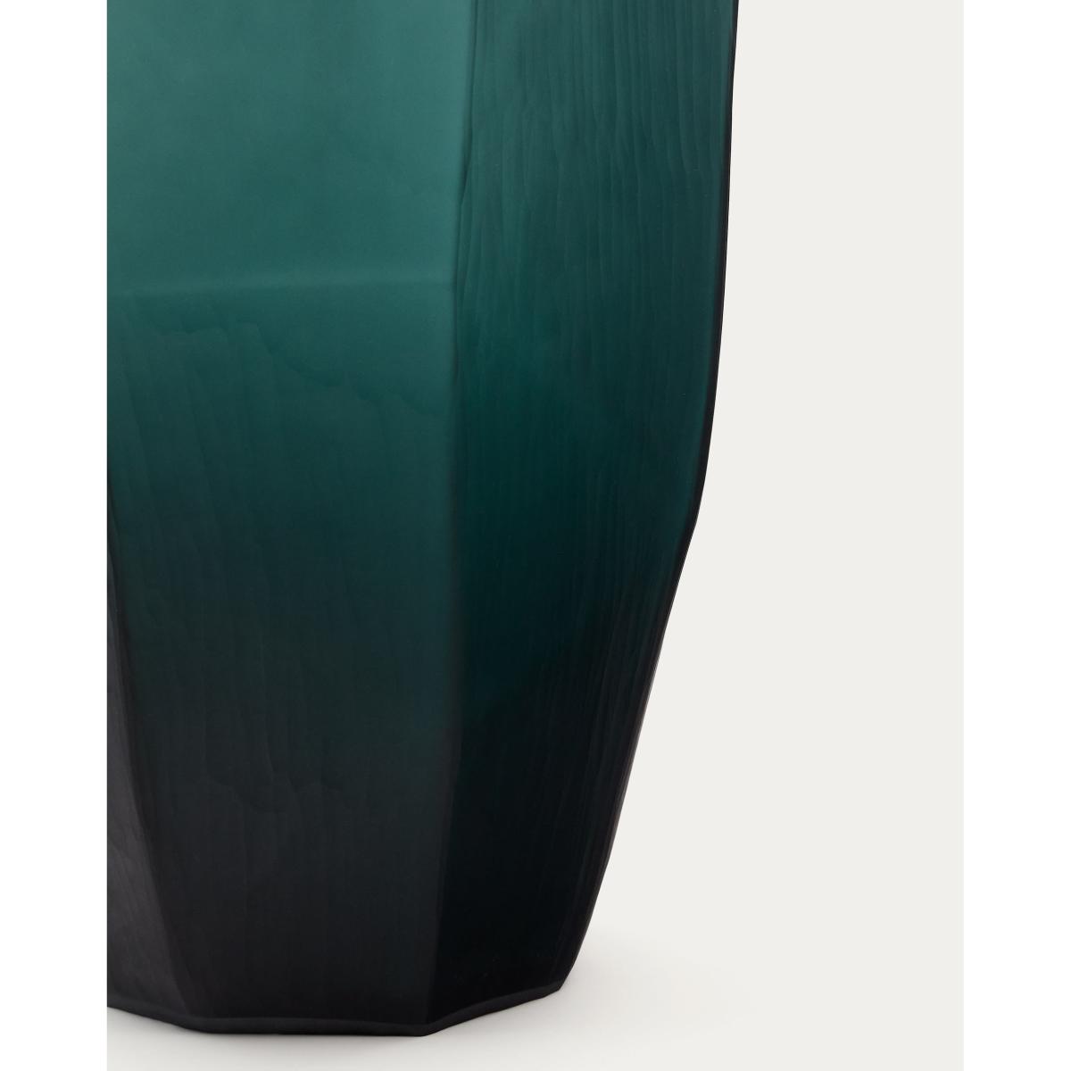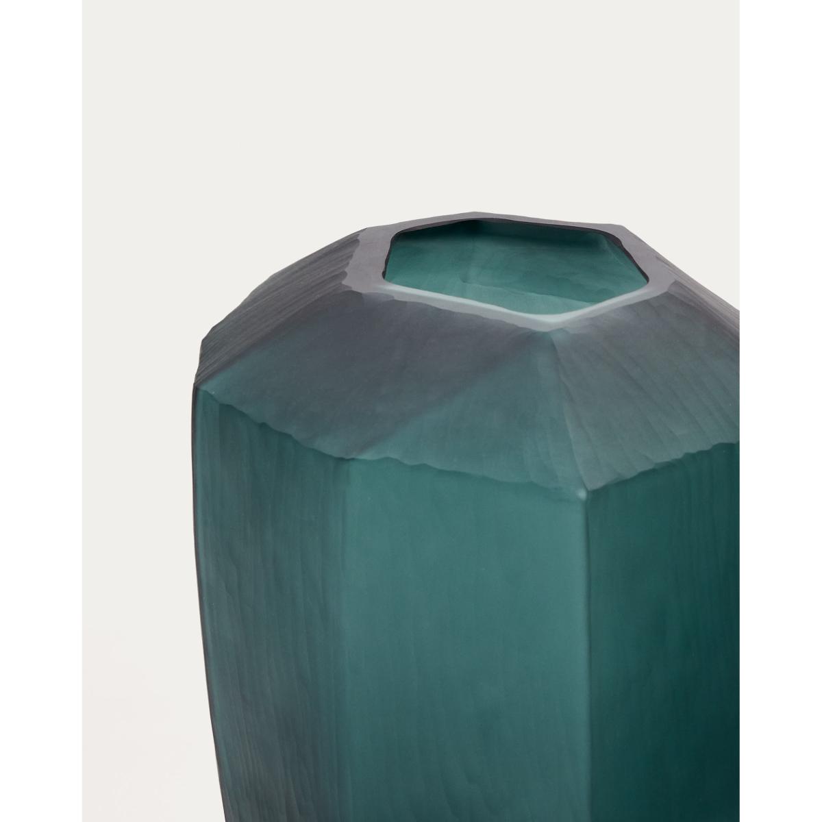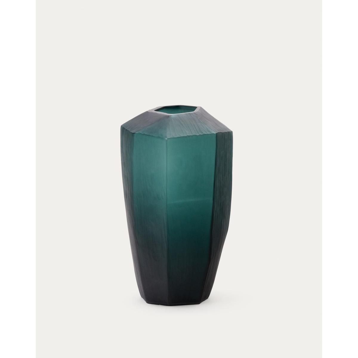 This geometric vase combines angular lines and a robust shape reminiscent of a polyhedron. The green glass highlights its contemporary design, making it a modern piece, perfect for minimalist decor.