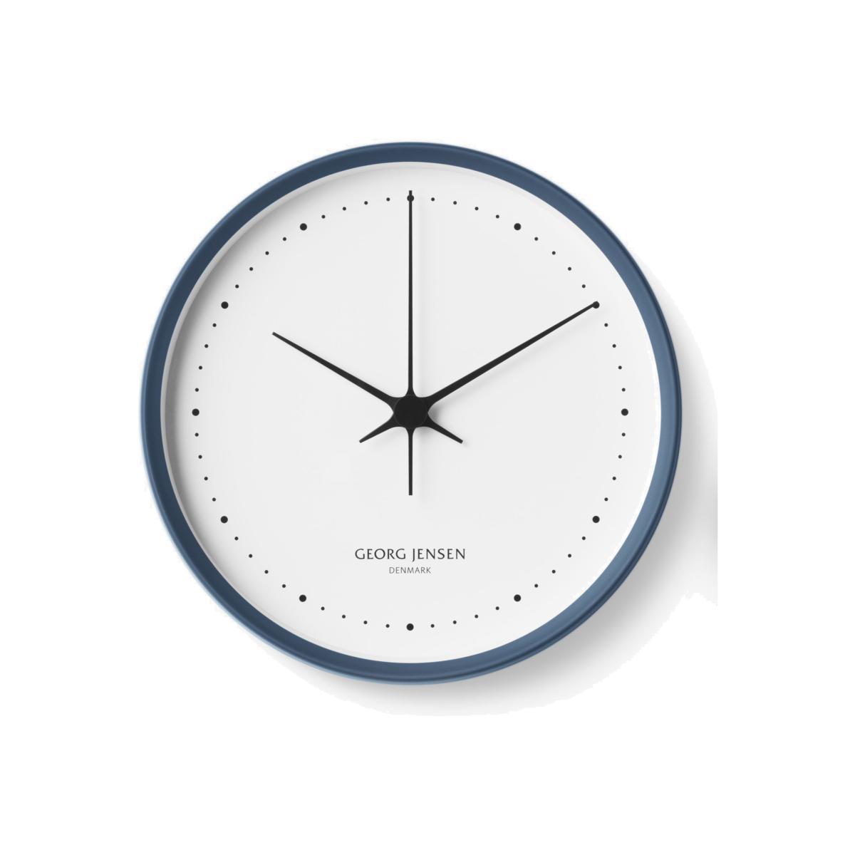 Henning Koppel is considered a master of Scandinavian modernist design and this clock, originally designed in 1978 for Georg Jensen, is a prime example of his work. The stainless steel frame has a matte, powder-coated finish in blue, this colouring inspired by the watercolours in Koppel's studio. The tapered hands and simple dots that denote the time points are both in black, contrasting the stark white face and creating a minimalist and graphic look. Keeping time using quartz sweep movement, the hands move continuously rather than ticking. Use as part of a modern interior decor theme.