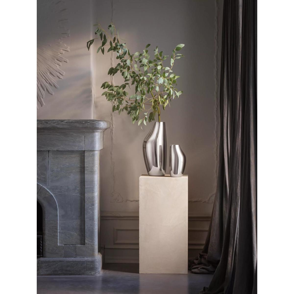 The Sky Vase is a sleek, modern piece that works beautifully in contemporary or minimalist interiors. Its sculptural form and reflective silver finish make it a statement on its own, so it’s perfect for displaying a single, striking floral arrangement or even standing solo on a console or mantel for added visual interest. For a more styled look, try pairing it with monochrome or neutral decor palettes to let the vase’s elegant silhouette take centre stage. Practical styling tips include using it with tall, slender stems to enhance its graceful shape or combining it with textured accessories for an integrated, layered look. Overall, it’s a versatile piece that brings a touch of elegance and modernity wherever it’s placed.