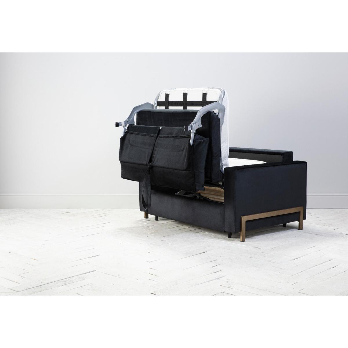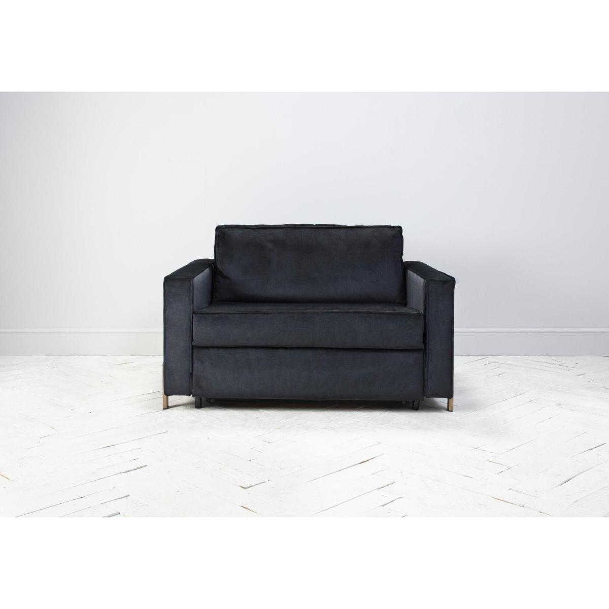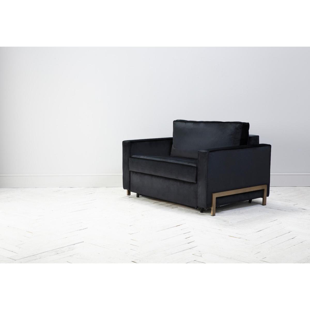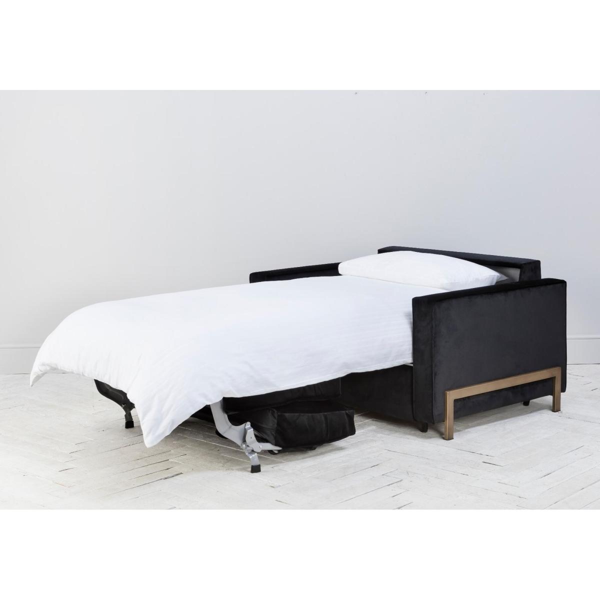 Introducing George, a compact sofa bed that is fit for a king. Comfortable to the extreme, this modern sofa bed has a hardwood frame and a clean-lined design, with angular arms, a brass-finished metal base and piping detail throughout. A stylish loveseat by day, George becomes a heavenly slatted bed in a matter of seconds at night. Available in over a hundred fabrics to choose from, each George is made to order by hand exclusively for you, and as such, will become the crown jewel of your home.