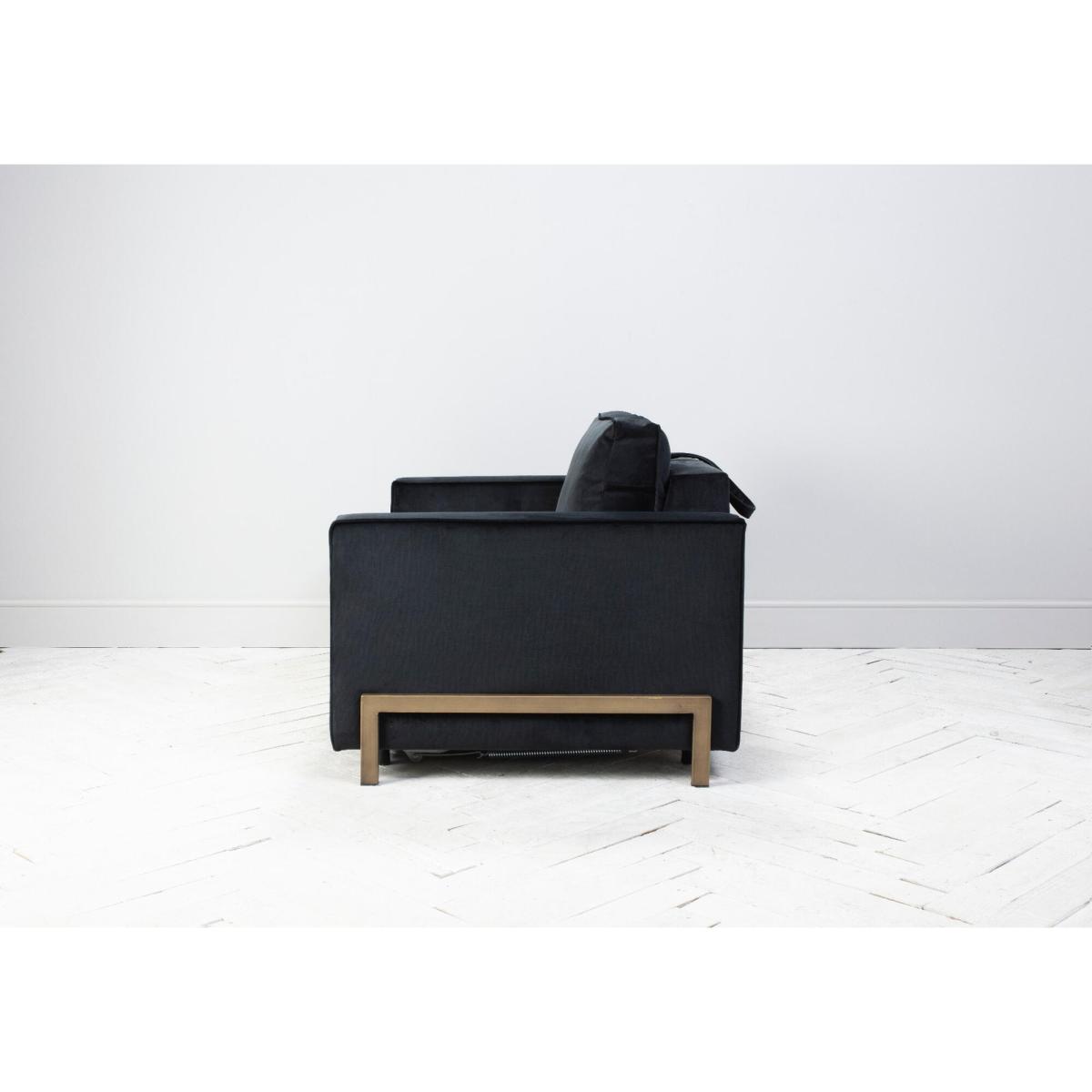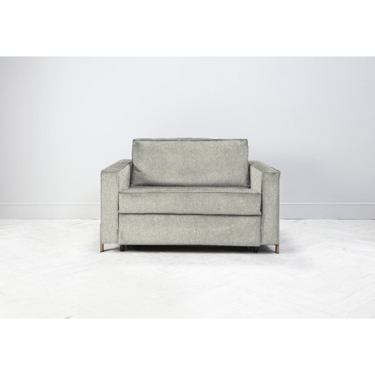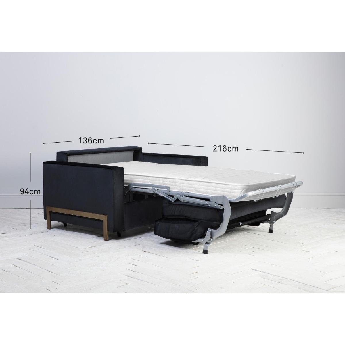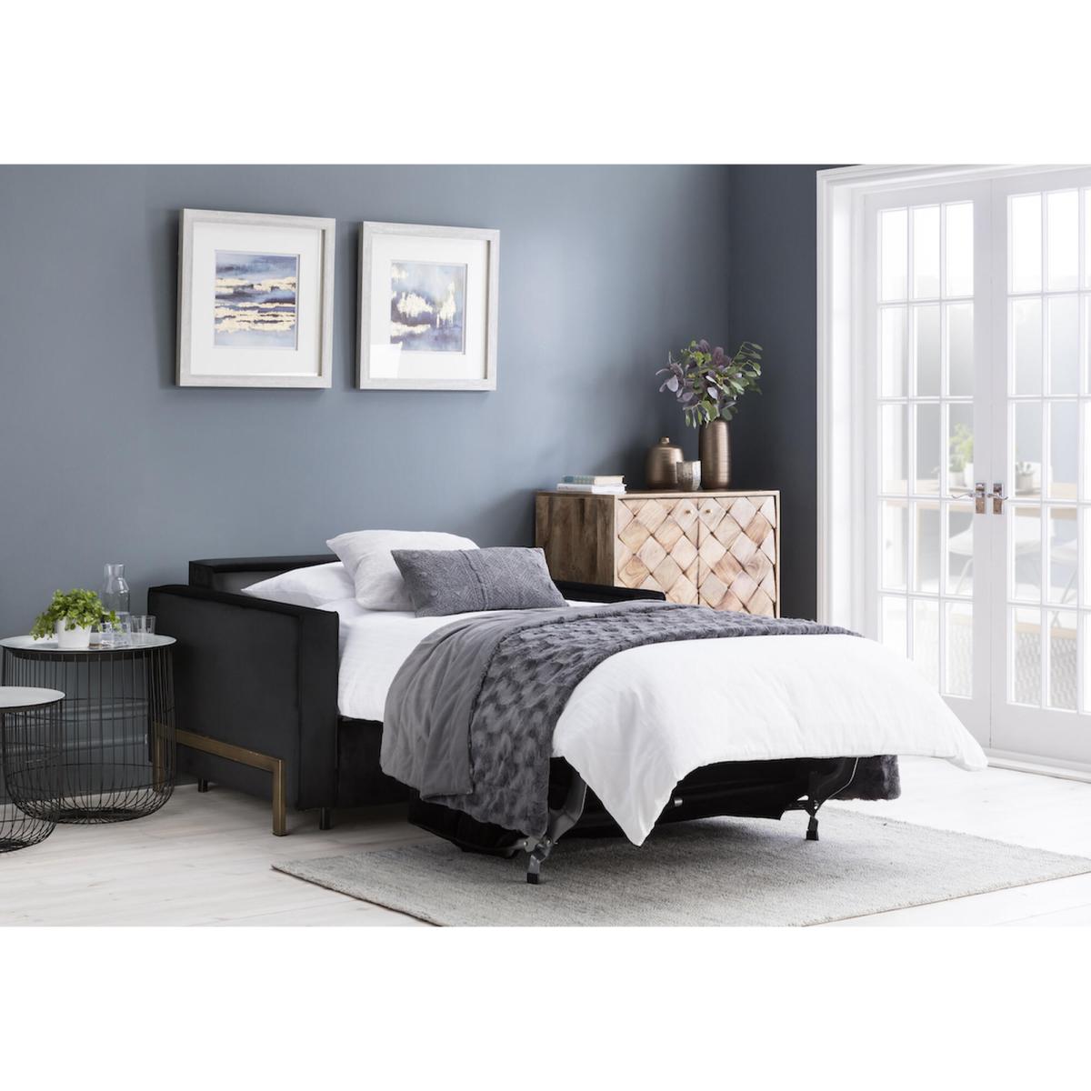 Introducing George, a compact sofa bed that is fit for a king. Comfortable to the extreme, this modern sofa bed has a hardwood frame and a clean-lined design, with angular arms, a brass-finished metal base and piping detail throughout. A stylish loveseat by day, George becomes a heavenly slatted bed in a matter of seconds at night. Available in over a hundred fabrics to choose from, each George is made to order by hand exclusively for you, and as such, will become the crown jewel of your home.