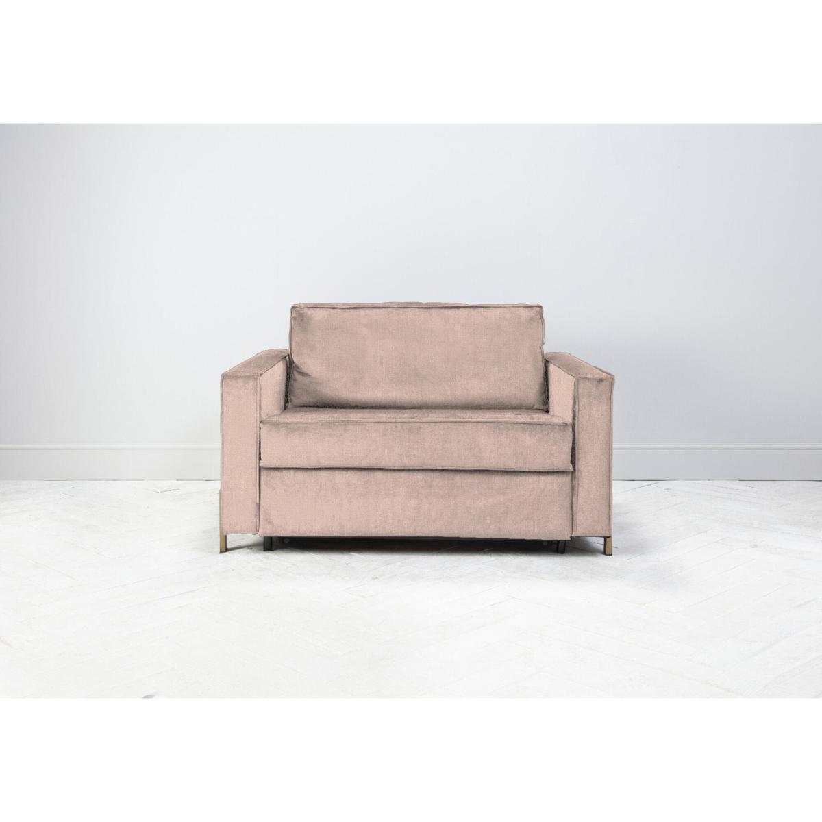Introducing George, a compact sofa bed that is fit for a king. Comfortable to the extreme, this modern sofa bed has a hardwood frame and a clean-lined design, with angular arms, a brass-finished metal base and piping detail throughout. A stylish loveseat by day, George becomes a heavenly slatted bed in a matter of seconds at night. Available in over a hundred fabrics to choose from, each George is made to order by hand exclusively for you, and as such, will become the crown jewel of your home.