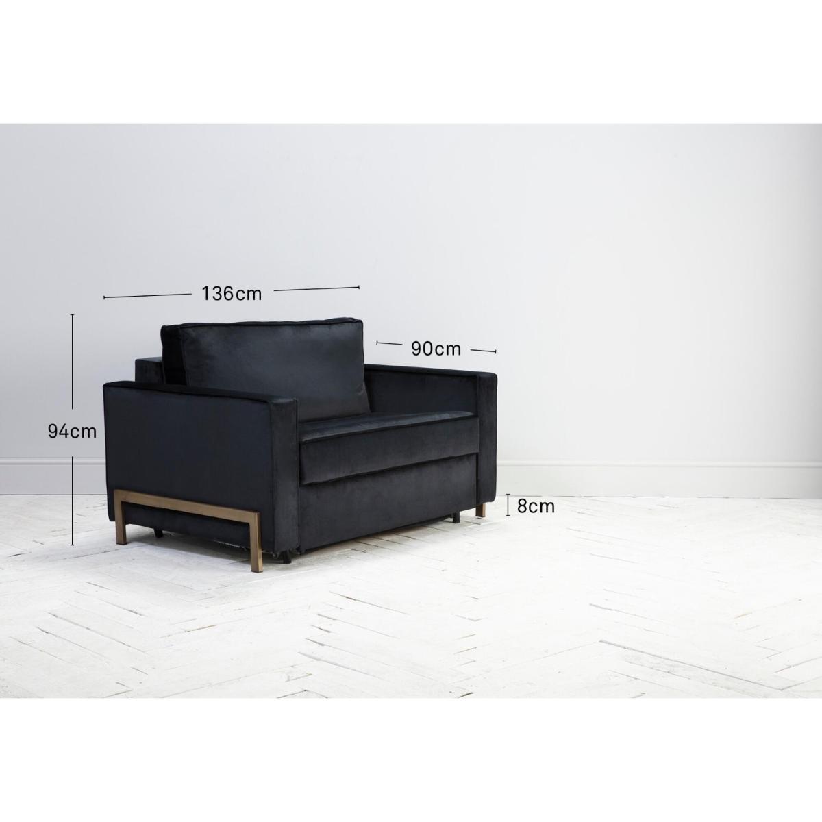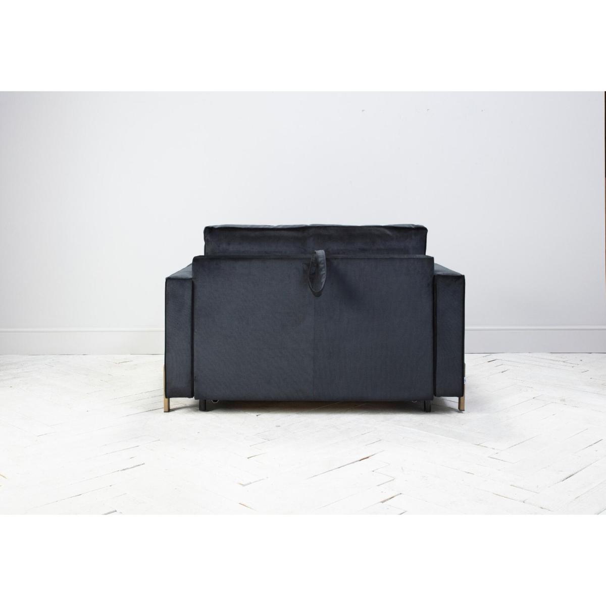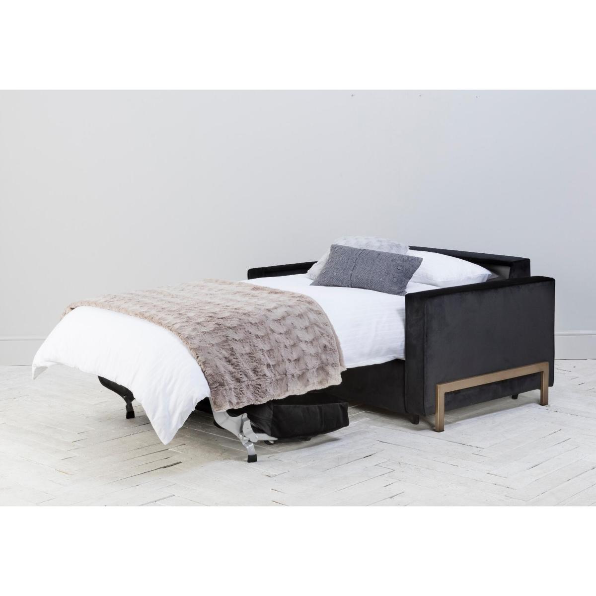Introducing George, a compact sofa bed that is fit for a king. Comfortable to the extreme, this modern sofa bed has a hardwood frame and a clean-lined design, with angular arms, a brass-finished metal base and piping detail throughout. A stylish loveseat by day, George becomes a heavenly slatted bed in a matter of seconds at night. Available in over a hundred fabrics to choose from, each George is made to order by hand exclusively for you, and as such, will become the crown jewel of your home.