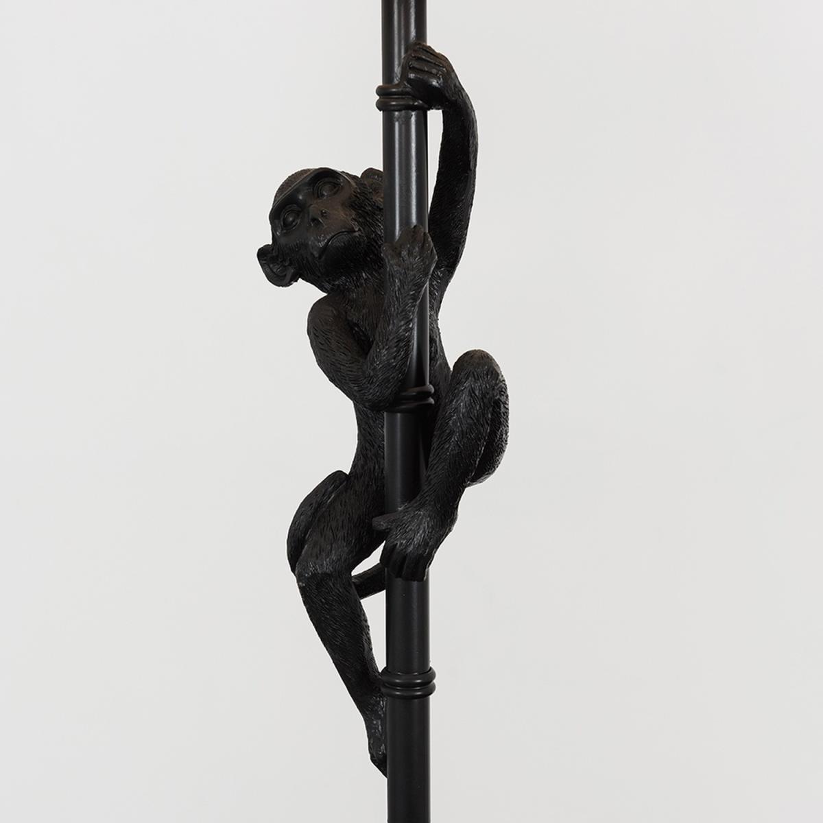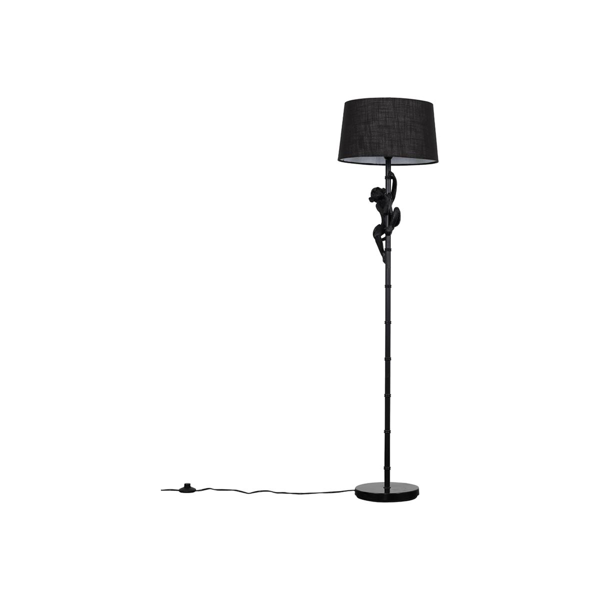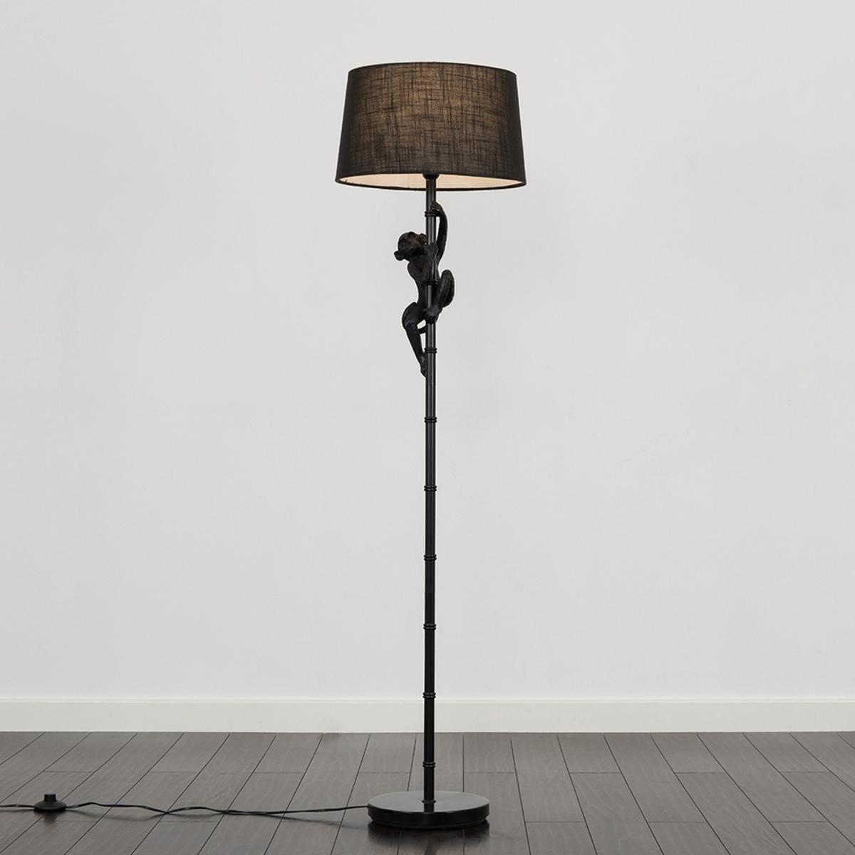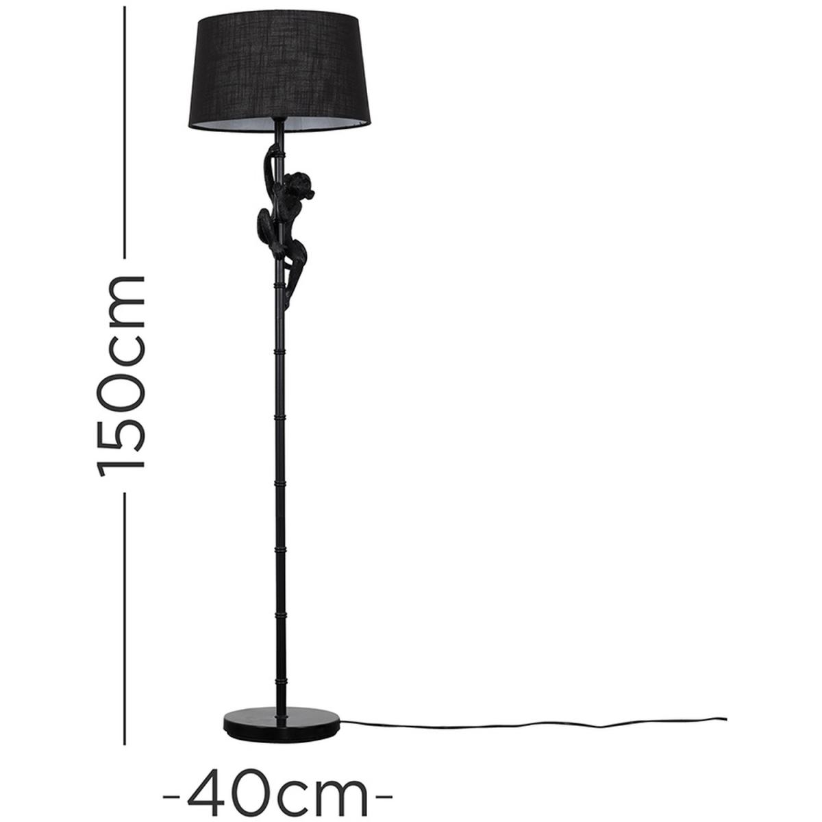 Modern floor lamp with a hanging monkey on the stem in a black polyresin finish. Comes complete with a black faux linen tapered lamp shade. Features an in-line onoff switch for easy use. This lamp is a great focal point - the right fitting can create a statement and complete your living space look. Ideal for lounges and other living areas.