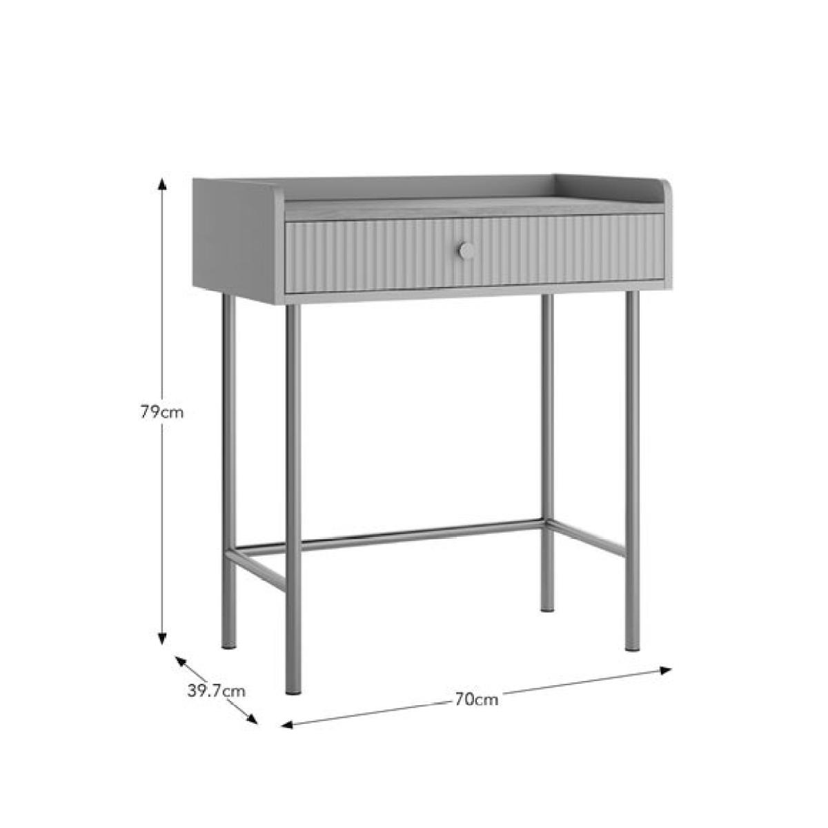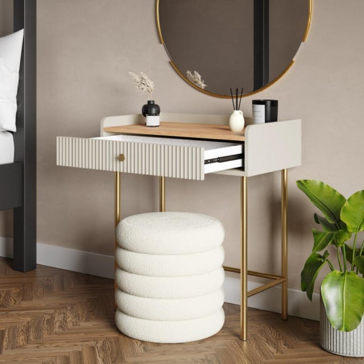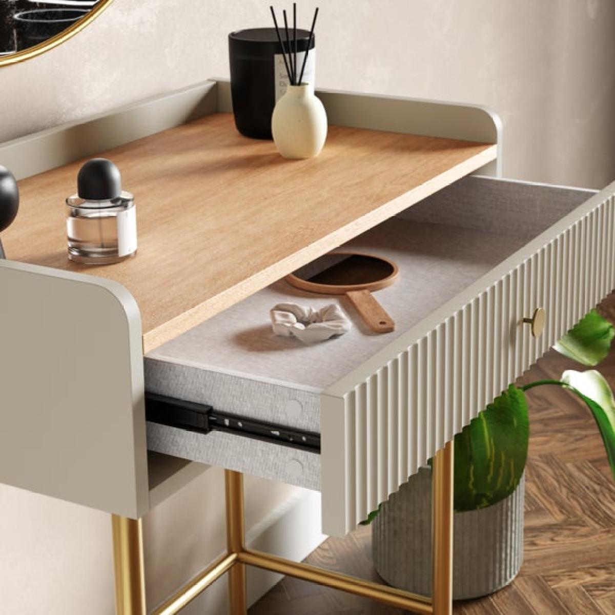 * Modern compact dressing table * Ribbed drawer front * Oak effect top * Gold frame * 1 storage drawer * Choice of colours This compact dressing table is a great choice for smaller rooms. The chic ribbed drawer front and gold frame add a sophisticated touch, whilst the painted finish is available in a choice of neutral colours to suit your decor. The spacious storage drawer takes care of all your daily essentials, and it's finished with an oak effect top. Your daily routine has never looked so stylish!