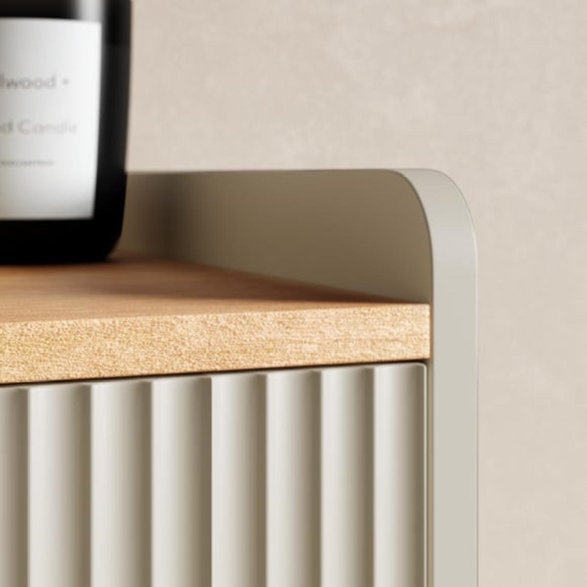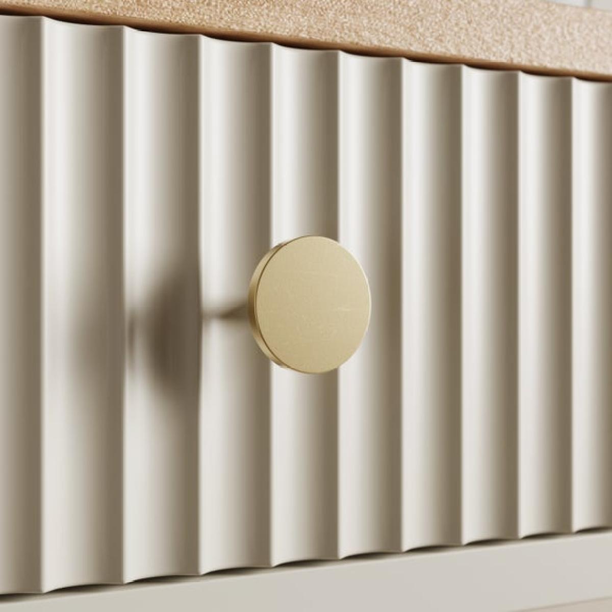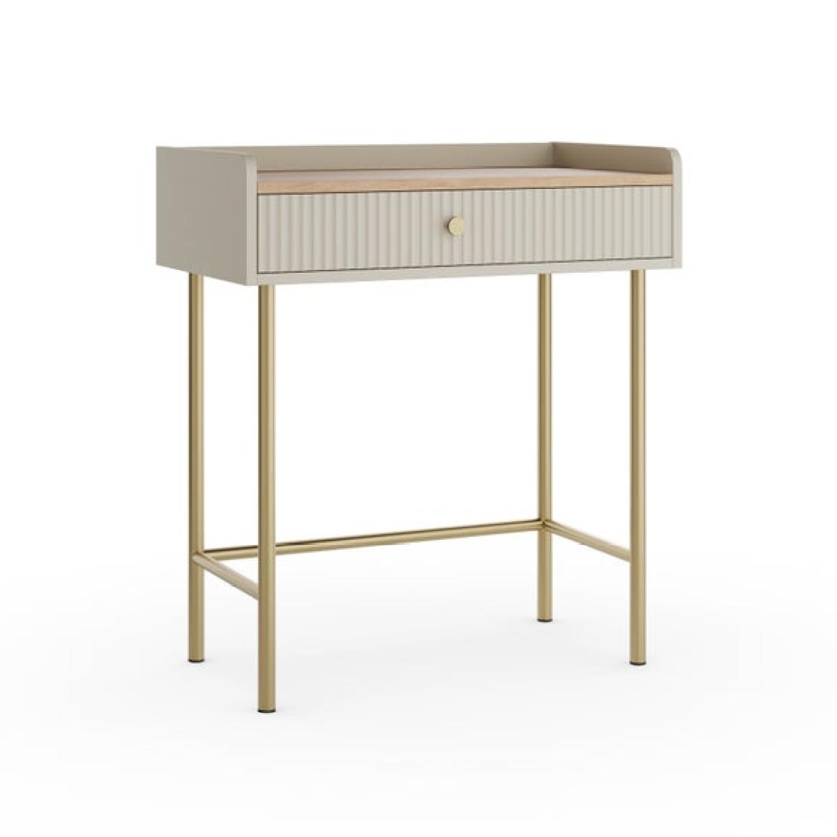 * Modern compact dressing table * Ribbed drawer front * Oak effect top * Gold frame * 1 storage drawer * Choice of colours This compact dressing table is a great choice for smaller rooms. The chic ribbed drawer front and gold frame add a sophisticated touch, whilst the painted finish is available in a choice of neutral colours to suit your decor. The spacious storage drawer takes care of all your daily essentials, and it's finished with an oak effect top. Your daily routine has never looked so stylish!