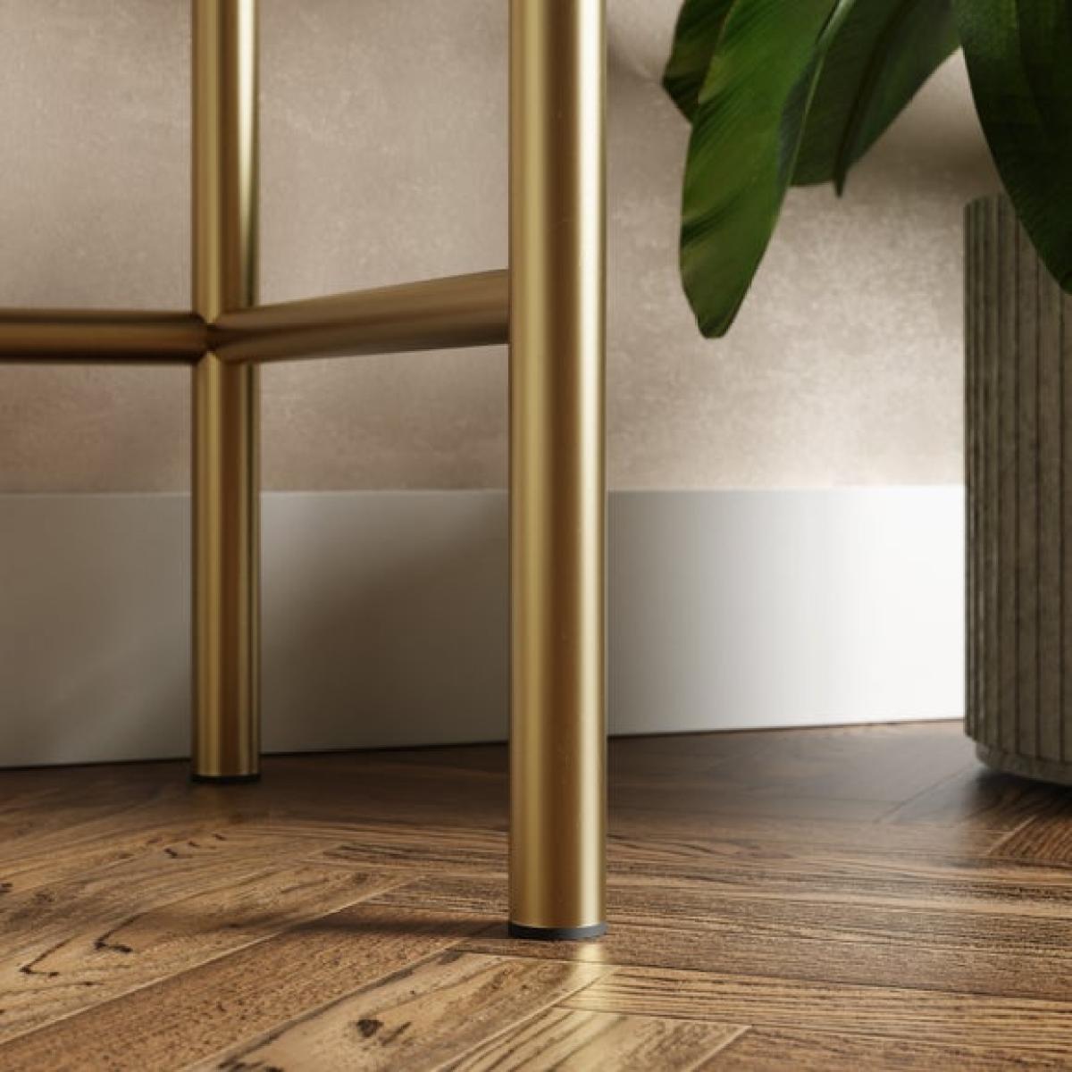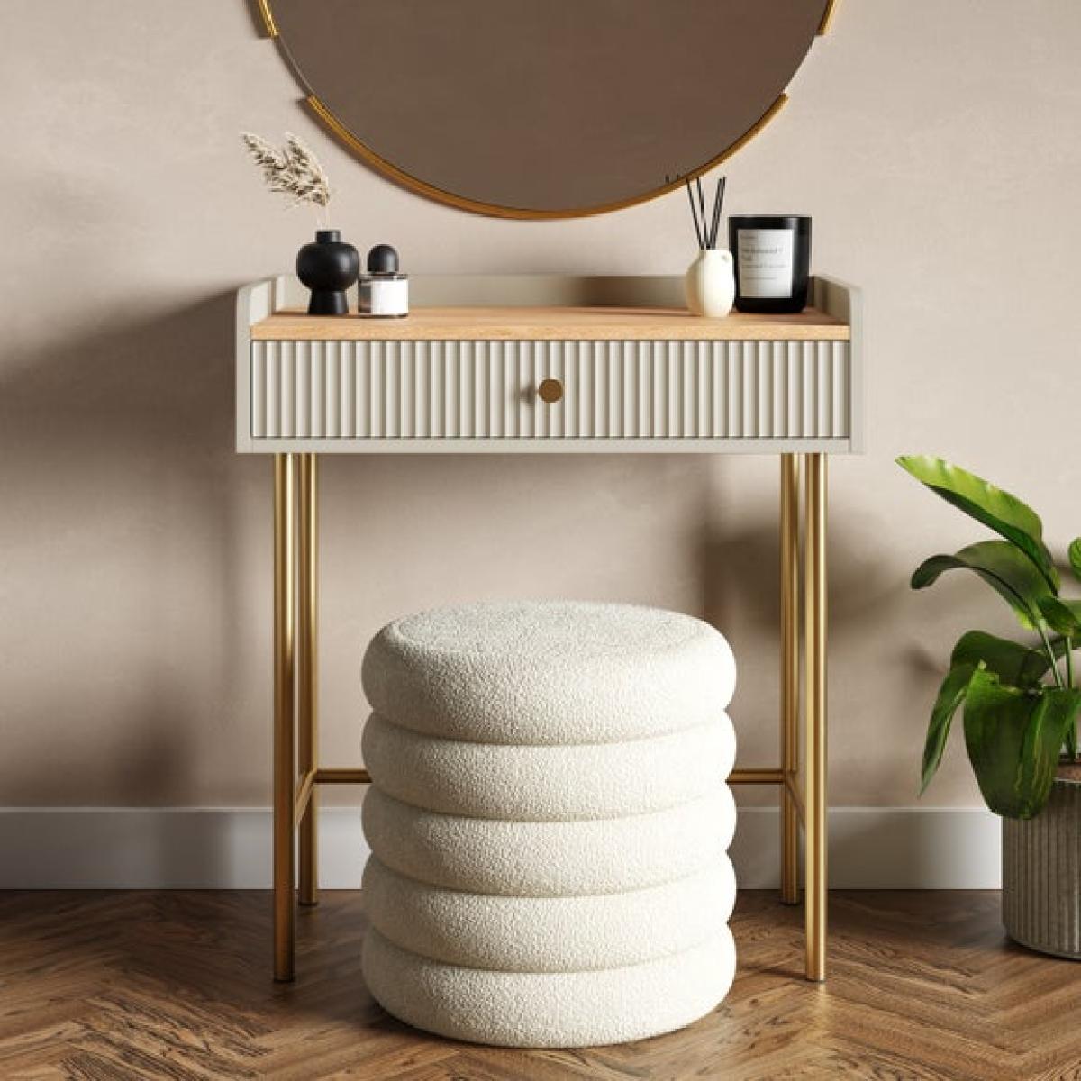 The Georgi 1 Drawer compact dressing table is a stylish yet practical piece that works well in both contemporary and modern interiors. I love its streamlined design, which offers a clean and clutter-free look, making it perfect for smaller bedrooms or spaces where you want to maximise functionality without sacrificing style. The drawer provides essential storage for beauty products or accessories, while the slim profile keeps the footprint minimal. To style it effectively, consider pairing it with a sleek mirror and minimal accessories for a chic, pared-back vibe. A soft, textured stool like this one in the image complements the clean lines of the table and adds a touch of comfort without overwhelming the space.