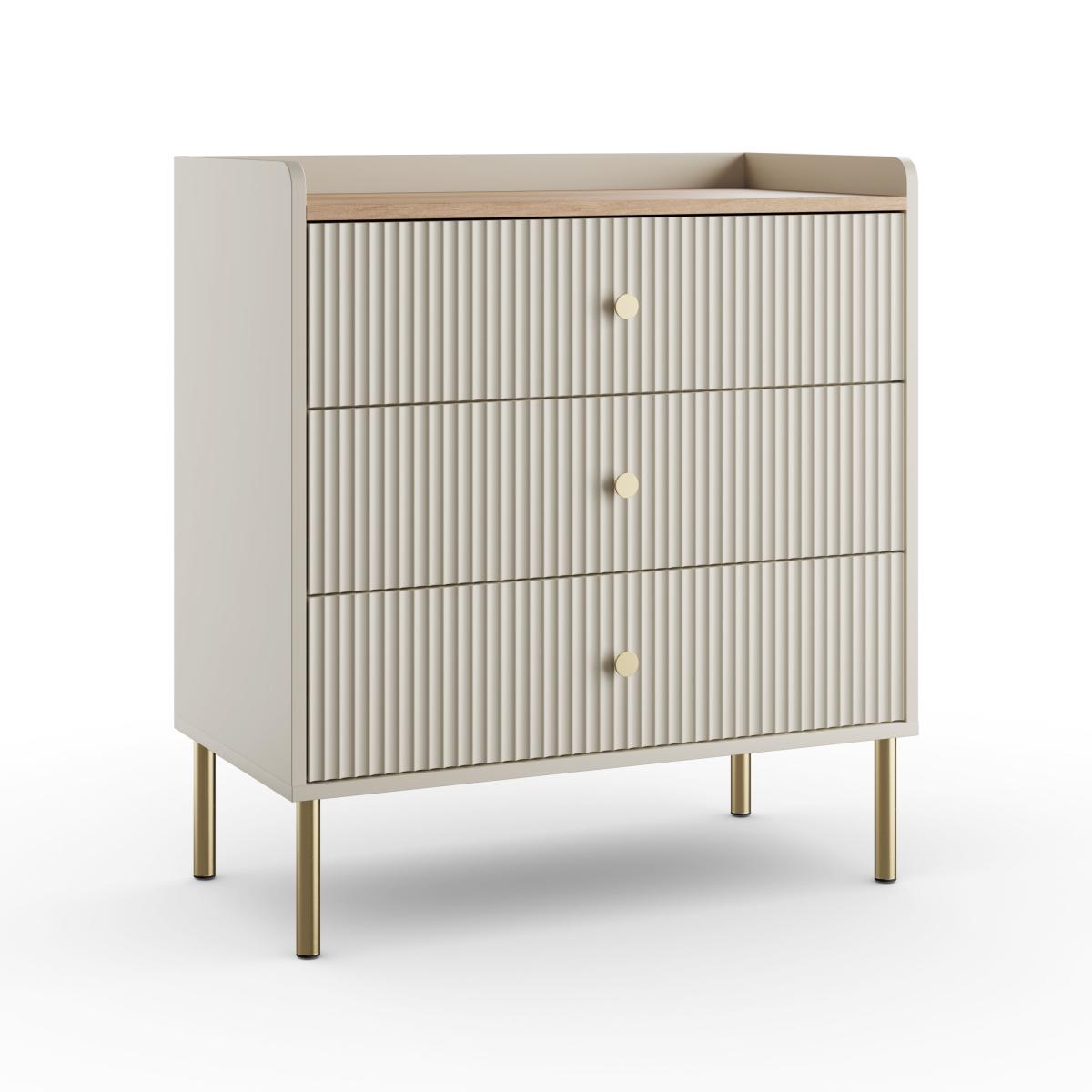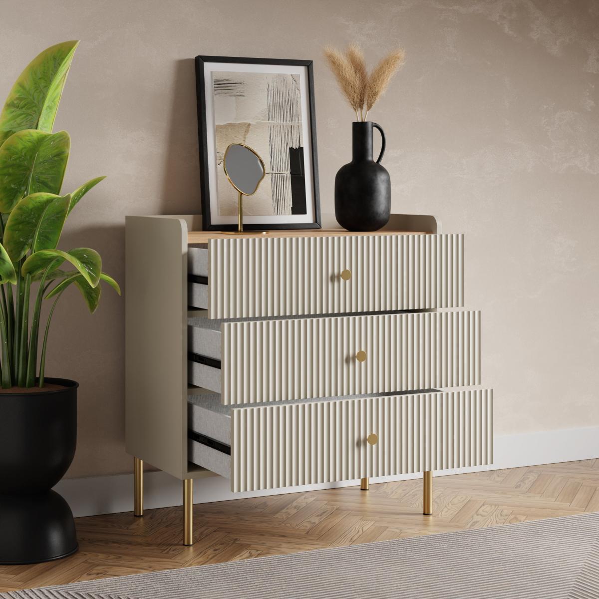 Dunelm Exclusive - Designed and Developed by Dunelm* Ribbed detail design* Natural finish with light oak effect top and trim* Matte gold finish handles and legs* Full assembly required With its warm, natural finish, this piece complements both traditional and contemporary interiors. The chest features three spacious drawers, perfect for organising clothing, accessories, or household essentials, making it a versatile addition to bedrooms, living rooms, or hallways. Its sturdy construction ensures long-lasting durability, while the timeless design adds understated elegance to any space. Please note we are unable to deliver this item to Northern Ireland.