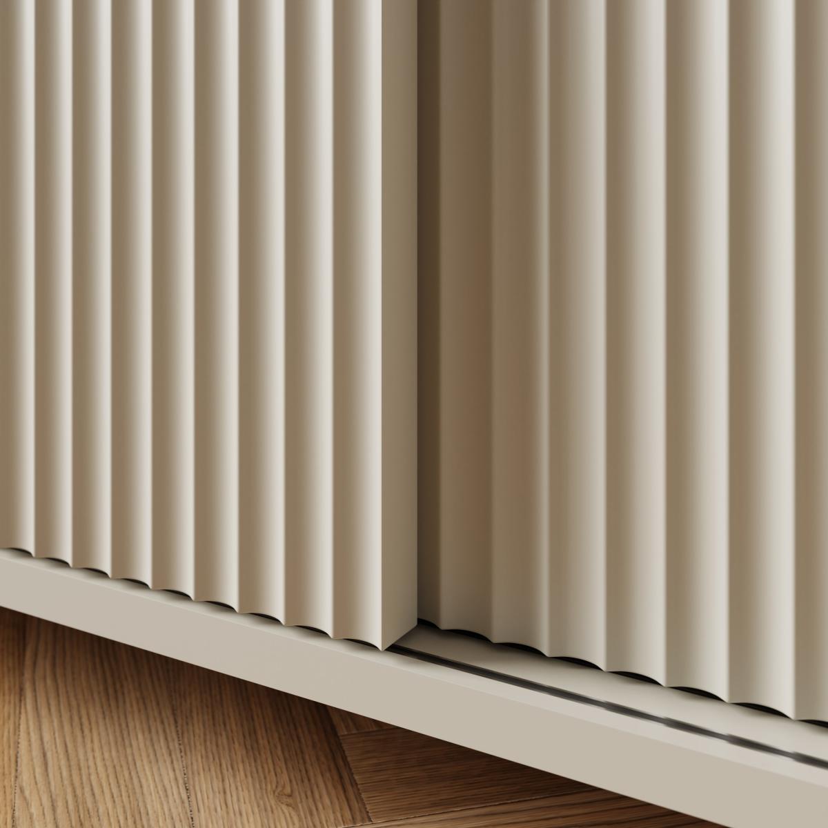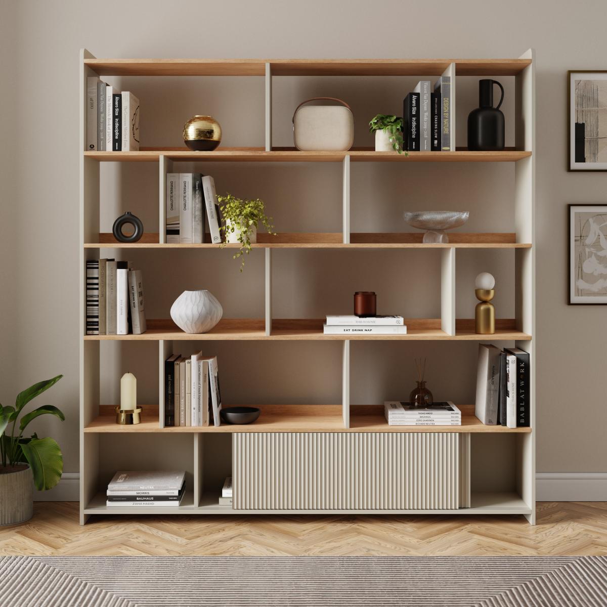 * Ribbed detail design* Softly rounded edges* Subtle matte gold finish legs* 2 spacious cupboards* Full assembly required Upgrade your space with our extra-wide bookcase, expertly designed to combine style with exceptional storage capacity. This spacious bookcase features several open shelves, providing ample room to showcase your favourite books, décor, and personal treasures, making it an eye-catching focal point in any room. The lower section includes sleek sliding drawer cabinets, offering concealed storage to keep your space organised and free from clutter.