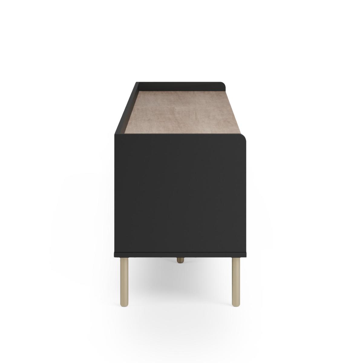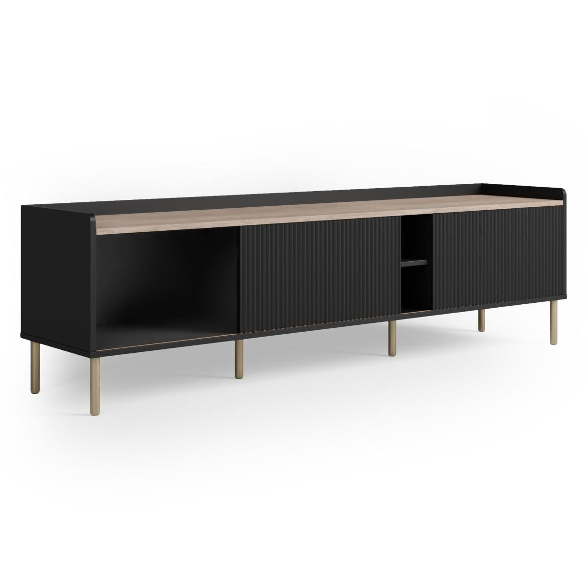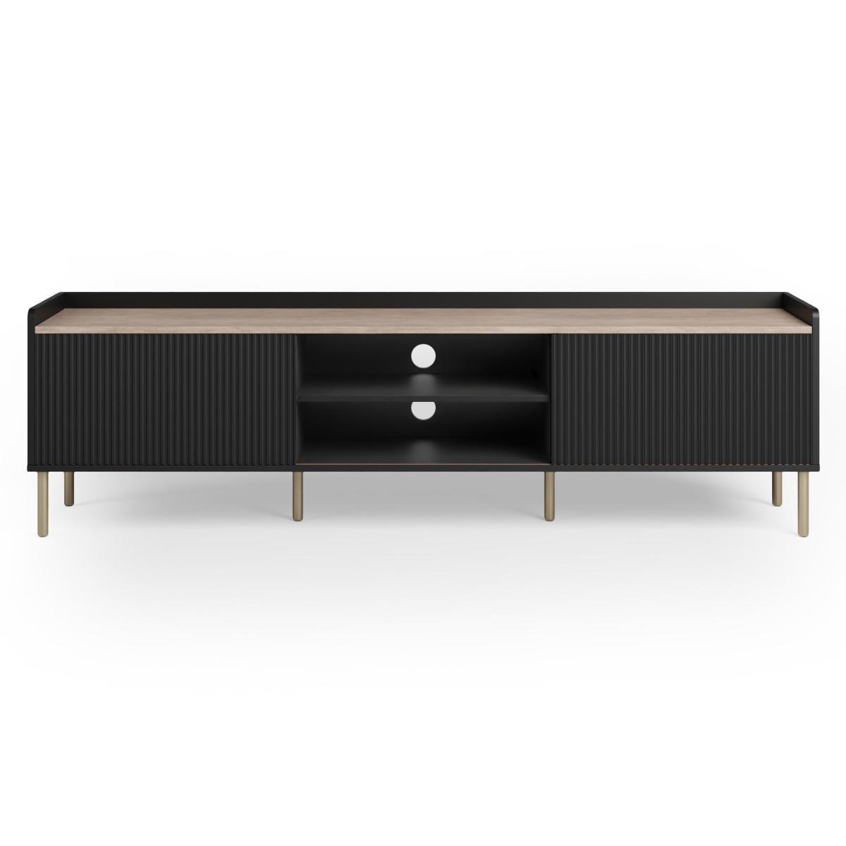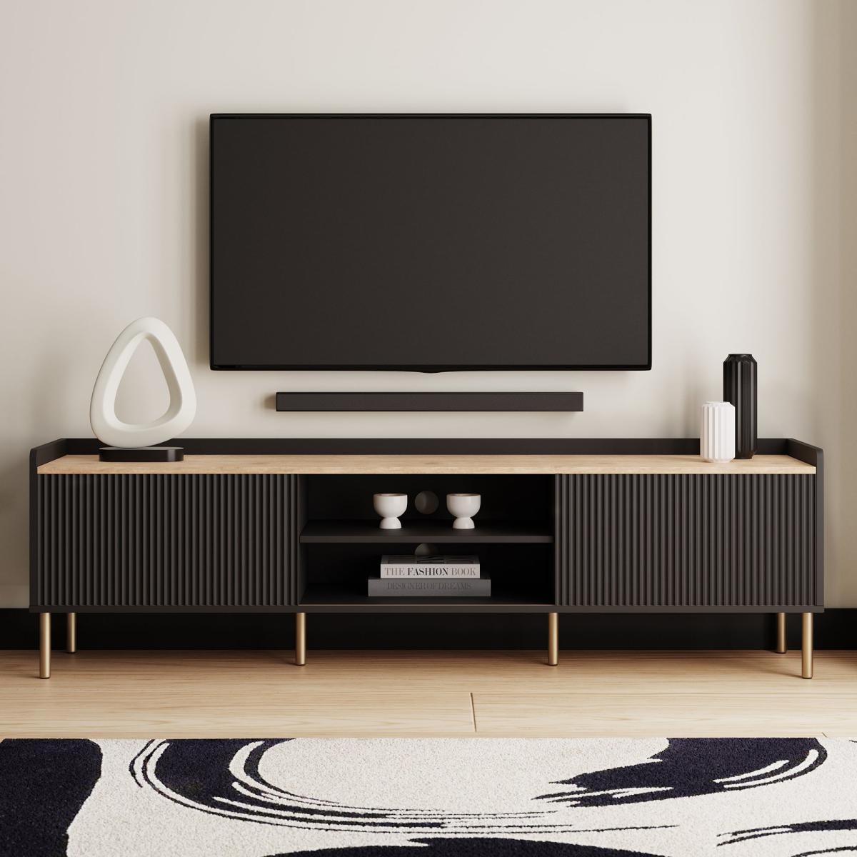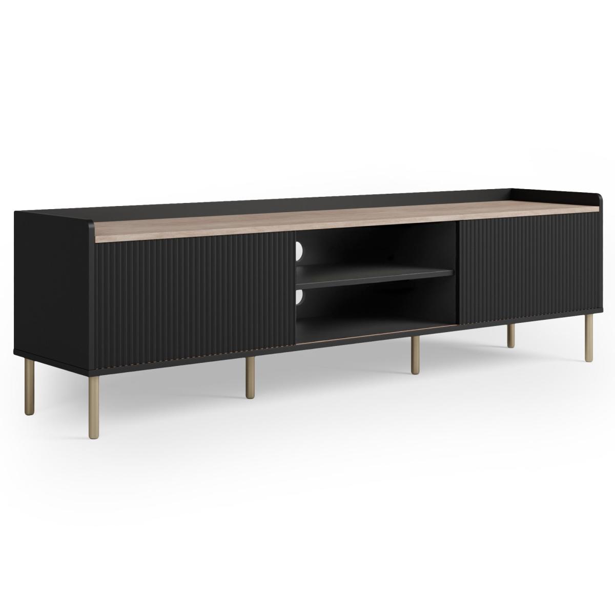 I love how this extra-wide Georgi unit anchors a room with its subtle fluting and brass-toned legs - it brings just the right balance of texture and polish. Its low, linear profile works brilliantly in contemporary, Scandi or even pared-back Art Deco schemes, and the middle shelf is perfect for a soundbar or a neat stack of coffee-table books. For styling, keep cables out of sight by routing them through the central opening, then add height on one side with a slim vase or sculptural lamp and balance it with a small pot plant or a stack of trays on the other. Choose soft metallic accents or muted ceramics to tie in with the black finish without overwhelming the unit.