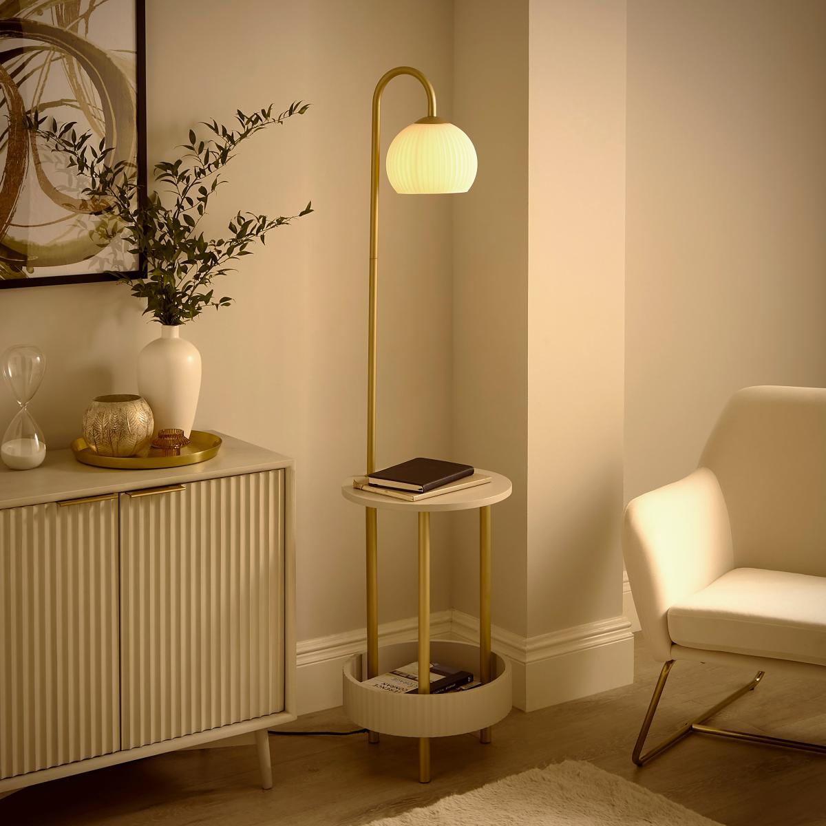 * Gorgeous, Modern Design* Made from Wood & Glass* 2 Functional Shelves* Required Cap Type: ES E27* Required Bulb:Globe Both glam and modern, this Georgi Shelved Floor Lamp comes complete with two functional shelves and is finished with a sleek, frosted glass shade.