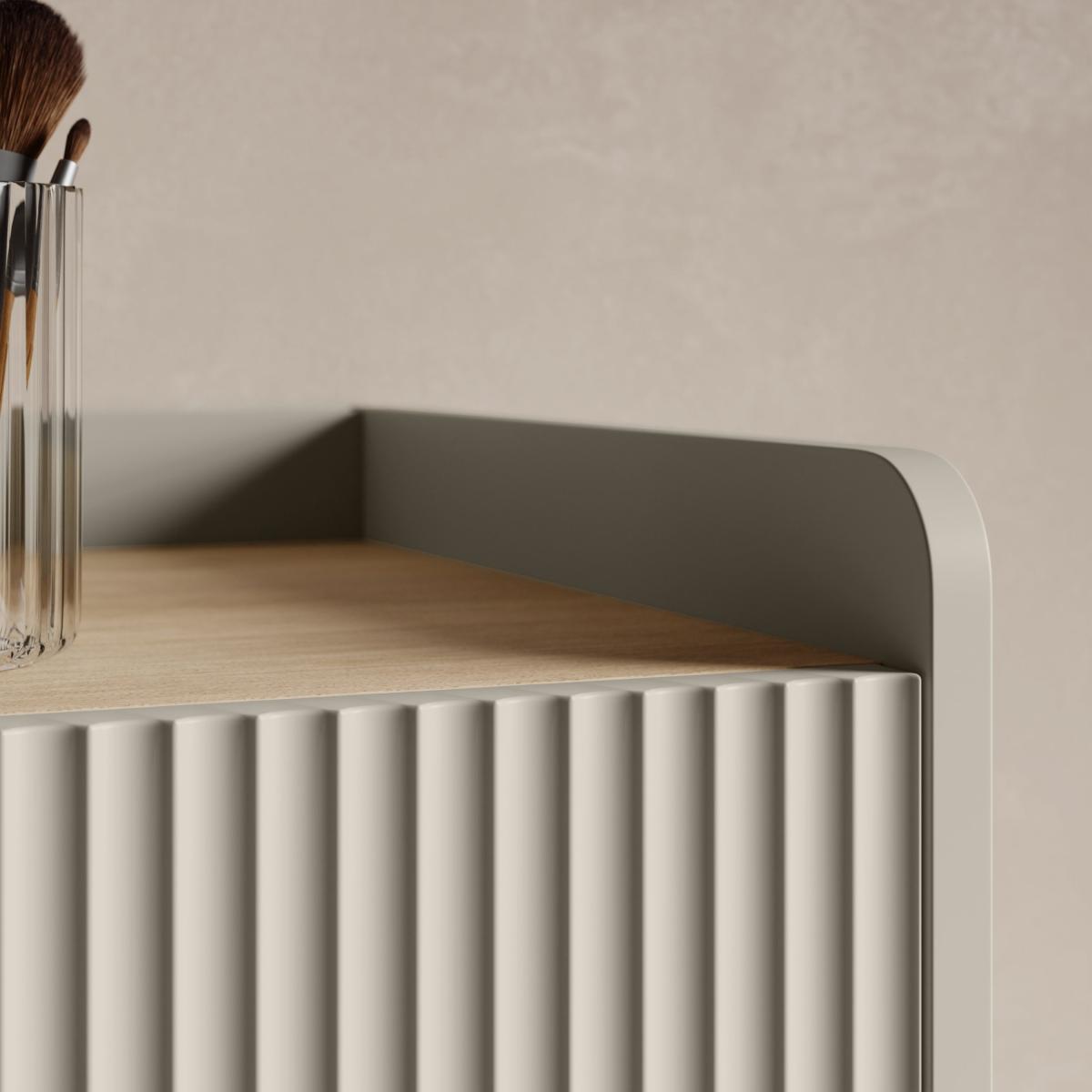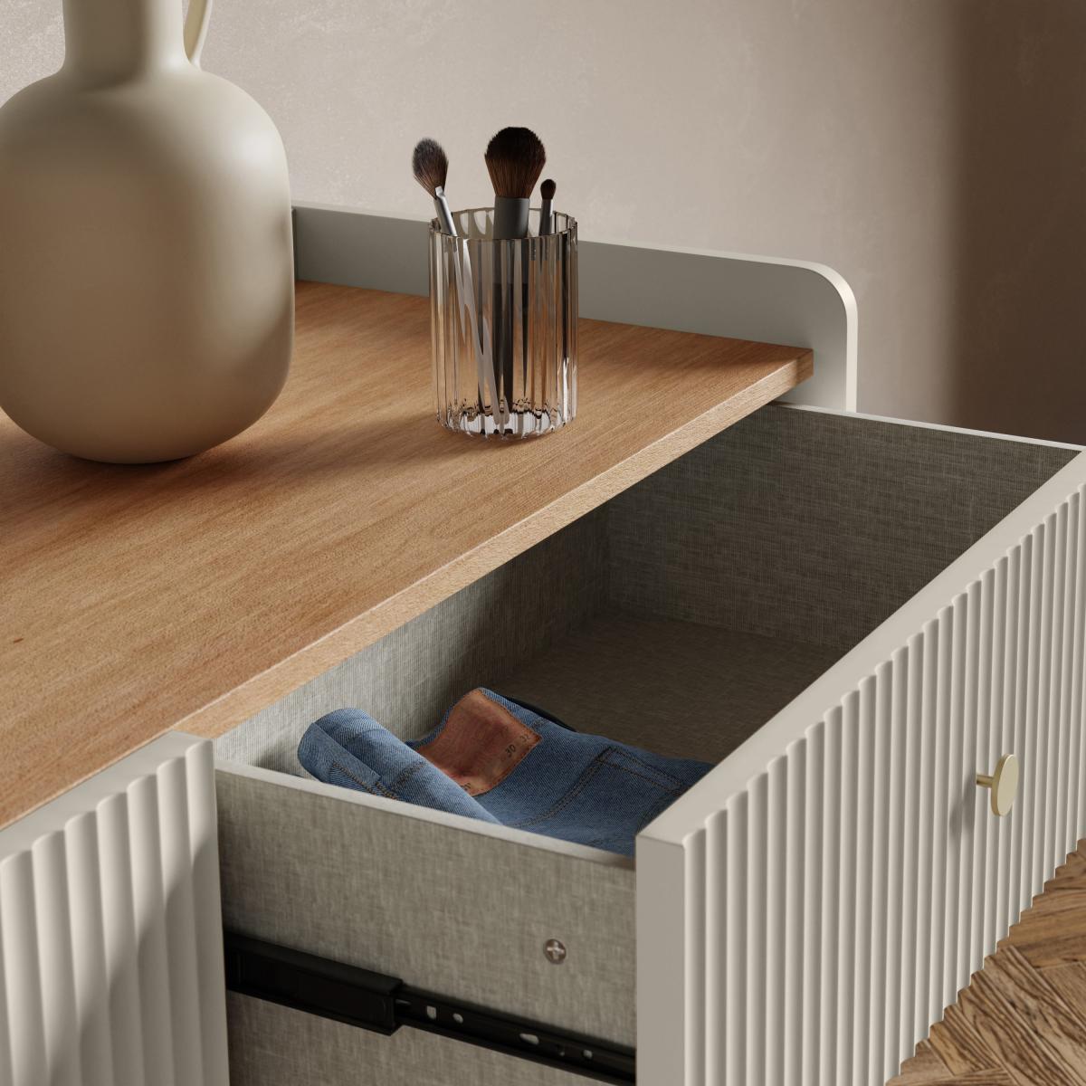 I love how the Georgi chest’s fluted front and slim brass legs bring subtle texture and a light, airy feel to a room. Its warm neutral finish works equally well in Scandi-inspired, mid-century or contemporary schemes, making it a versatile storage piece for a bedroom, hallway or living area. On the top, keep styling straightforward: a low-profile lamp or a sculptural vase, a single framed print or mirror to reflect light, and a neat stack of books. Tuck woven baskets or a couple of fabric boxes underneath to contain smaller items and maintain its clean, uncluttered look.