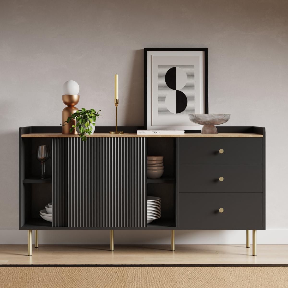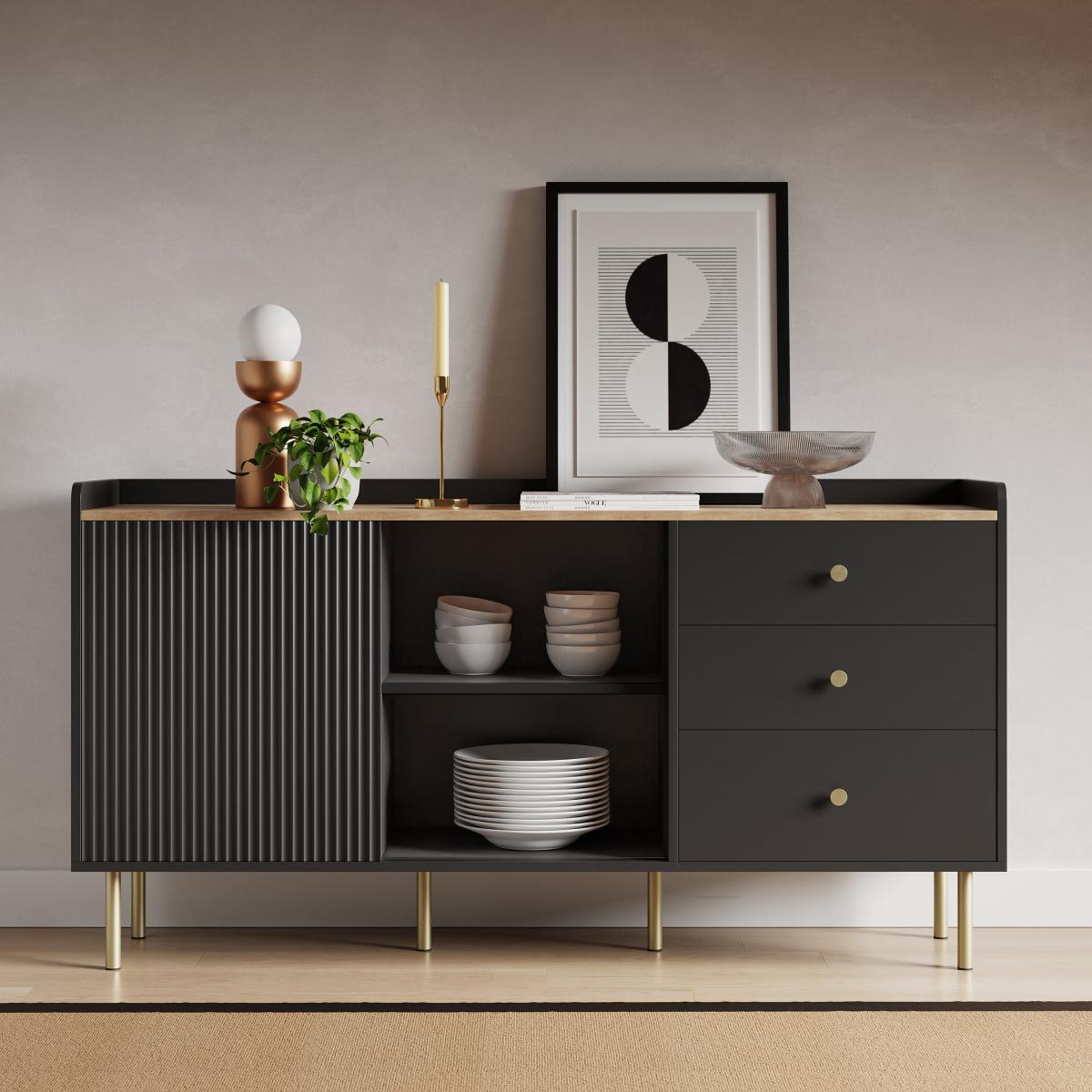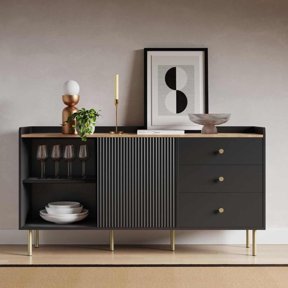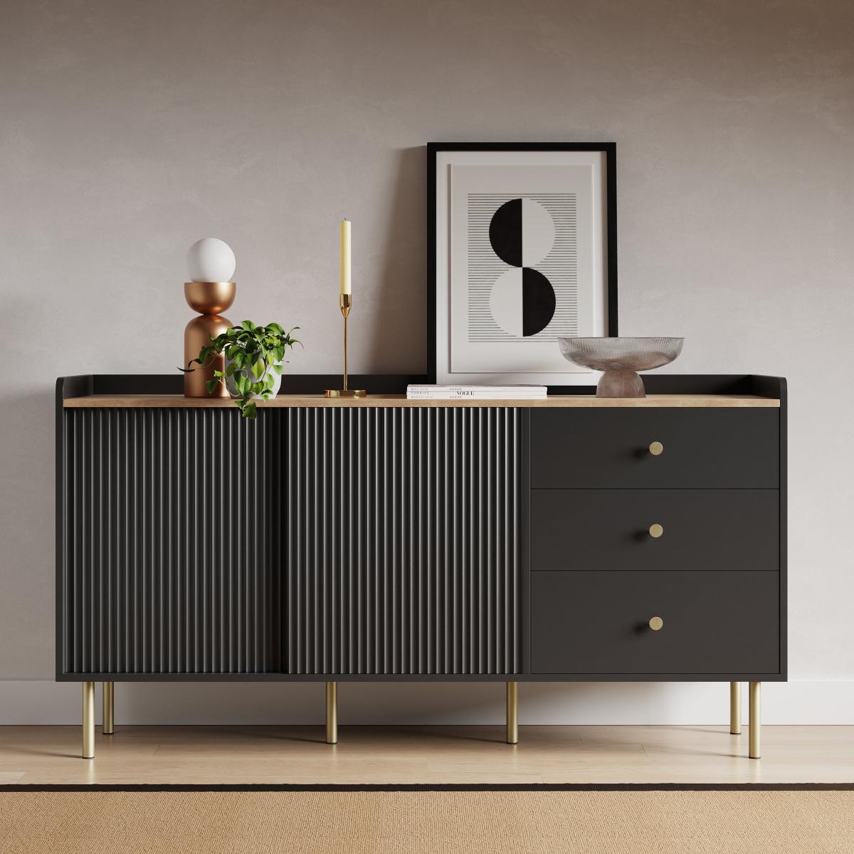 I’m a big fan of this Georgi sideboard for its clean lines and ribbed doors, which suit modern minimalist, Scandinavian or urban-industrial settings. The matt black finish paired with slim brass legs brings a refined edge without overwhelming the room, so it works equally well in a living space, dining area or hallway. Styling-wise, keep the top simple: lean a monochrome print against the wall, add a sculptural vase and a single brass candlestick. Inside, use the shelves to hide dinnerware, glassware or office essentials. A trailing plant in a pale stone pot softens the look and introduces a natural contrast against the dark finish.