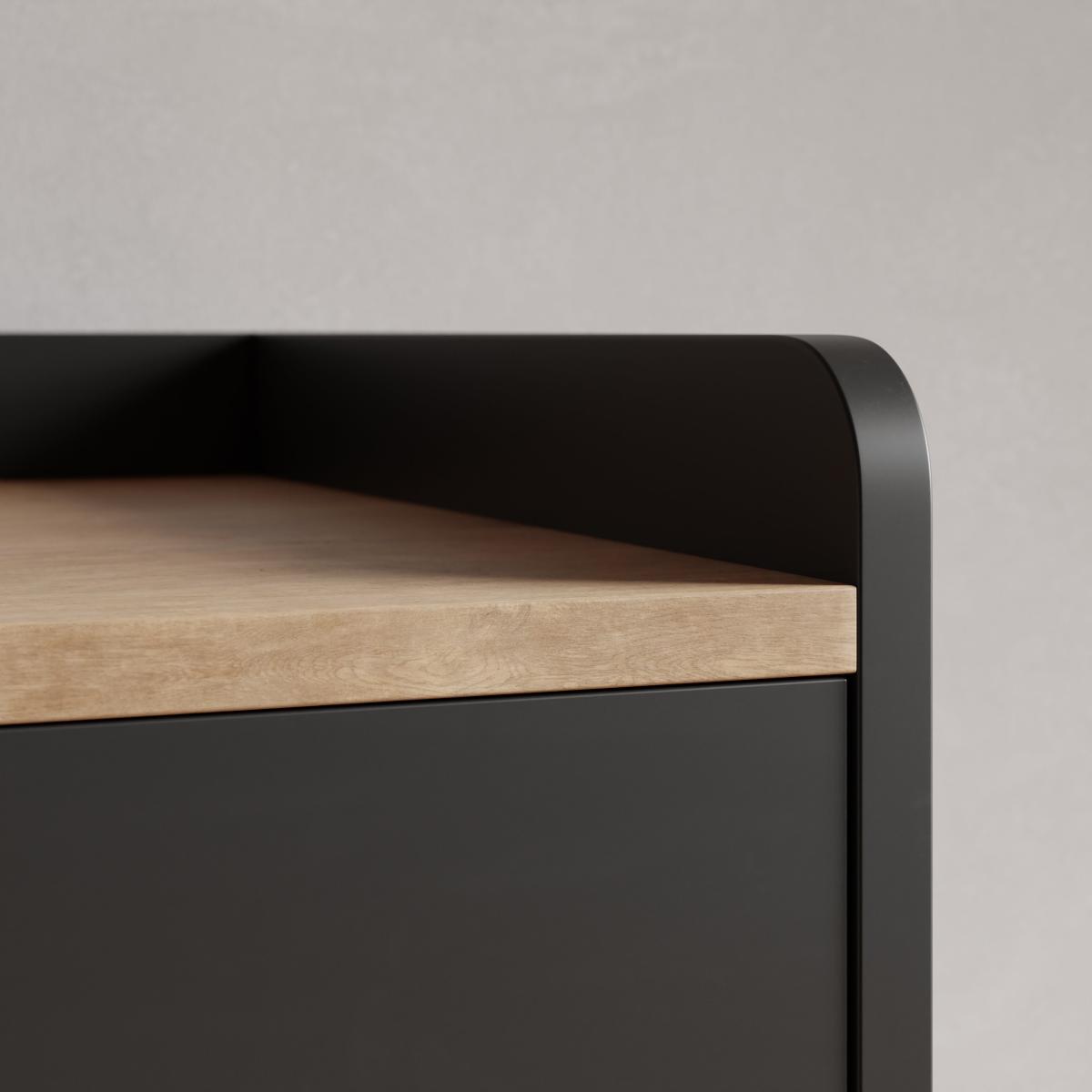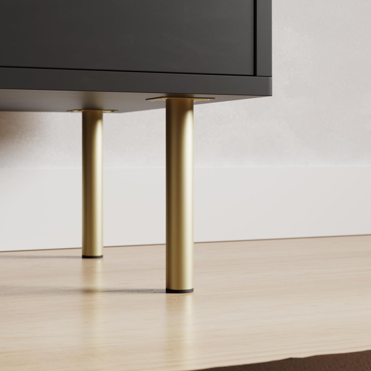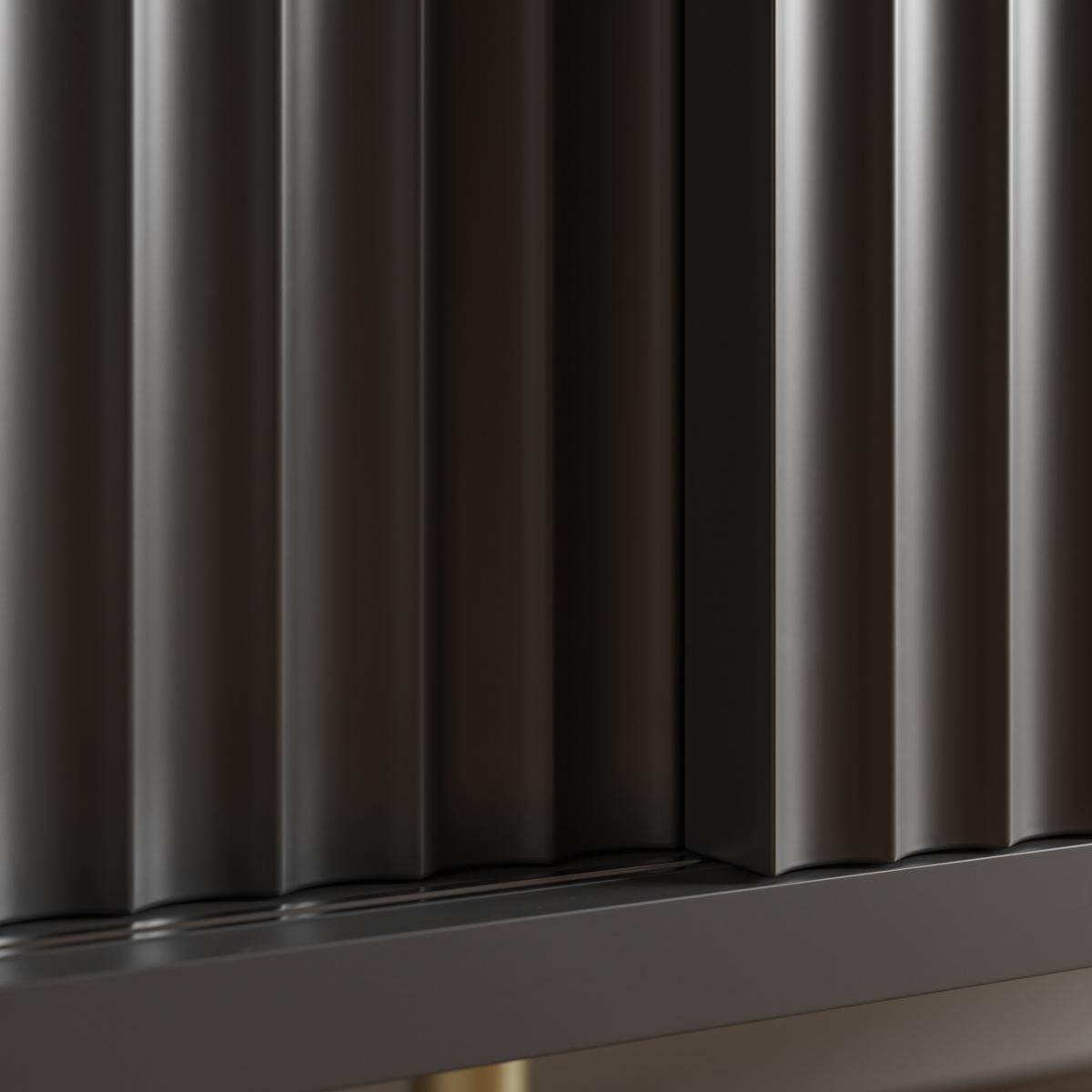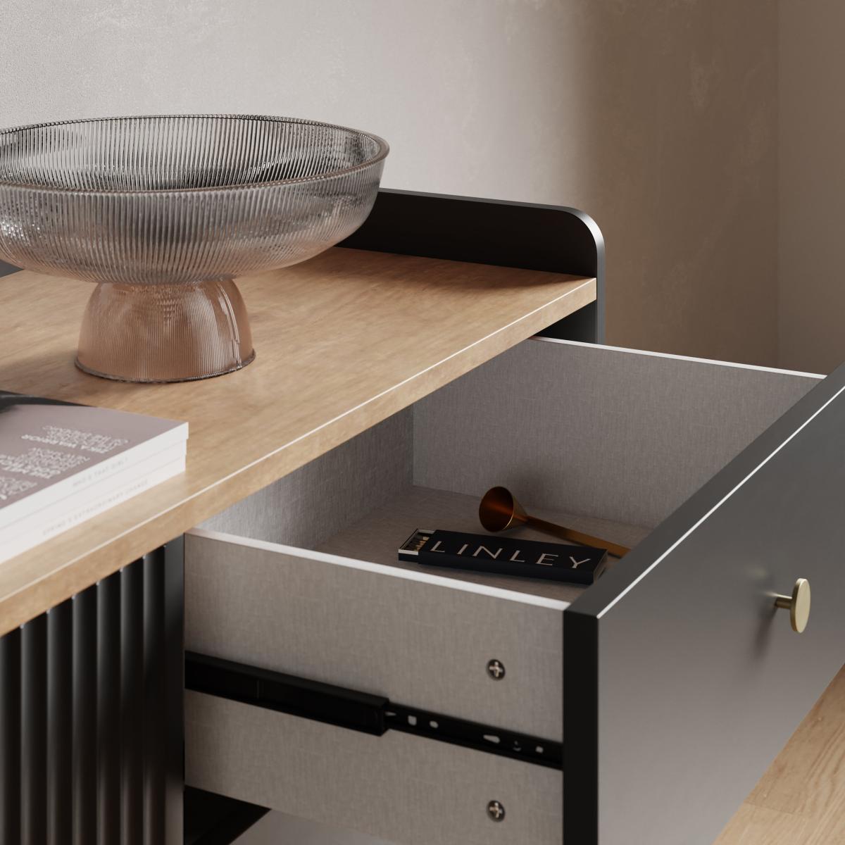 I’m a big fan of this Georgi sideboard for its clean lines and ribbed doors, which suit modern minimalist, Scandinavian or urban-industrial settings. The matt black finish paired with slim brass legs brings a refined edge without overwhelming the room, so it works equally well in a living space, dining area or hallway. Styling-wise, keep the top simple: lean a monochrome print against the wall, add a sculptural vase and a single brass candlestick. Inside, use the shelves to hide dinnerware, glassware or office essentials. A trailing plant in a pale stone pot softens the look and introduces a natural contrast against the dark finish.