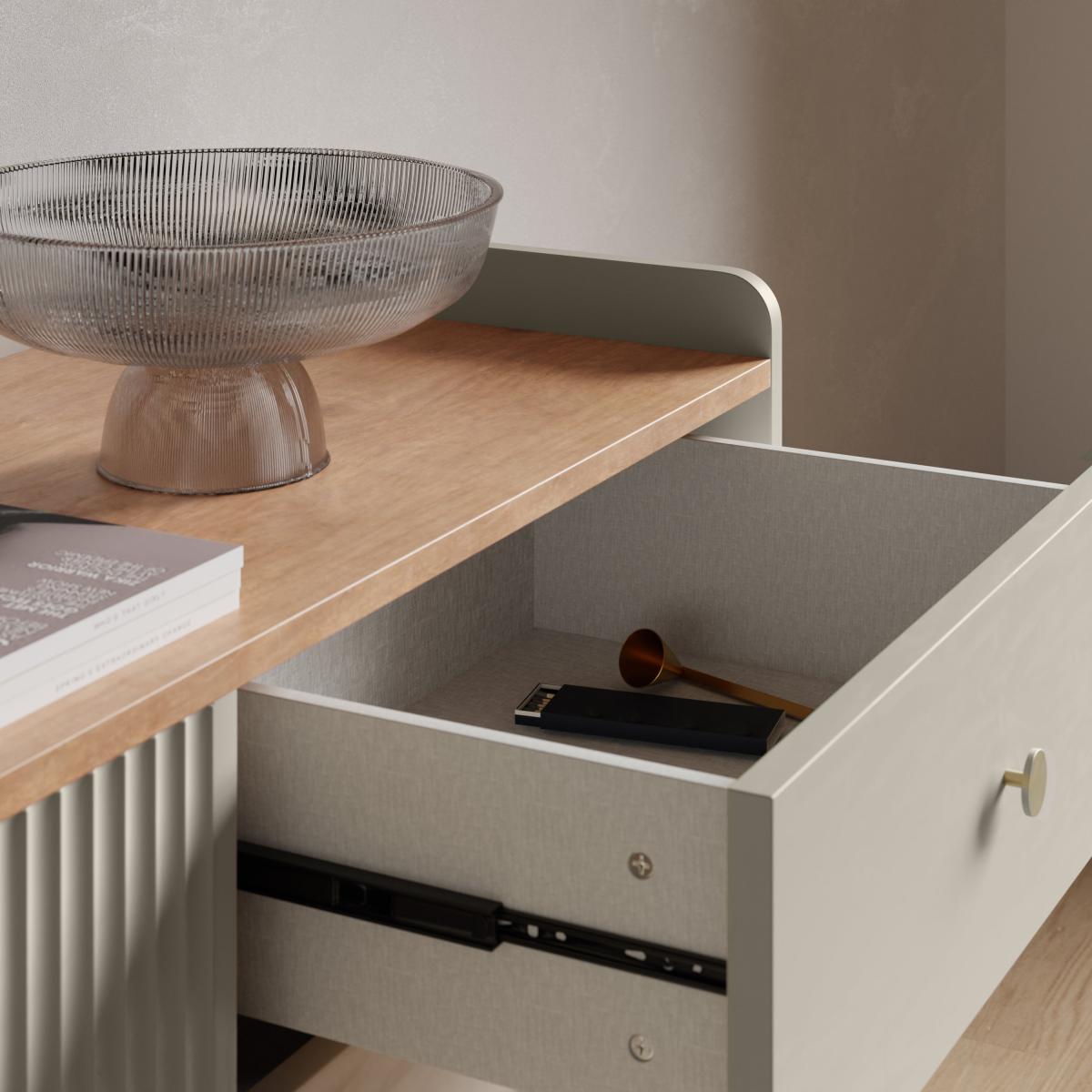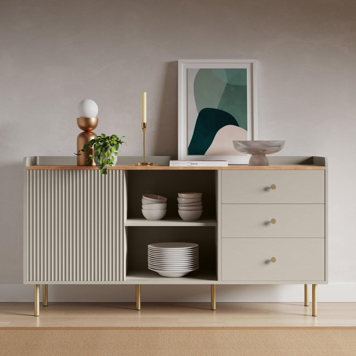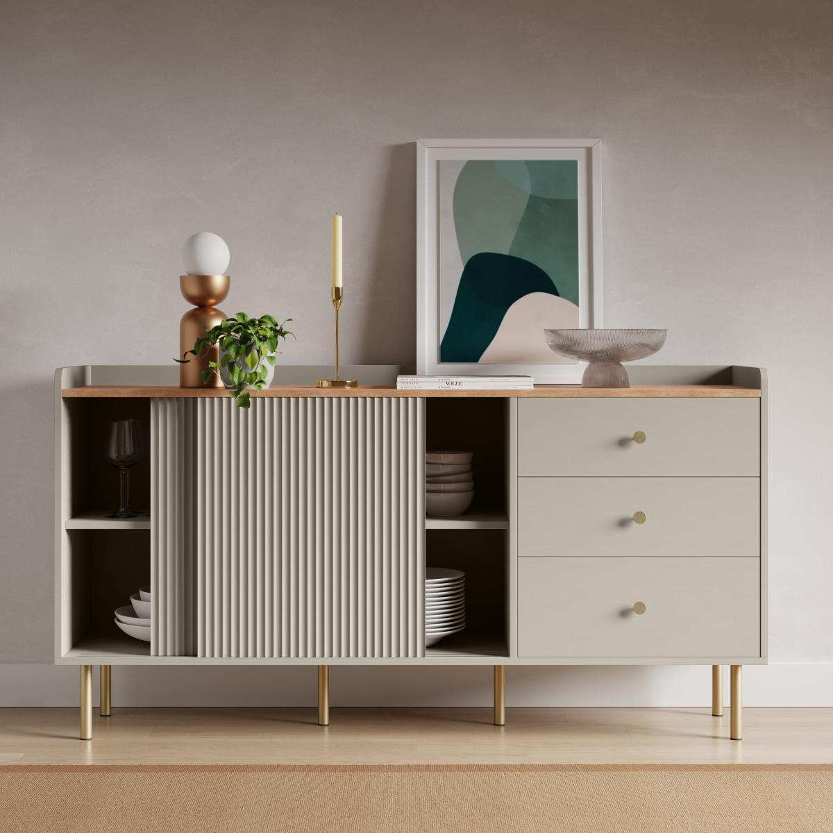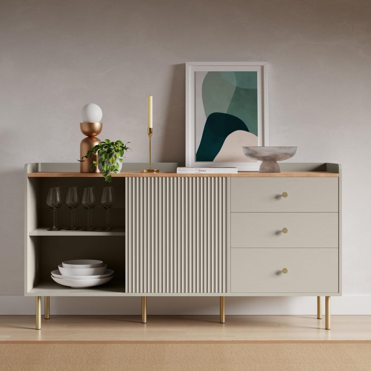 I’m a fan of the Georgi sideboard in Natural for its clean lines and versatile finish - the subtle fluting on the doors adds texture without overwhelming a space. It works equally well in Scandi-inspired living rooms, contemporary hallways or even a minimalist dining area. To style it, keep the top surface uncluttered with just two or three statement pieces: a low ceramic planter, a slim metallic candlestick and a framed abstract print casually leaning against the wall. Inside, use uniform storage boxes or baskets to corral essentials and maintain that streamlined look.