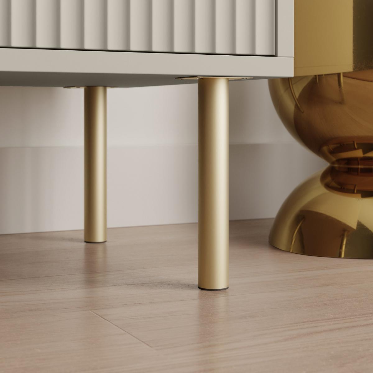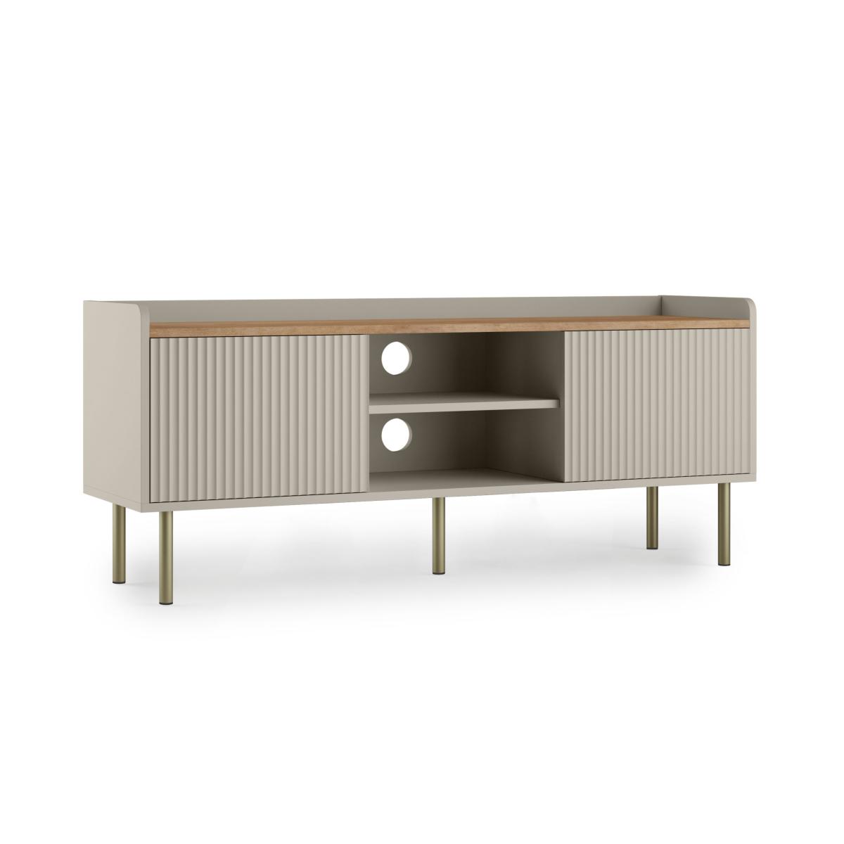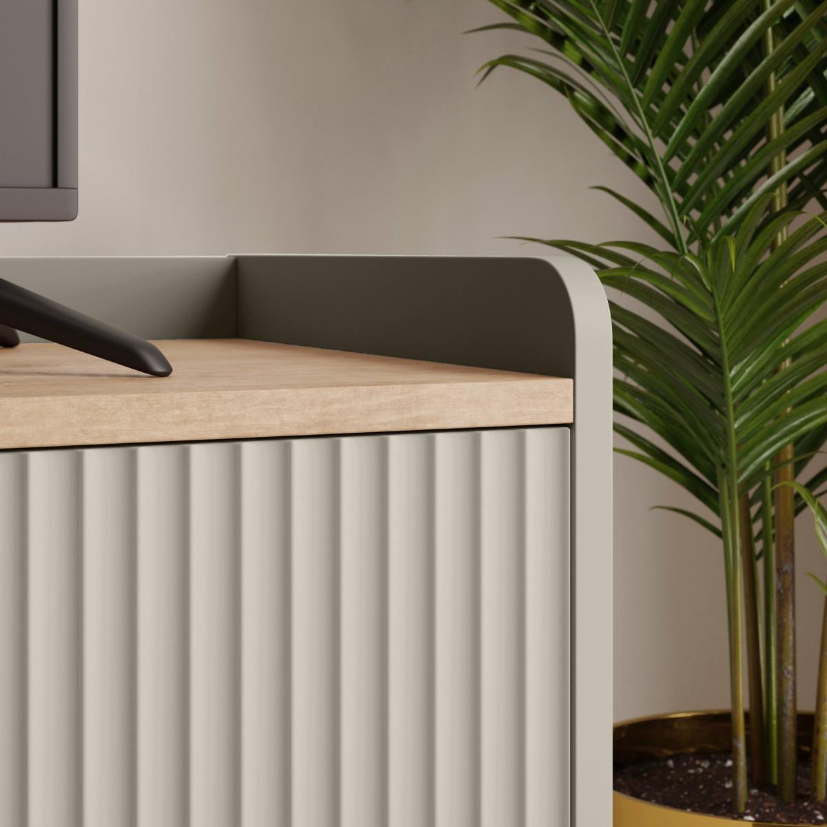 Style meets functionality with the Georgi Wide TV Unit. The ribbed detail design adds a touch of elegance, while the painted finish with a light oak effect top and trim brings a natural charm to your space. The matte gold finish handles and legs provide a luxurious touch. With sliding doors and a compact size, this TV unit is perfect for maximising space without compromising on style.