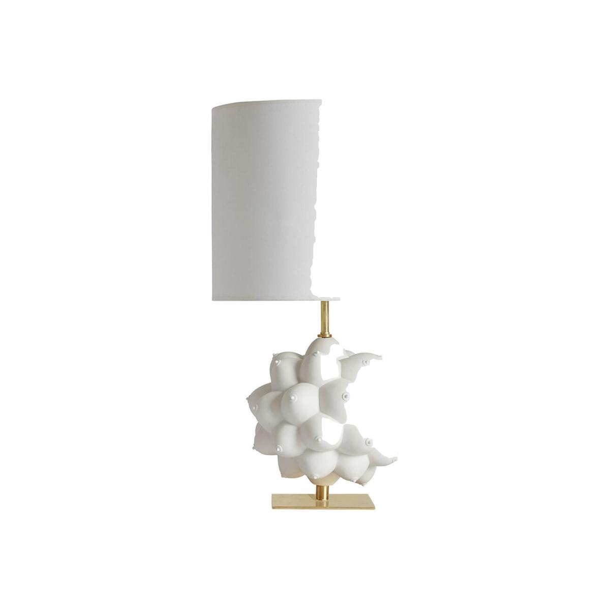 The Georgia Table Lamp by Jonathan Adler is an exquisite piece of art that celebrates creativity in every direction. This beautiful lamp features a cluster of perfectly shaped forms that are crowned with a white paper shade, creating a mesmerizing orb that sits beautifully on a sturdy brass base. This lamp is inspired by the famous American artist Georgia O'Keeffe.