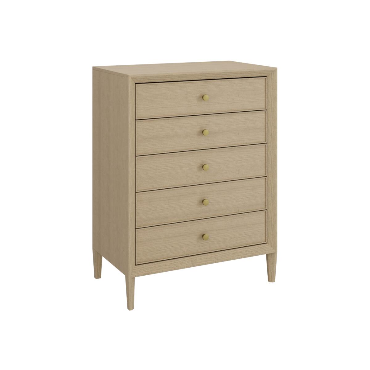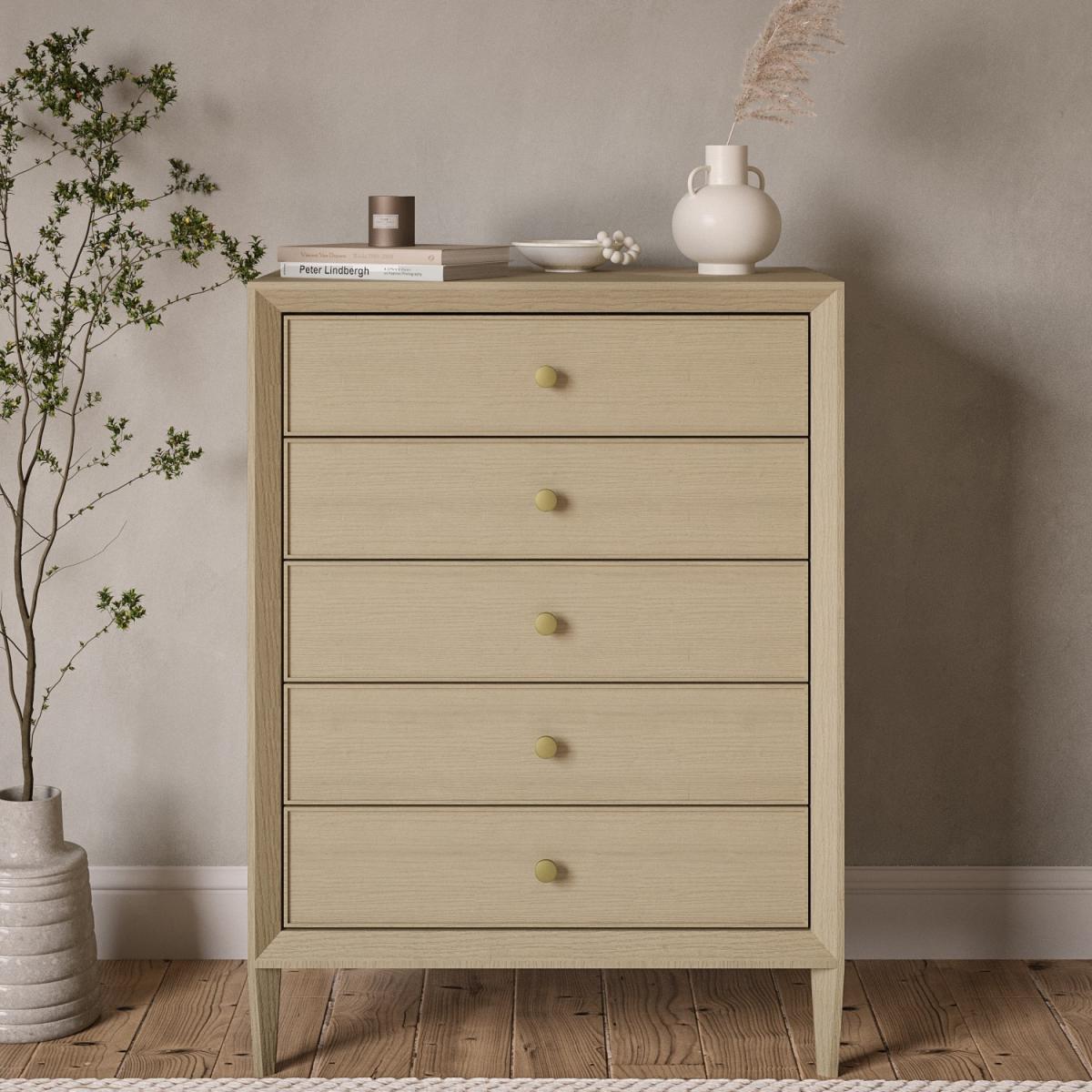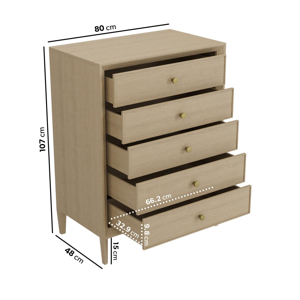 All about me Elevate your space and keep clutter at bay with the Georgie chest of drawers. It features a modern design with clean, square lines and a wooden finish, it'll suit any bedroom style. The five drawers are perfect for storing folded clothes and accessories. Need to know Dimensions: W80 x D48 x H107 cm Drawer dimensions:W66.2 x D32.9 x H9.8 cm Number of drawers: 5 Weight: 39 kg Colour: Oak Finish: Stained Material:Solid pine Runners: Metal Assembly required: Yes Packed dimensions: W99 x D117 x H16.4 cm