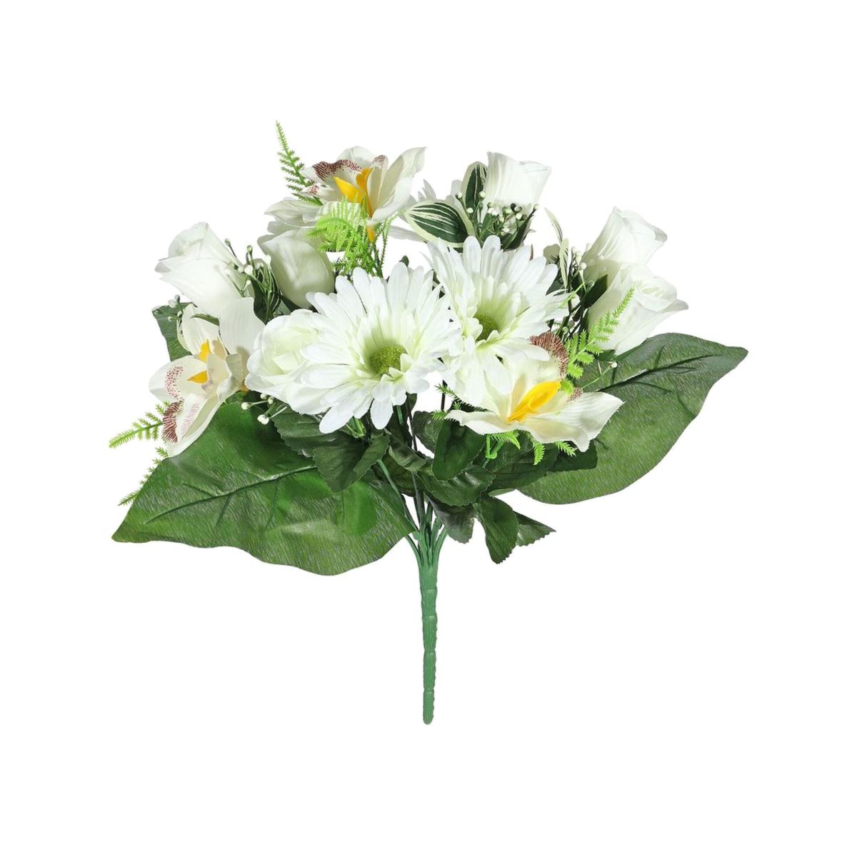 Expertly arranged within the bunch, you will find luscious cream gerberas as well as delicate white orchids that are incredibly lifelike - a perfect combination for creating an atmosphere of warmth and joy. With brightening accents of gold, this flower arrangement is sure to be a timeless addition to your decor.